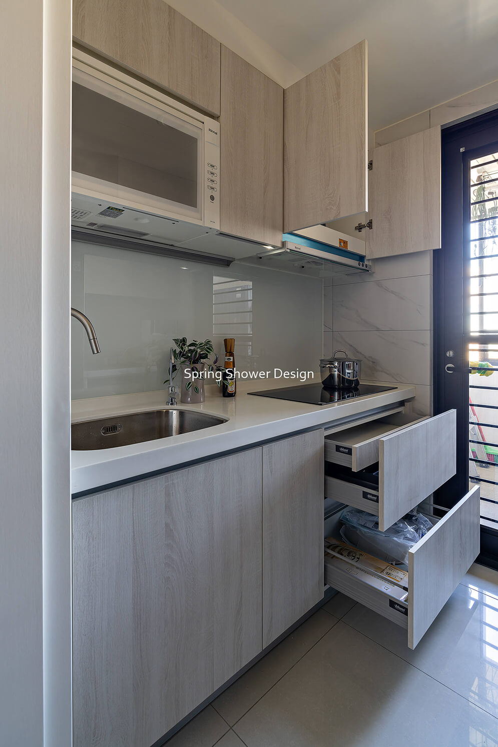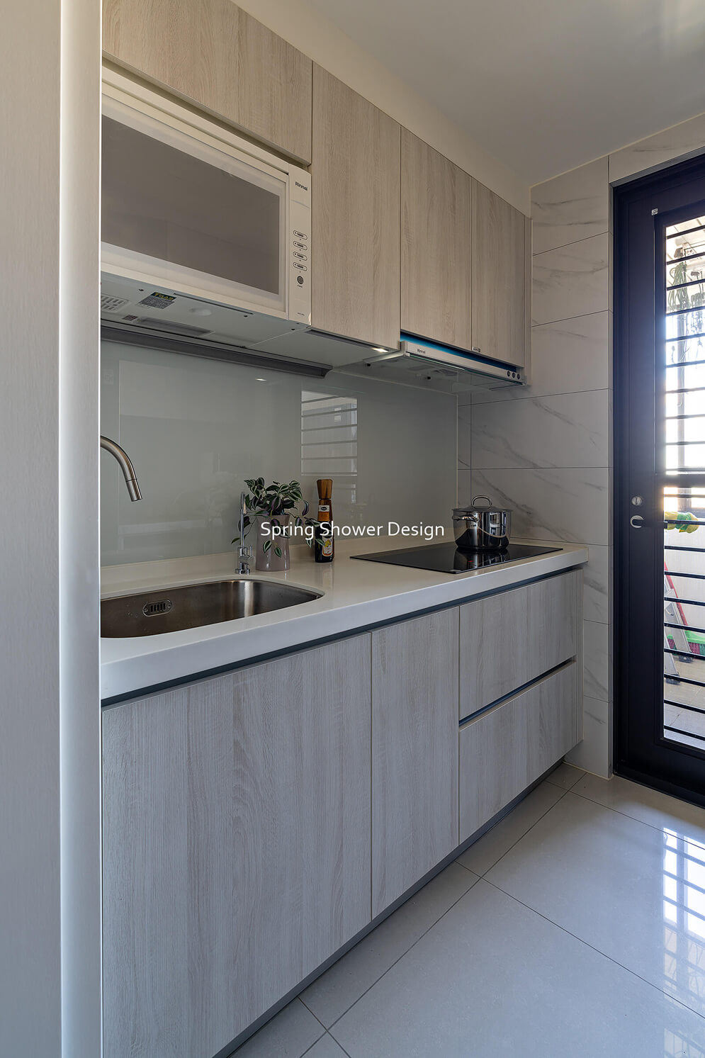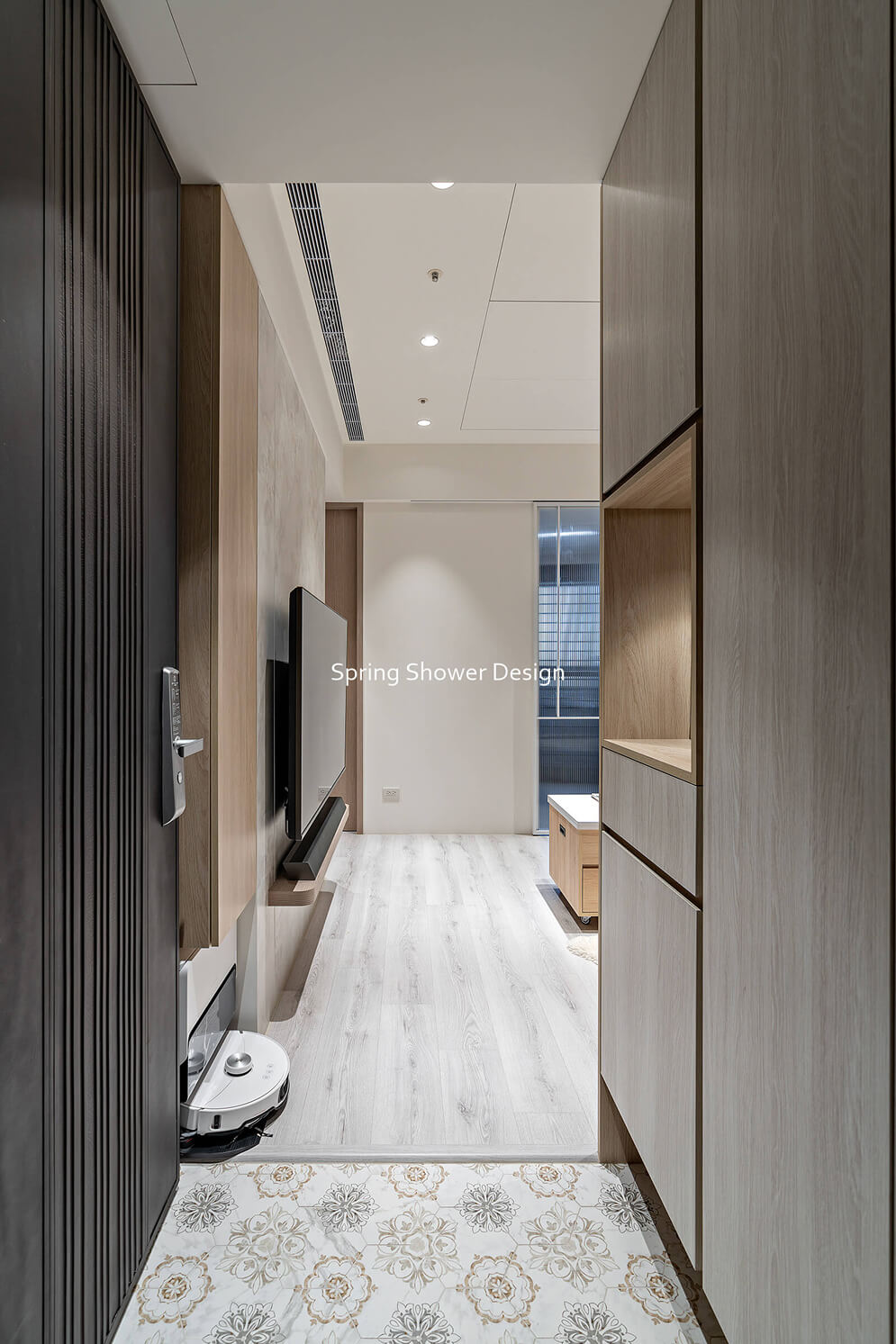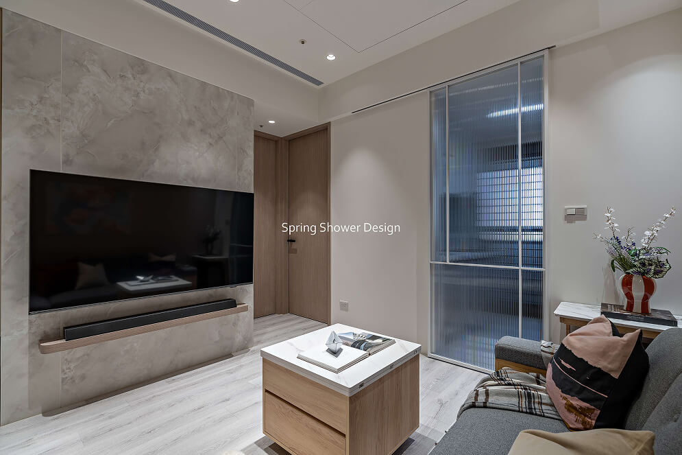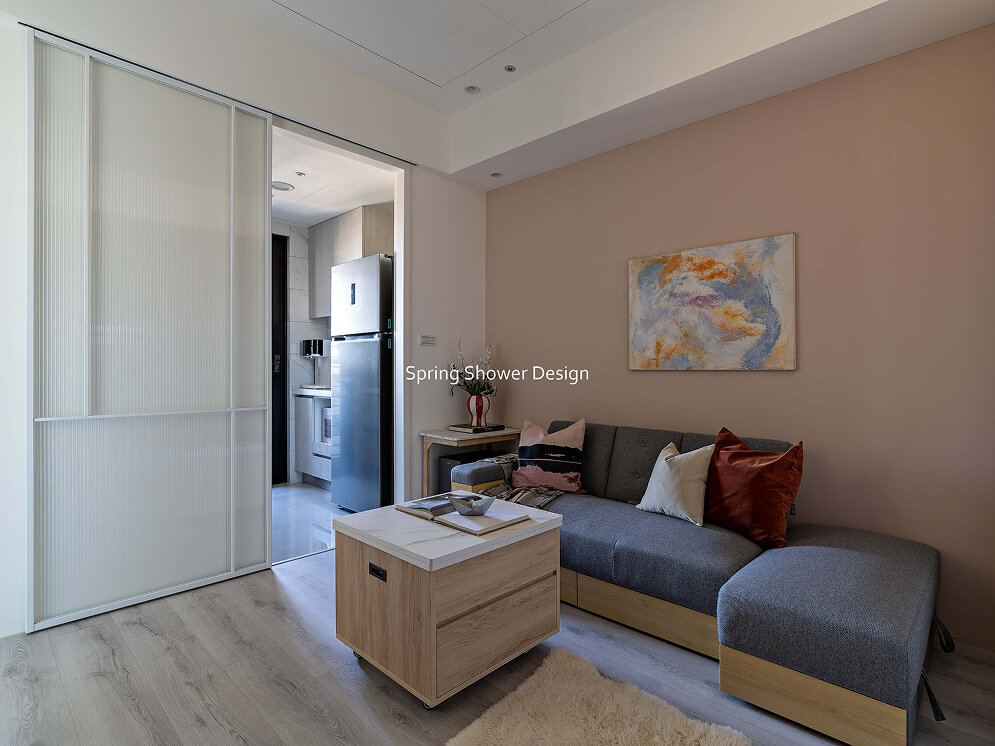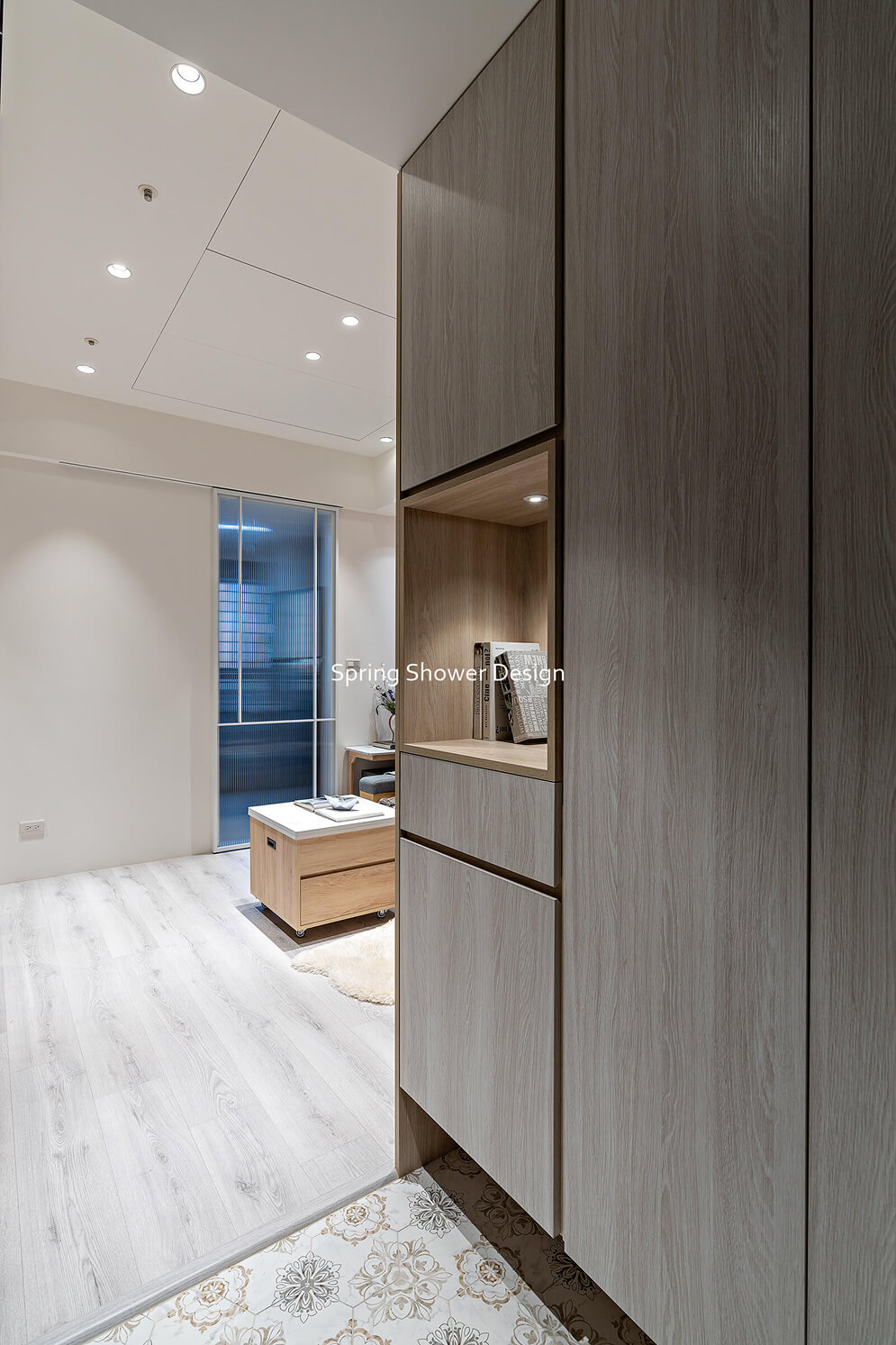 12.6坪的家,要住夫妻和一個就讀小學的兒子,一家三口。屋主在預售屋客變階段就找春雨團隊合作,我們調整了電視牆的位置,讓小孩房能多出一組衣櫃,並利用玄關轉角設計收納櫃,讓小坪數空間發揮到最大坪效。