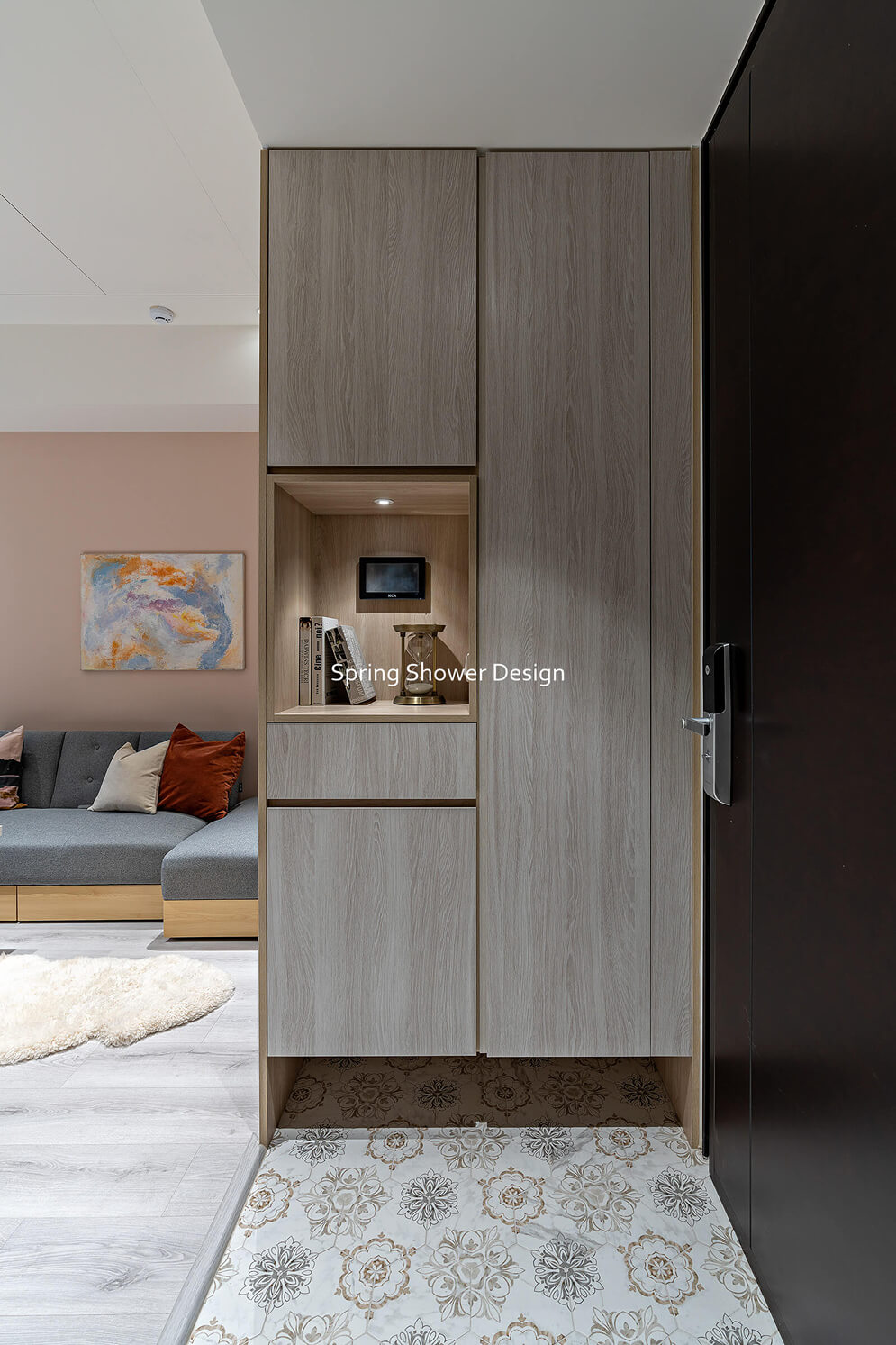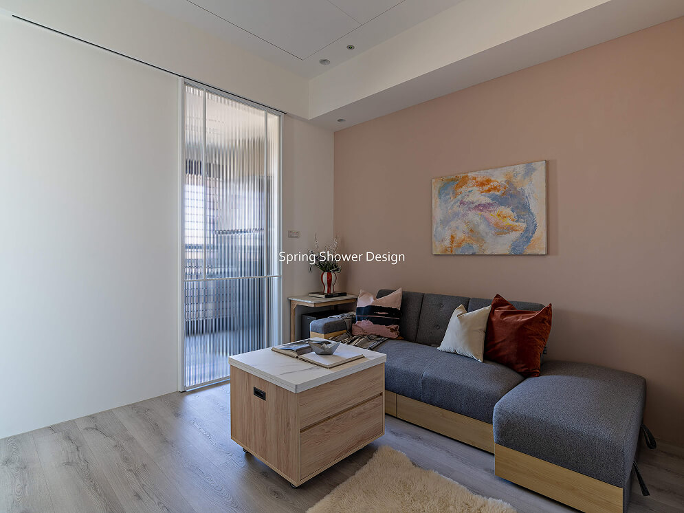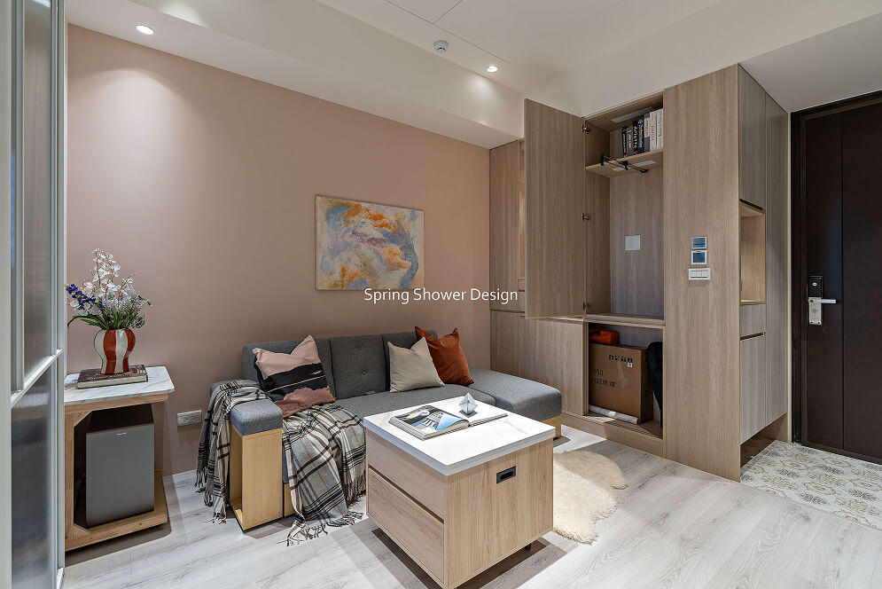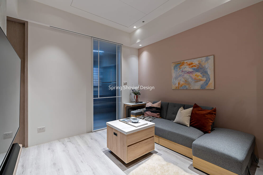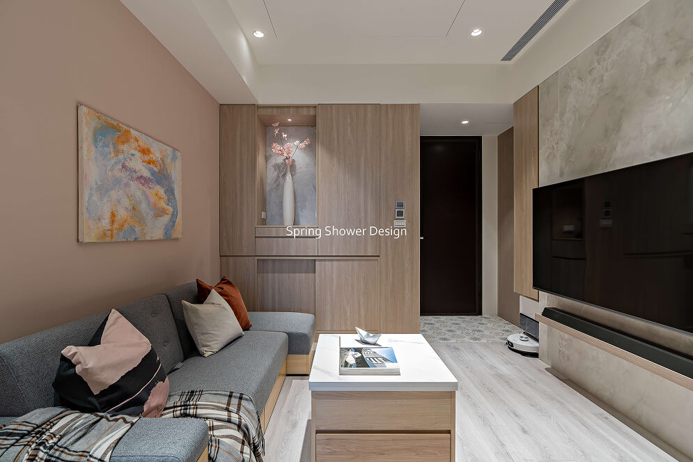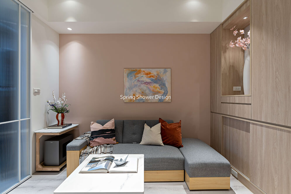 公共空間以淡粉色搭配木紋,營造溫暖氛圍;從玄關轉折到客廳的「L型組織收納」,透過雙面櫃結合開放格,讓每個面向都順手好用。延伸側面則滿足屋主需求,規劃了「神明桌設計」,並挑選石紋背板,與整體空間風格完美融合。電視牆使用「淺灰白石紋美耐板」,增添現代感並點亮空間。廚房門改為長虹玻璃拉門,讓光線延伸至客廳,增添通透感。