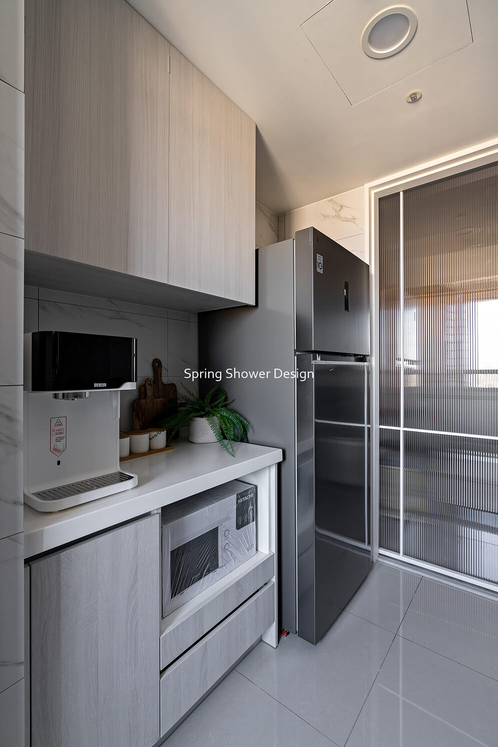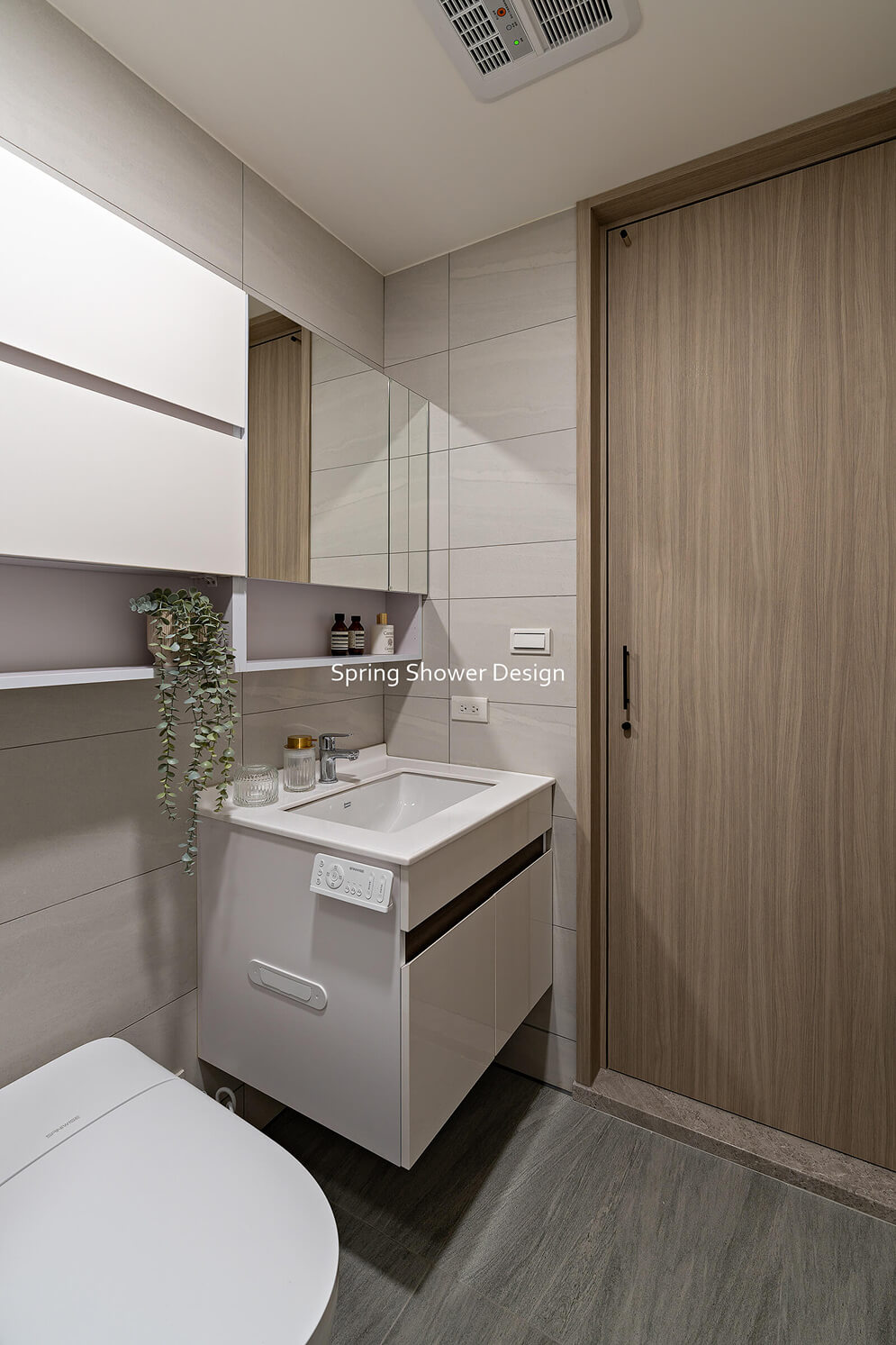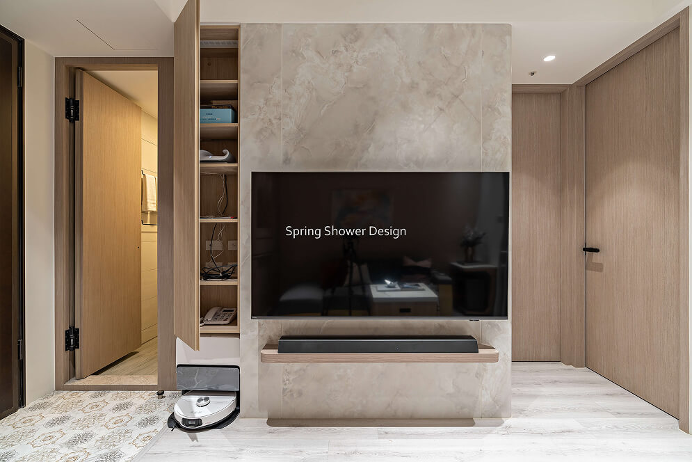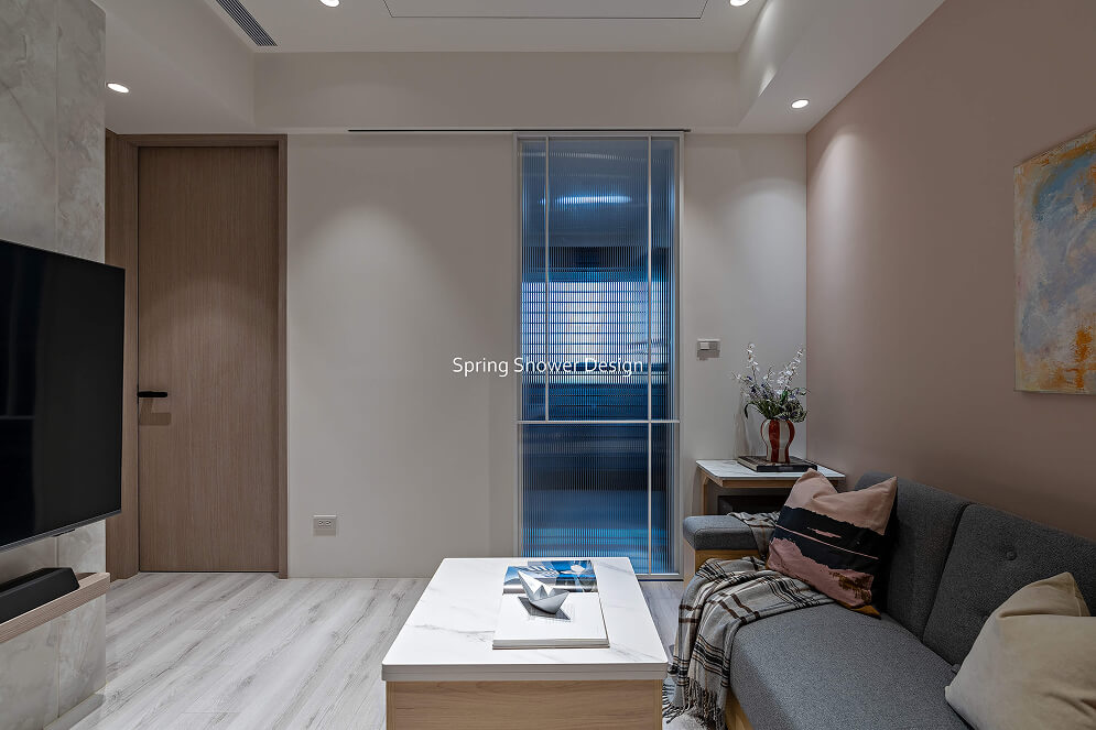 公共空間以淡粉色搭配木紋,營造溫暖氛圍;從玄關轉折到客廳的「L型組織收納」,透過雙面櫃結合開放格,讓每個面向都順手好用。延伸側面則滿足屋主需求,規劃了「神明桌設計」,並挑選石紋背板,與整體空間風格完美融合。電視牆使用「淺灰白石紋美耐板」,增添現代感並點亮空間。廚房門改為長虹玻璃拉門,讓光線延伸至客廳,增添通透感。