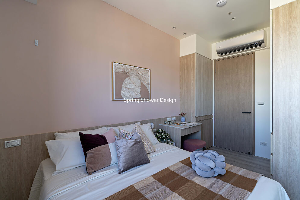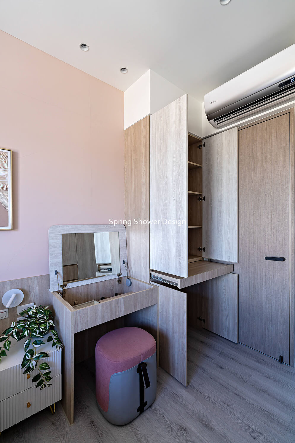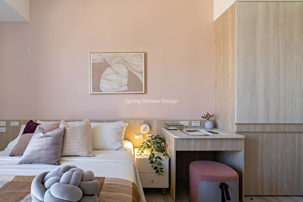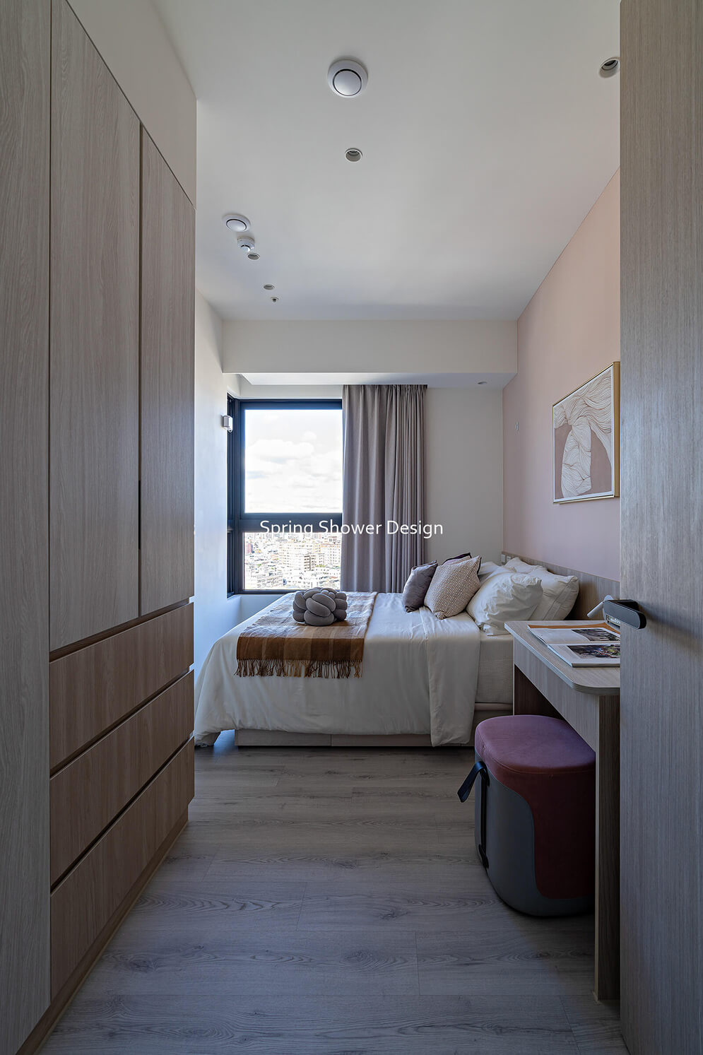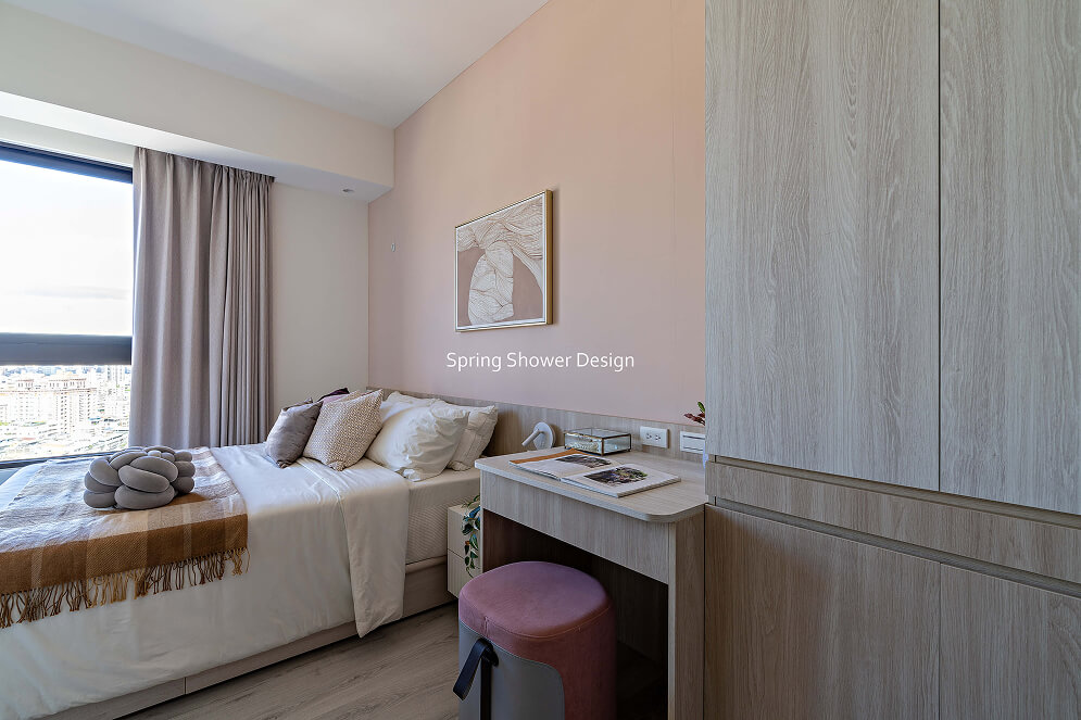 主臥室規劃「大衣櫃+上掀式化妝桌」,同時滿足收納、照明與摺衣動線;小孩房則預留雙人床、書桌插座與展示櫃,陪伴孩子一路成長。小坪數也能兼顧美感與實用,透過「格局微調+聰明收納」,就能住得舒適又溫馨!
