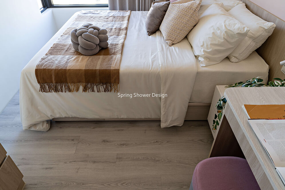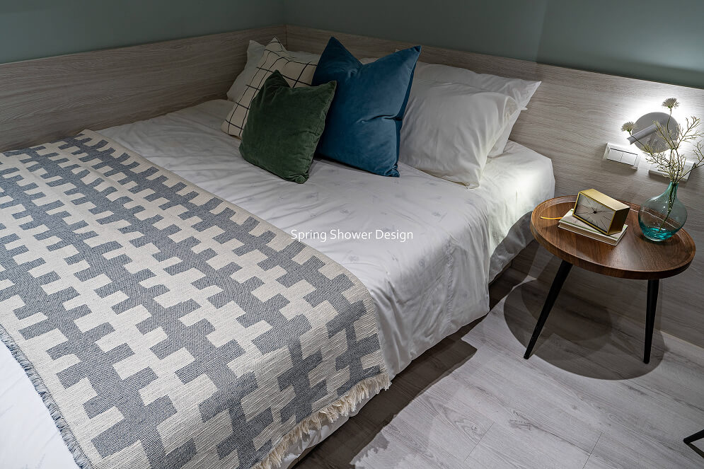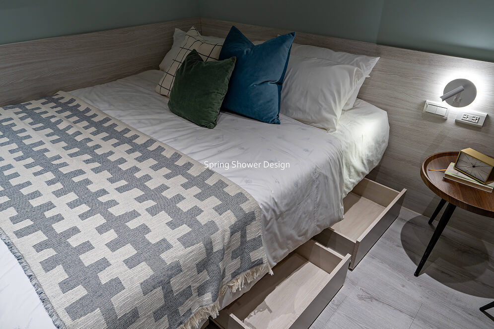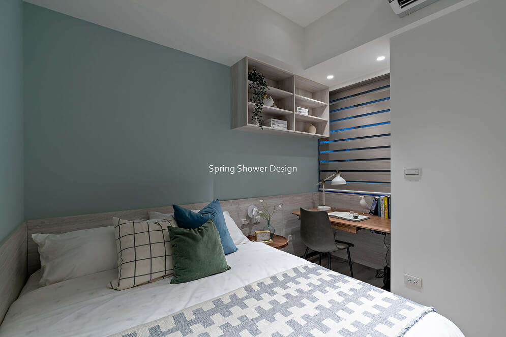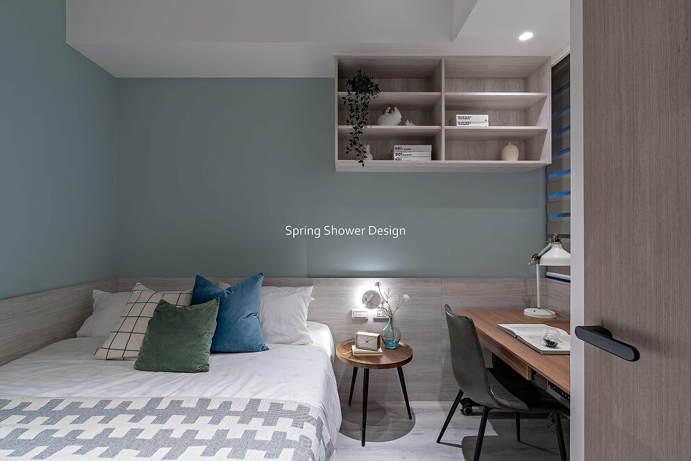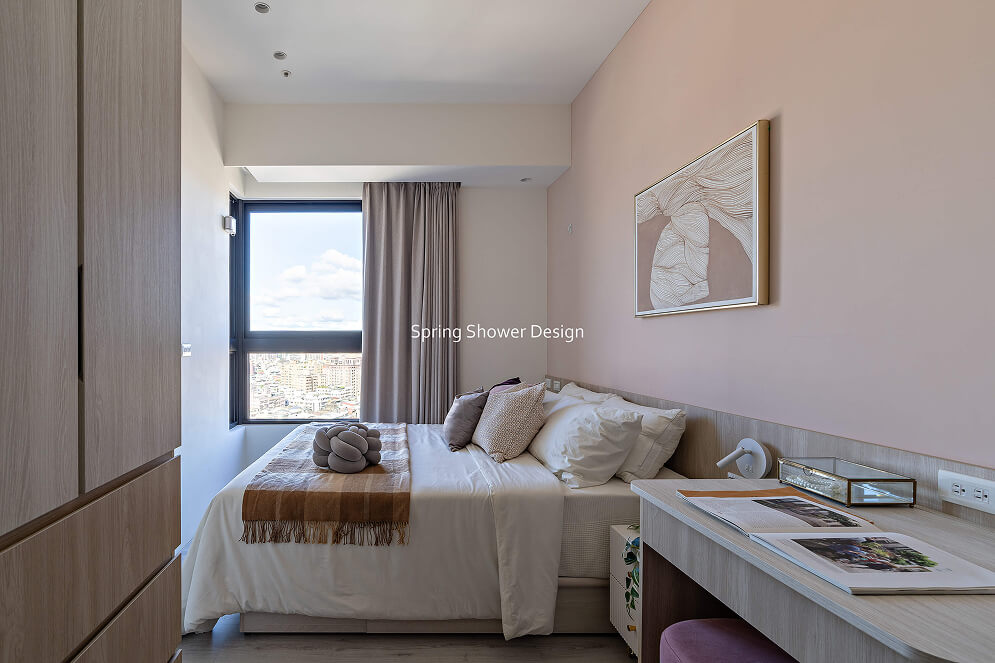 主臥室規劃「大衣櫃+上掀式化妝桌」,同時滿足收納、照明與摺衣動線;小孩房則預留雙人床、書桌插座與展示櫃,陪伴孩子一路成長。小坪數也能兼顧美感與實用,透過「格局微調+聰明收納」,就能住得舒適又溫馨!