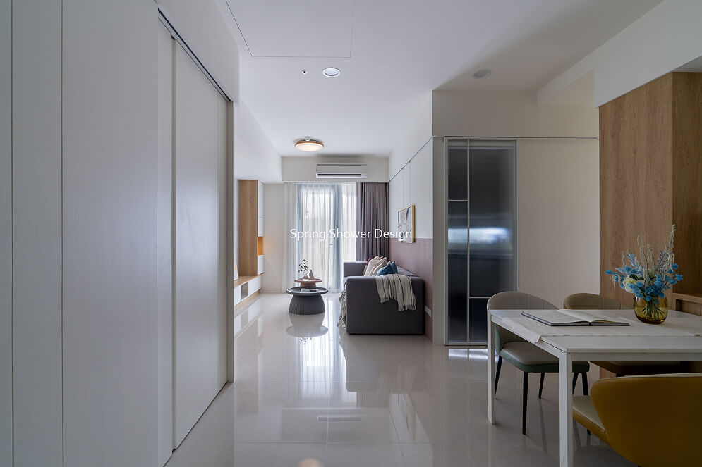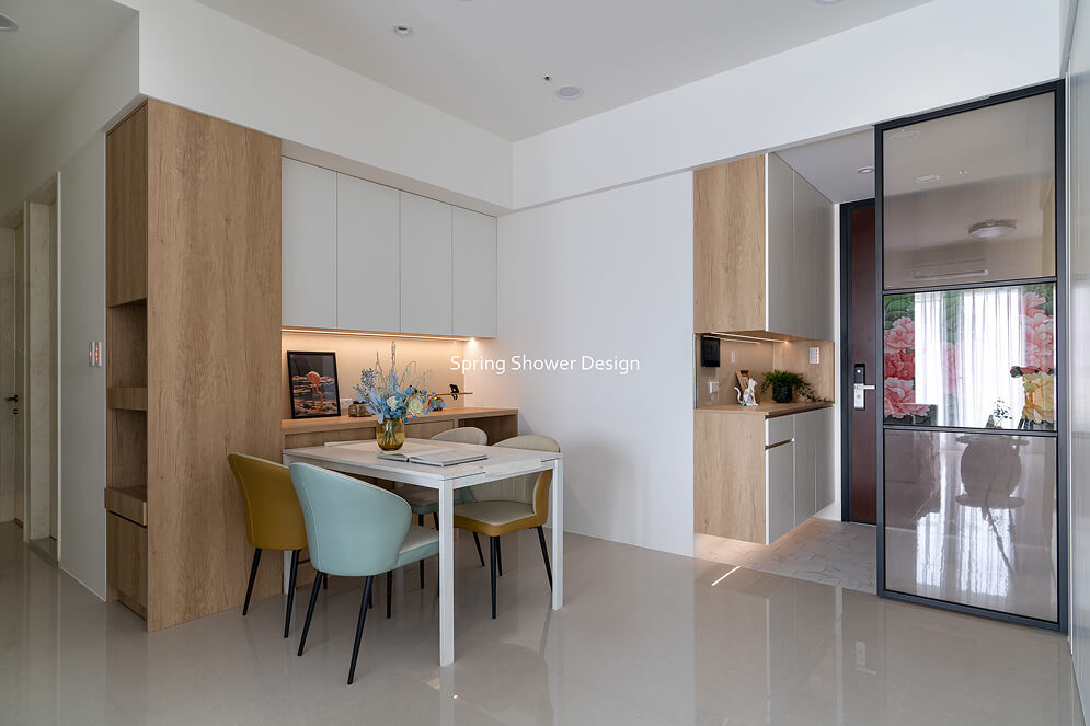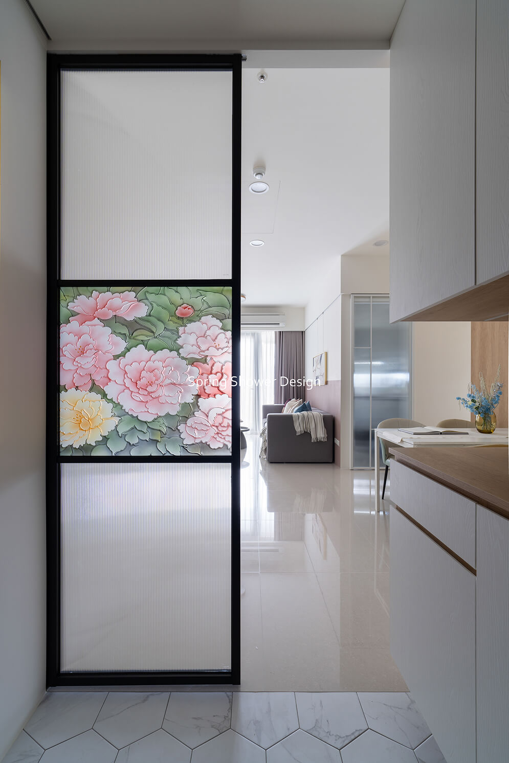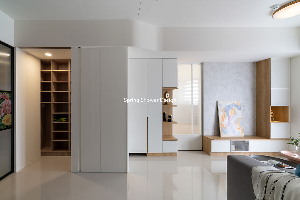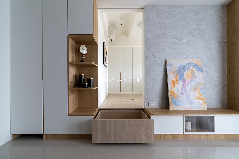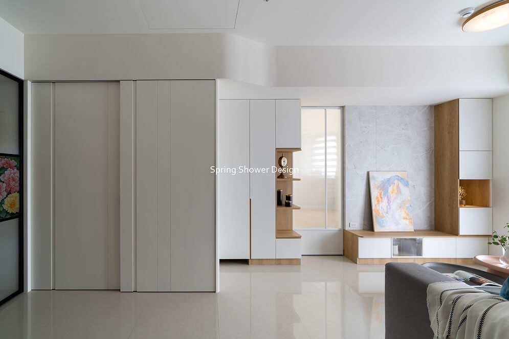 玄關採吊櫃+下櫃設計,中間留展示區,增強穿透感。落塵區磁磚在客變階段拆除,鋪上銀狐石紋六角磚,兼具精緻與實用。活動式長虹玻璃屏風,平時遮擋視線,保持動線流暢。儲藏室兼顧鞋間及冷凍櫃、寵物車、家電紙箱收納,維持公區整潔。