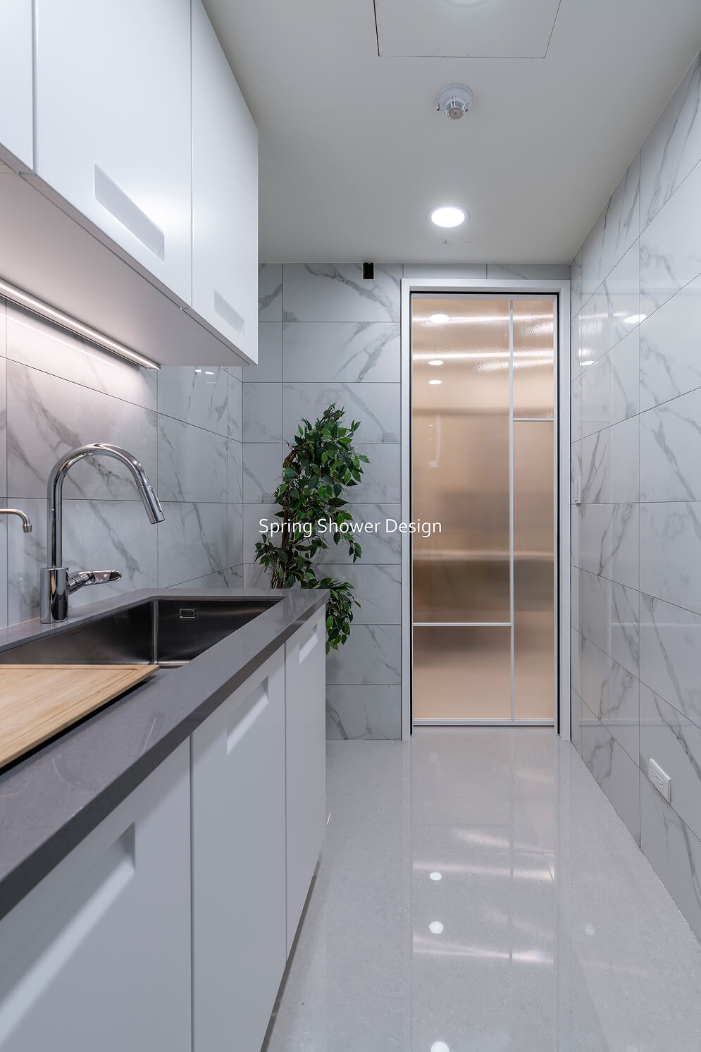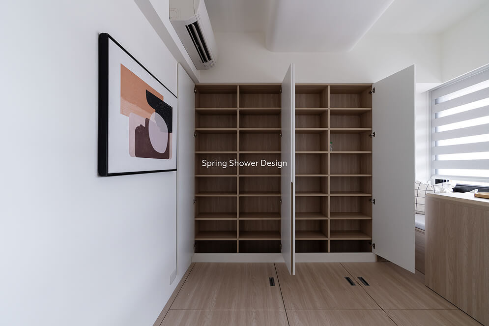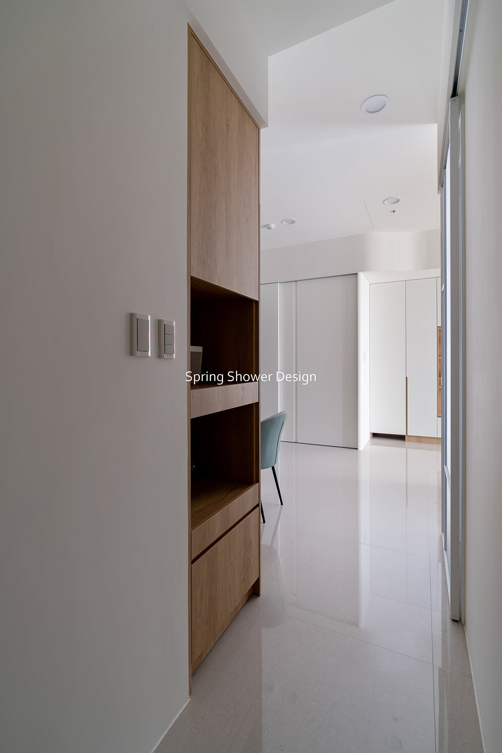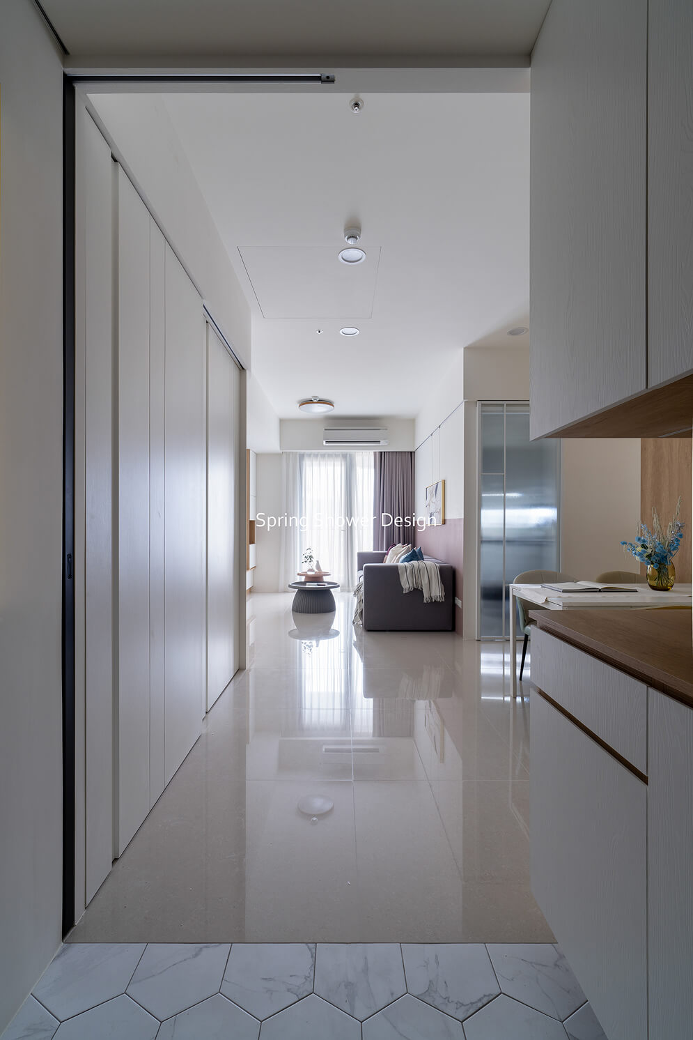 玄關採吊櫃+下櫃設計,中間留展示區,增強穿透感。落塵區磁磚在客變階段拆除,鋪上銀狐石紋六角磚,兼具精緻與實用。活動式長虹玻璃屏風,平時遮擋視線,保持動線流暢。儲藏室兼顧鞋間及冷凍櫃、寵物車、家電紙箱收納,維持公區整潔。