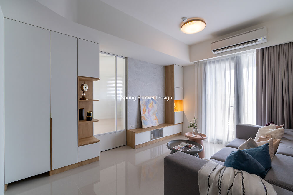 客廳以仿石紋系統板做主牆,結合展示櫃、設備櫃及財位燈光,層次分明。多功能室採架高設計,拉門下方隱藏收納,窗邊臥榻可休憩或閱讀,尖角採斜角處理,兼顧客房功能。餐廳預留6人座餐桌與餐櫃,餐櫃含紅酒冰箱,背板採烤漆玻璃並搭配滑門片設計,並與廚房電器櫃連動,兼顧美觀與收納。小冰柱玻璃拉門引入自然光,增加明亮感。
