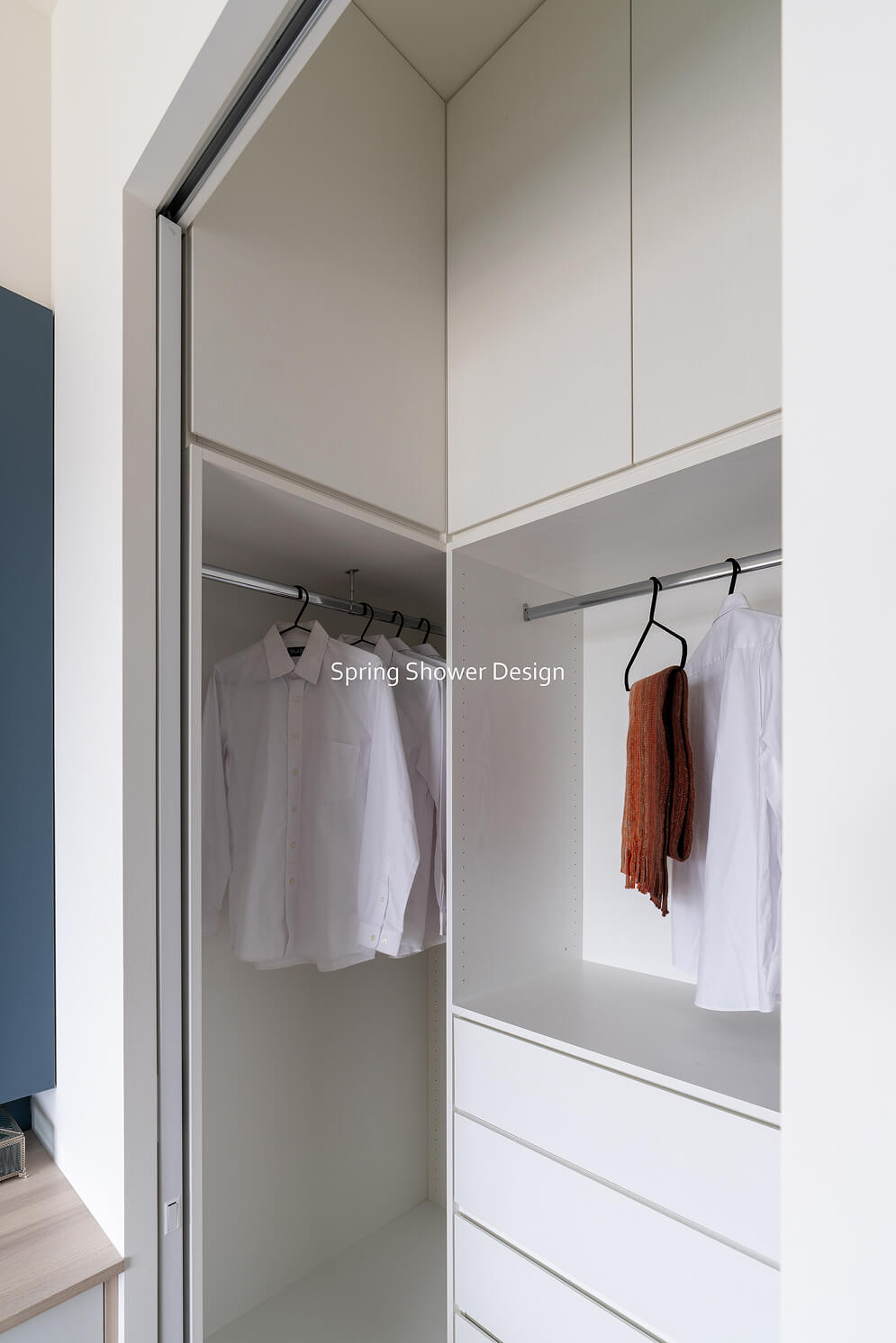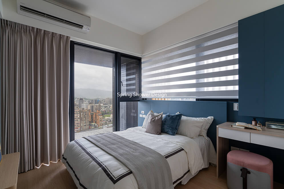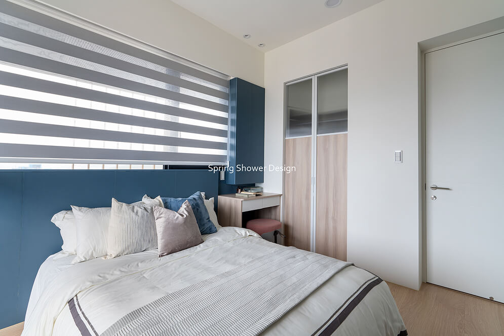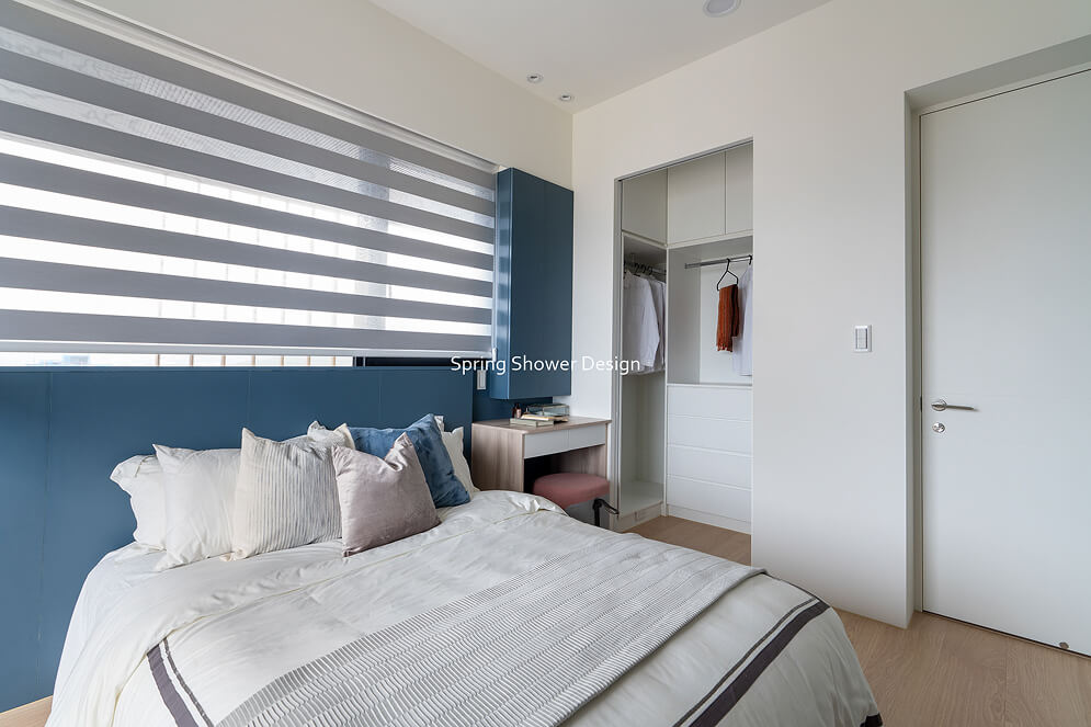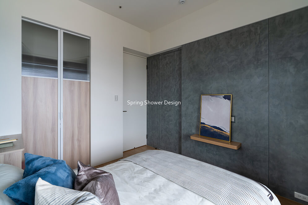 主臥採藏青色布織紋板材,連接化妝桌上櫃做到頂;步入式更衣室採ㄇ字型收納,床尾保留充足走道,手刷塗料牆延伸至主浴室暗門位置。主浴退掉浴缸,以淋浴為主,乾濕區縮放,多出的空間用於走廊高櫃收納。