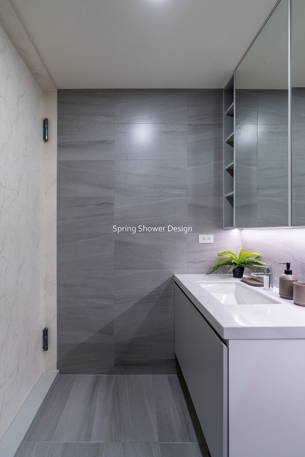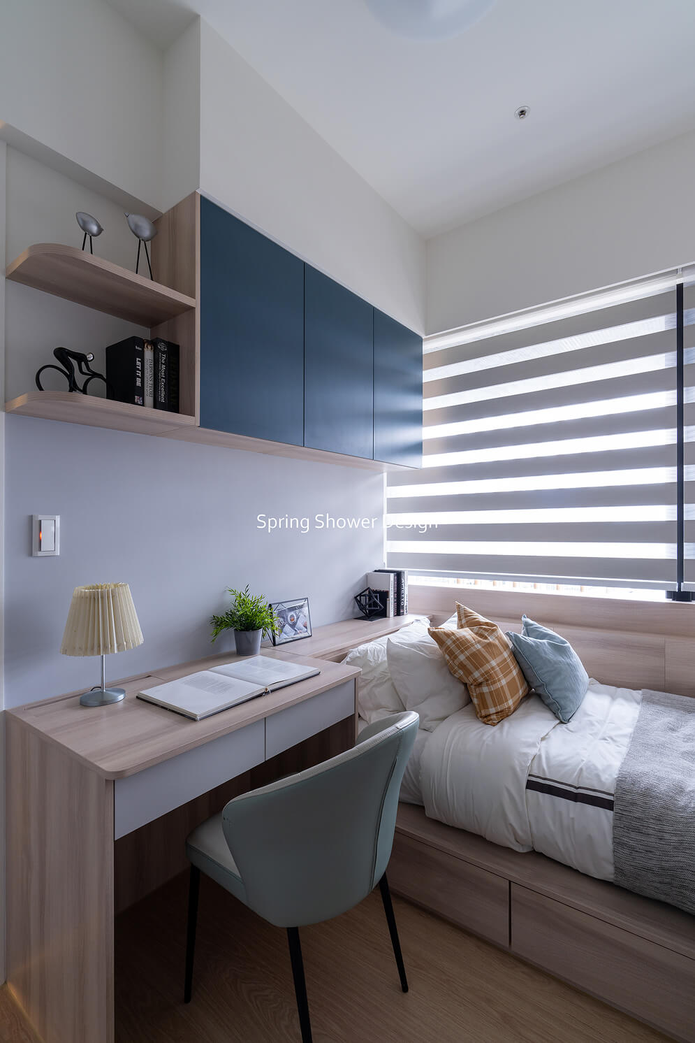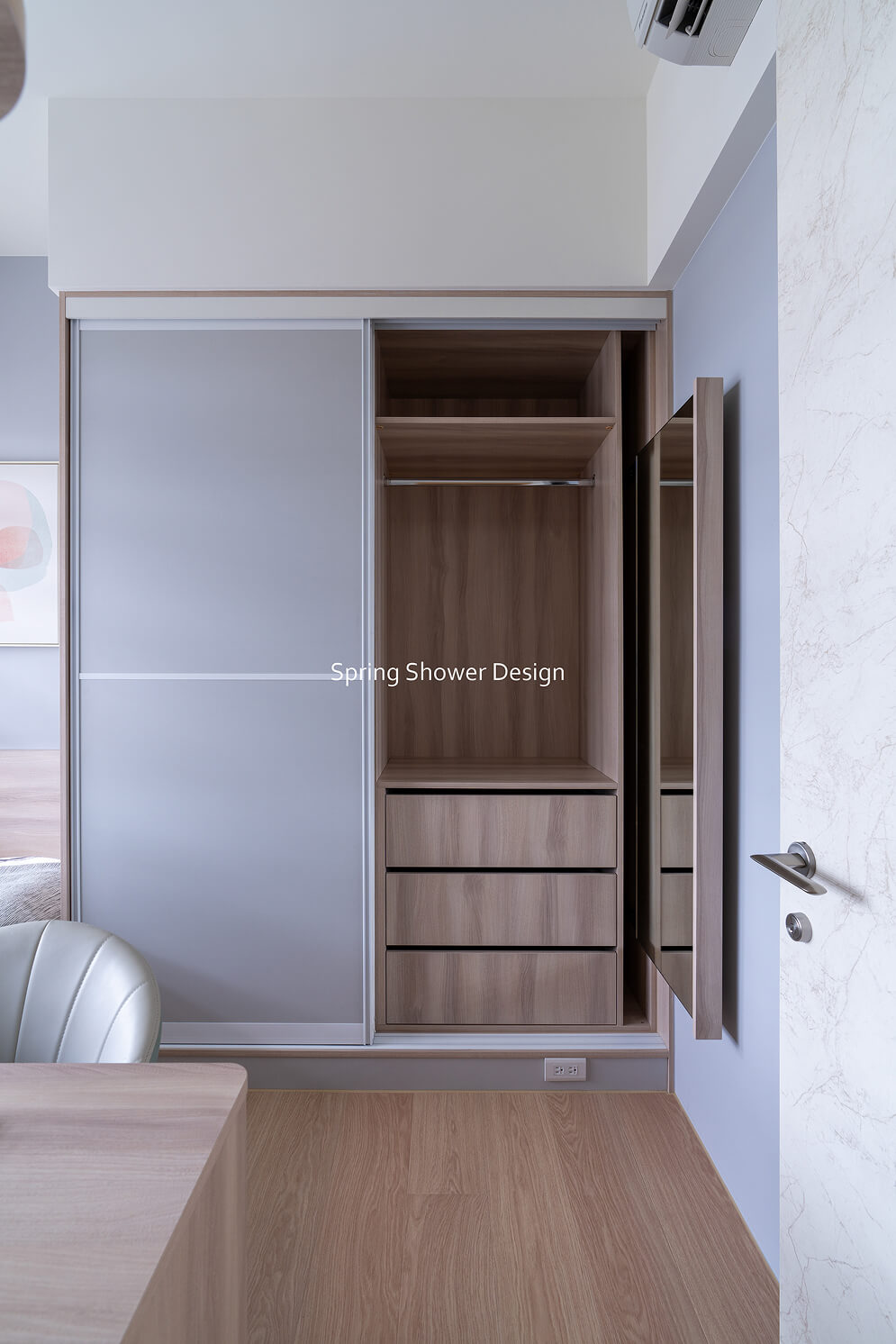 主臥採藏青色布織紋板材,連接化妝桌上櫃做到頂;步入式更衣室採ㄇ字型收納,床尾保留充足走道,手刷塗料牆延伸至主浴室暗門位置。主浴退掉浴缸,以淋浴為主,乾濕區縮放,多出的空間用於走廊高櫃收納。
