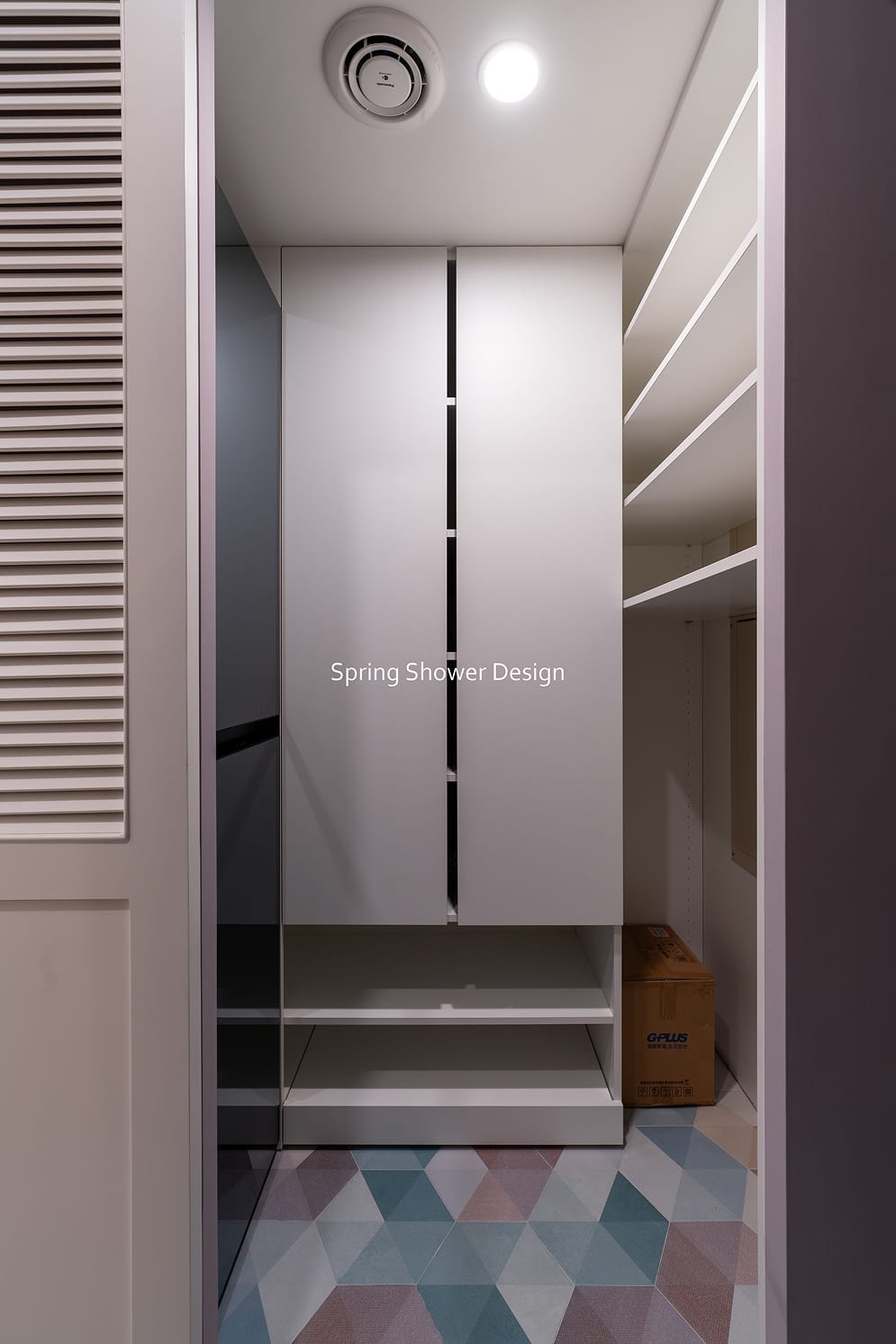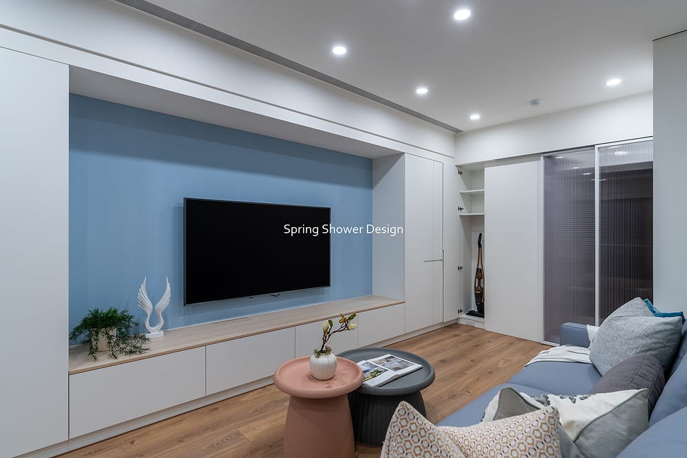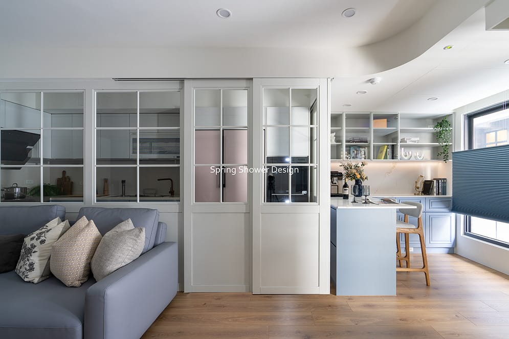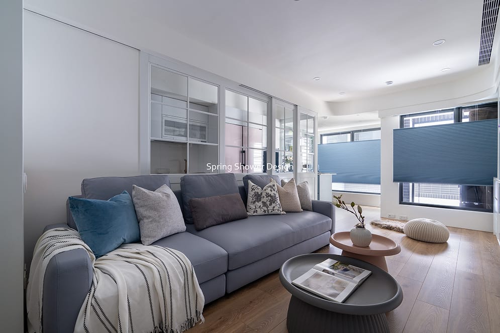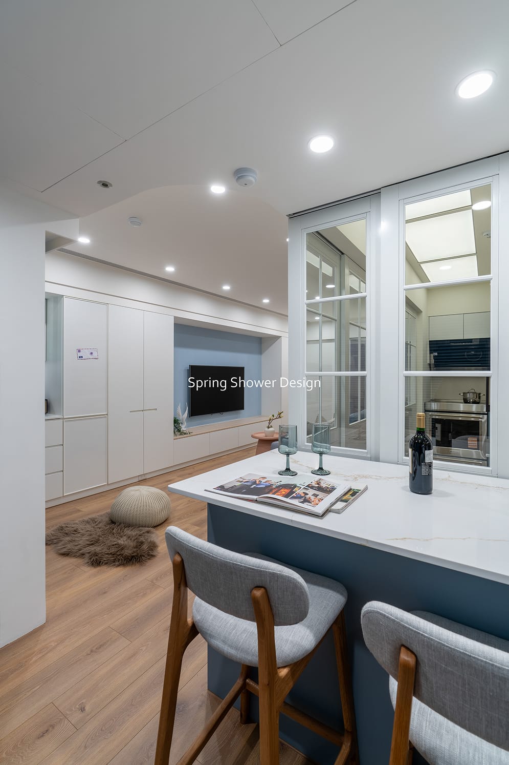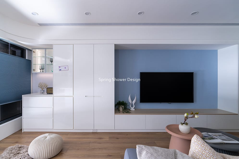 我們將公共空間機能整合為大玄關、大客廳與大廚房,並結合工作與用餐區,讓有限坪數發揮最大坪效;以水洗藍與白色為主軸,搭配超耐磨木地板,讓毛孩自在活動。玄關以屋主喜愛的「丁香紫」為主調,搭配輕美式造型門,規劃「二進式玄關」,區隔大門動線、避免寵物外衝,同時結合落塵區設計,方便毛孩散步回家後清潔腳掌。地坪鋪設丁香紫與水洗藍的彩色六角磚,為空間增添個性層次。玄關後方「隱藏步入式衣帽間」,整合鞋櫃、包包與行李箱收納,並加裝奈米水離子發生器,兼顧空氣品質與寵物健康。