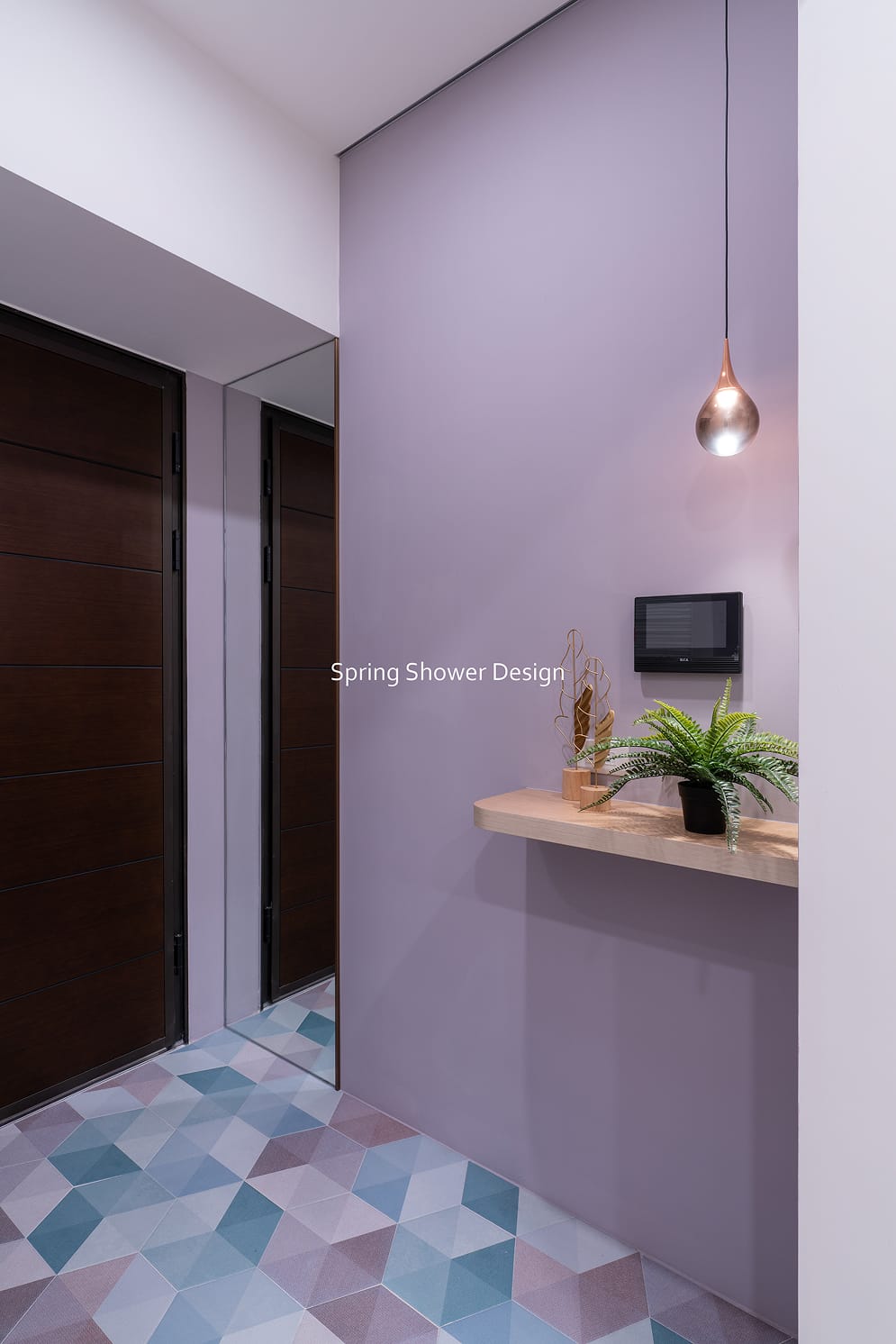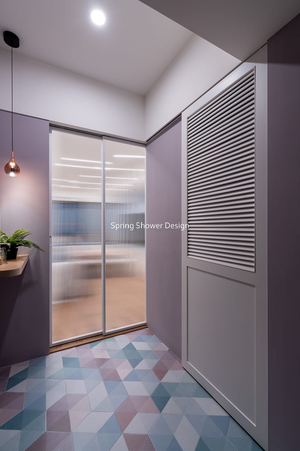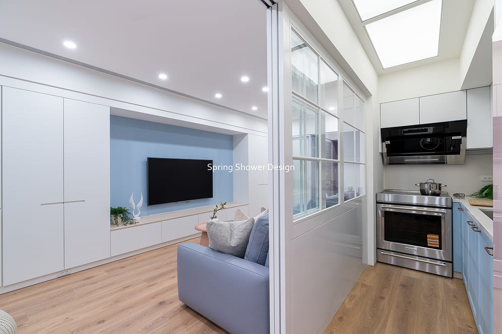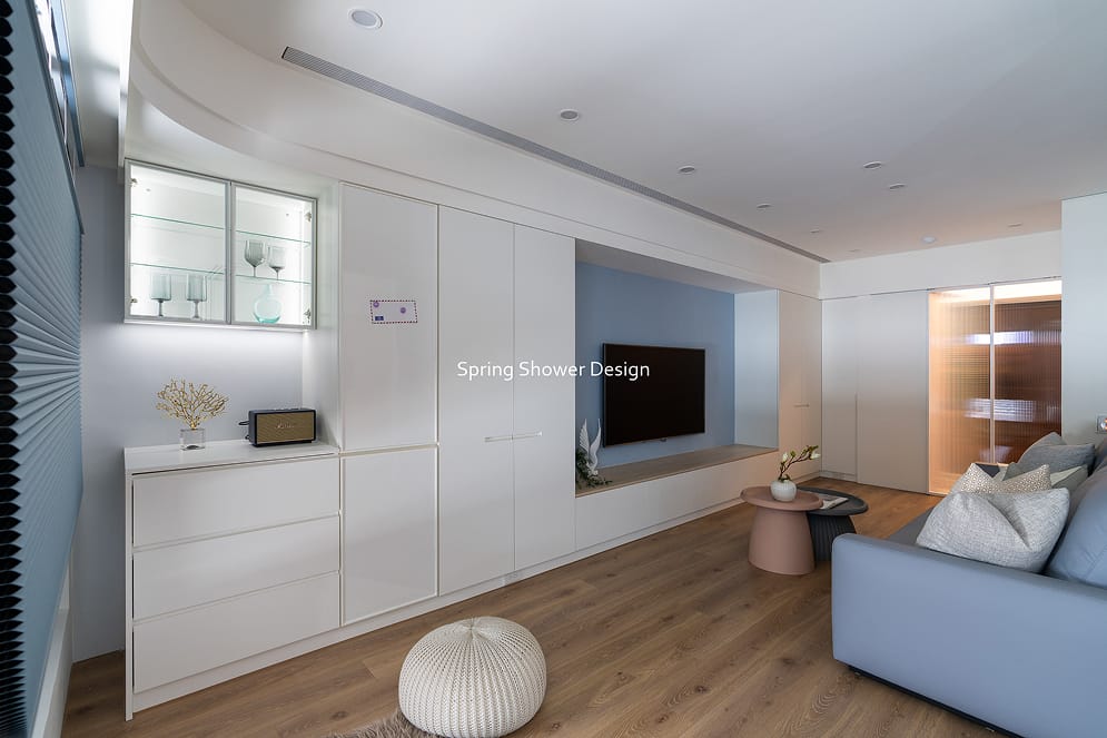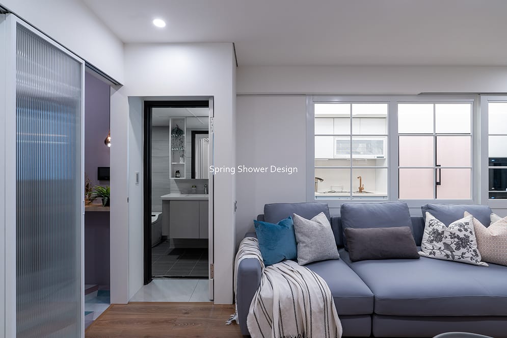 我們將公共空間機能整合為大玄關、大客廳與大廚房,並結合工作與用餐區,讓有限坪數發揮最大坪效;以水洗藍與白色為主軸,搭配超耐磨木地板,讓毛孩自在活動。玄關以屋主喜愛的「丁香紫」為主調,搭配輕美式造型門,規劃「二進式玄關」,區隔大門動線、避免寵物外衝,同時結合落塵區設計,方便毛孩散步回家後清潔腳掌。地坪鋪設丁香紫與水洗藍的彩色六角磚,為空間增添個性層次。玄關後方「隱藏步入式衣帽間」,整合鞋櫃、包包與行李箱收納,並加裝奈米水離子發生器,兼顧空氣品質與寵物健康。