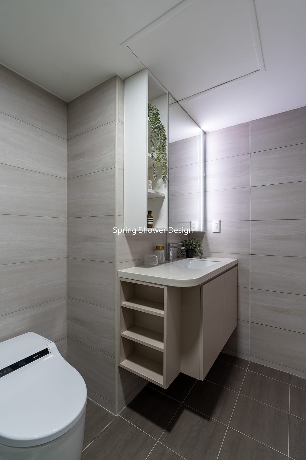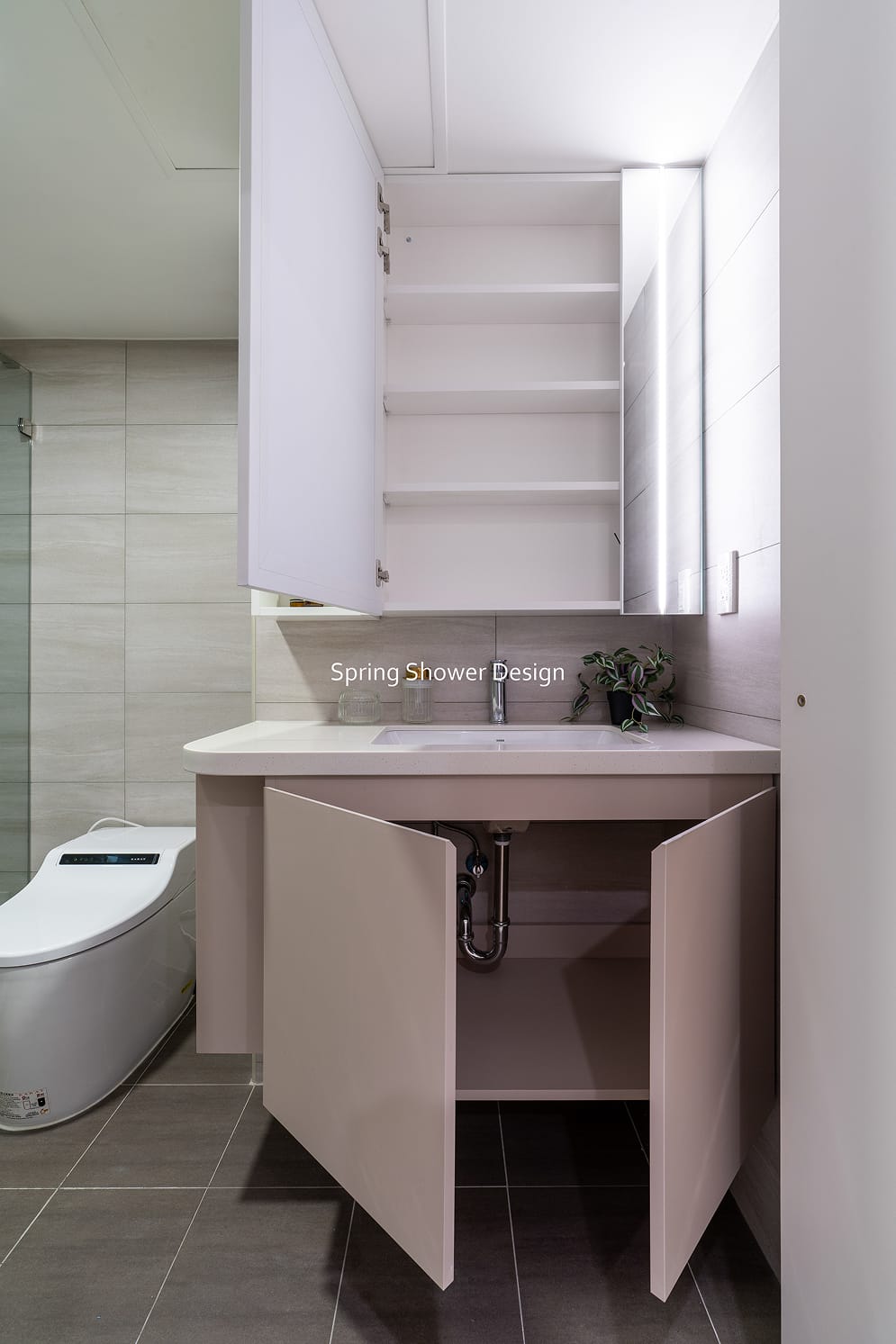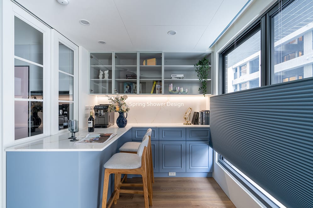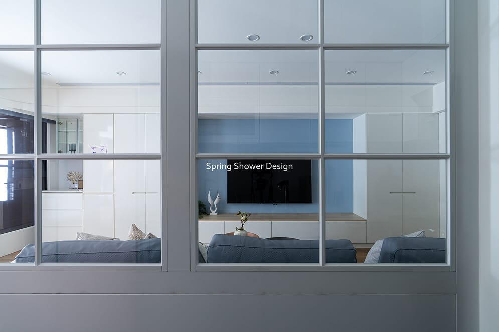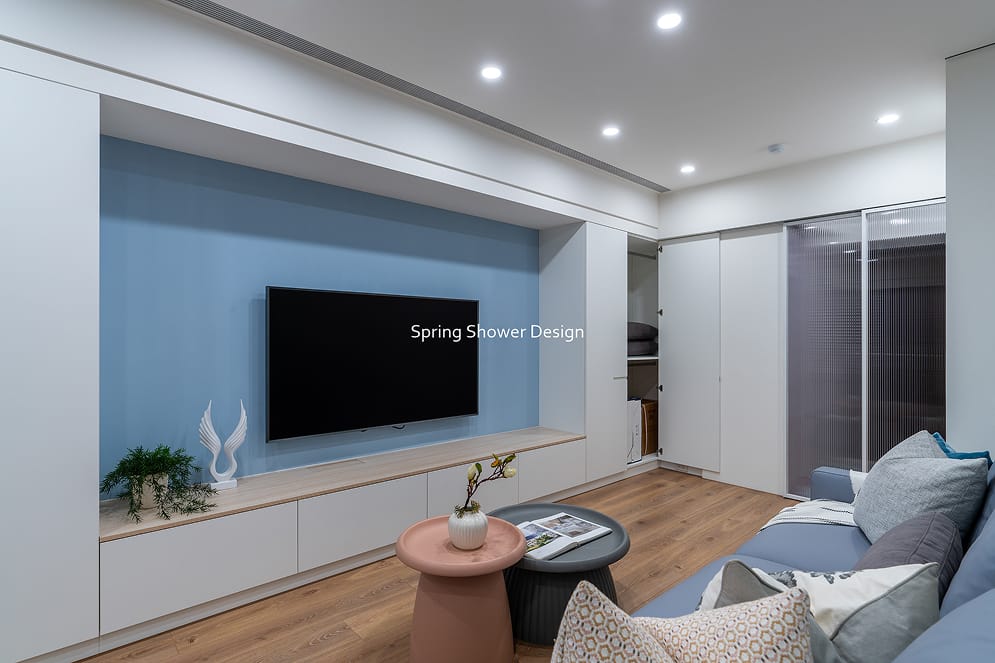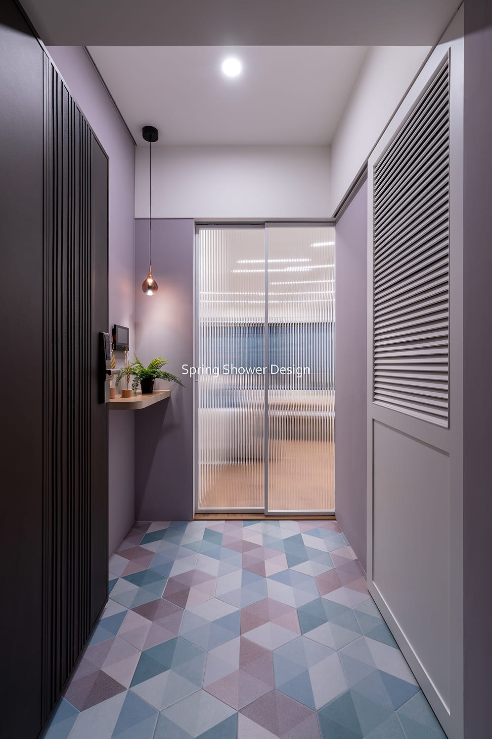 我們將公共空間機能整合為大玄關、大客廳與大廚房,並結合工作與用餐區,讓有限坪數發揮最大坪效;以水洗藍與白色為主軸,搭配超耐磨木地板,讓毛孩自在活動。玄關以屋主喜愛的「丁香紫」為主調,搭配輕美式造型門,規劃「二進式玄關」,區隔大門動線、避免寵物外衝,同時結合落塵區設計,方便毛孩散步回家後清潔腳掌。地坪鋪設丁香紫與水洗藍的彩色六角磚,為空間增添個性層次。玄關後方「隱藏步入式衣帽間」,整合鞋櫃、包包與行李箱收納,並加裝奈米水離子發生器,兼顧空氣品質與寵物健康。