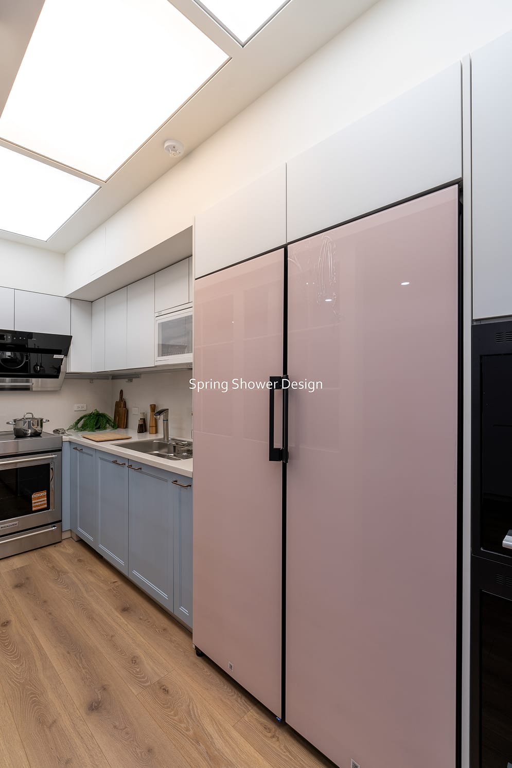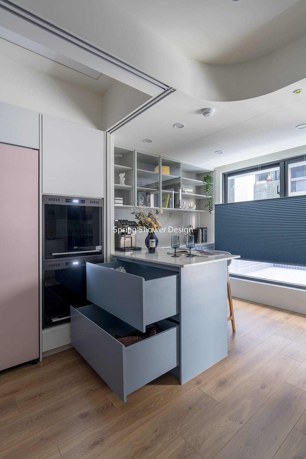 廚房以格子窗鐵件隔間圍塑半開放式大廚房,兼顧油煙阻隔與通透感。超過430公分的料理檯面,完整容納大型烤箱與冷凍設備,搭配流暢動線與耐用中島檯面,讓屋主在料理、生活與陪伴毛小孩之間,享受屬於自己的理想日常!