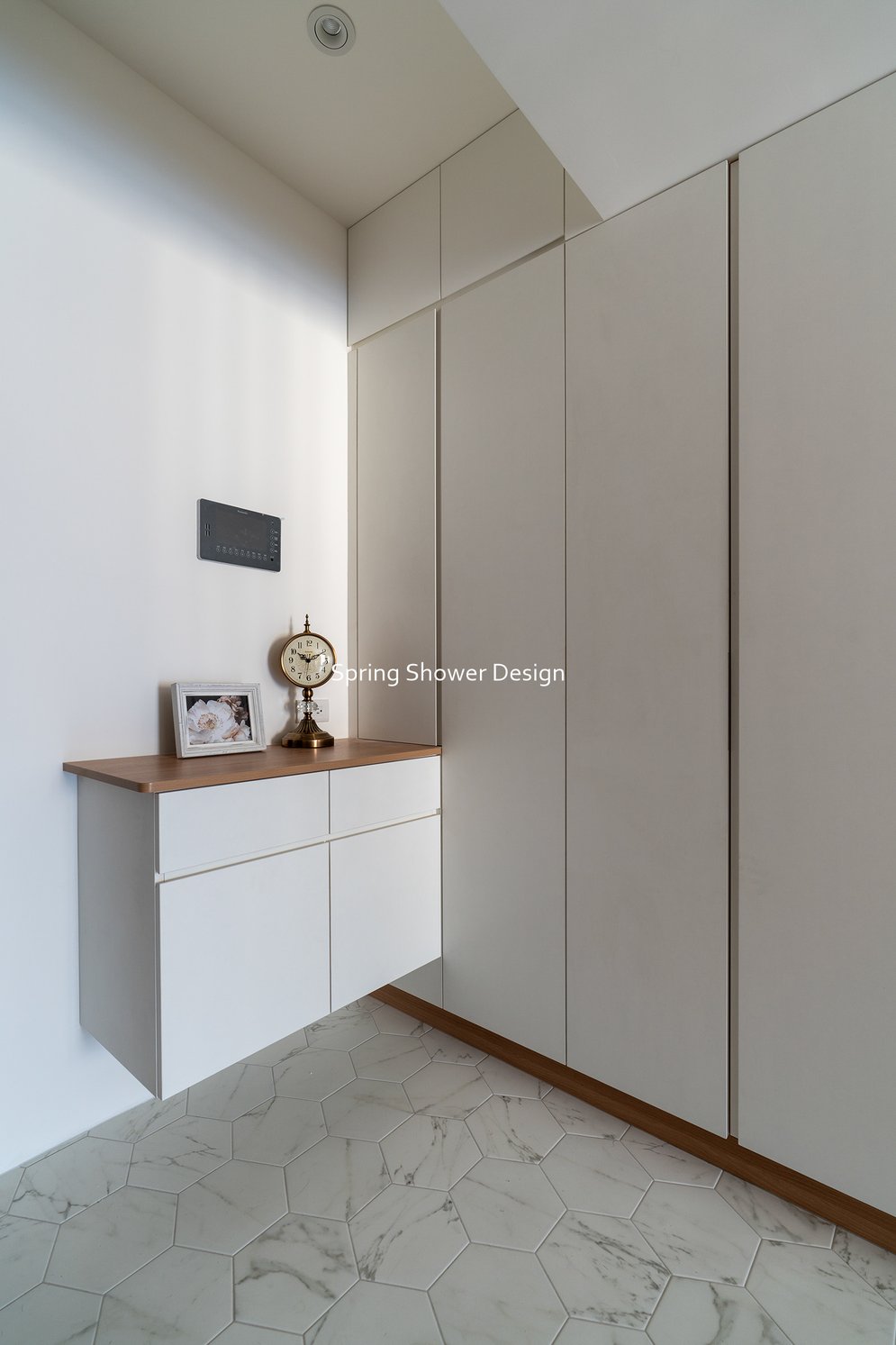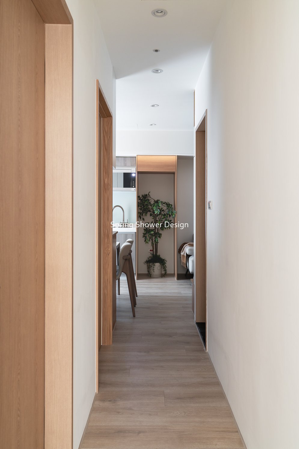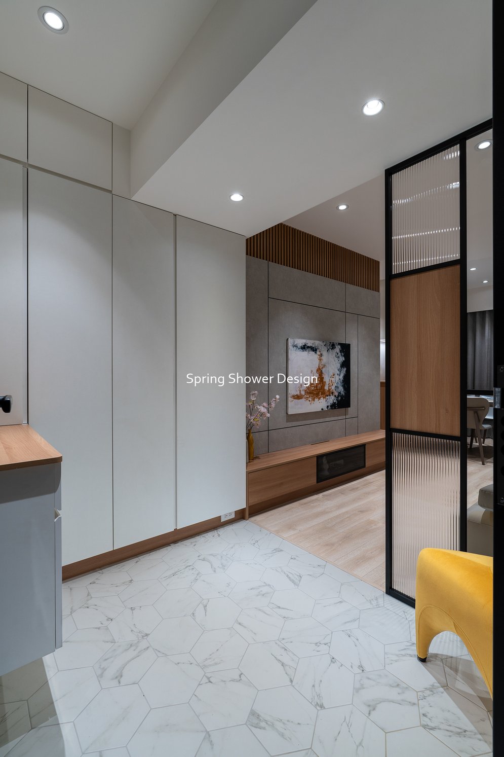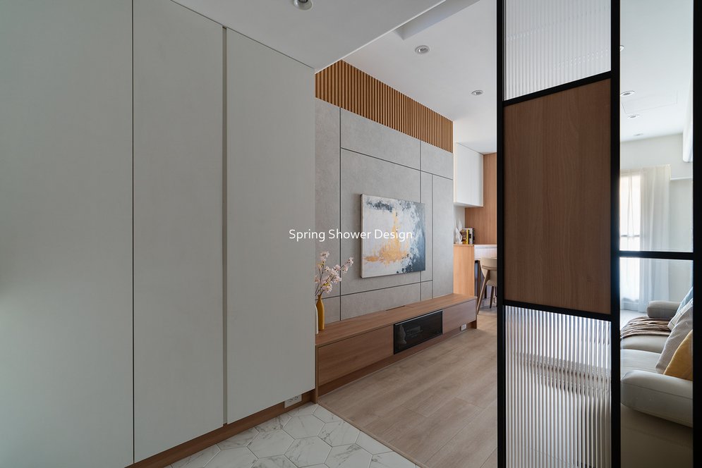 這是屋主一家三口的家,以「日式無印風」為主軸,加入量身訂製的收納規劃,兼具實用與輕量感,保持一家人喜歡的簡約氛圍。玄關採L型組織收納,高鞋櫃、專屬汙衣櫃以及行李箱位置;落塵區以「銀狐石紋六角磚」銜接超耐磨木地板,兼顧美觀與耐用。屏風設計運用黑色鐵件、木紋色板與玻璃材質,虛實交錯,增添日式氛圍,同時界定空間。