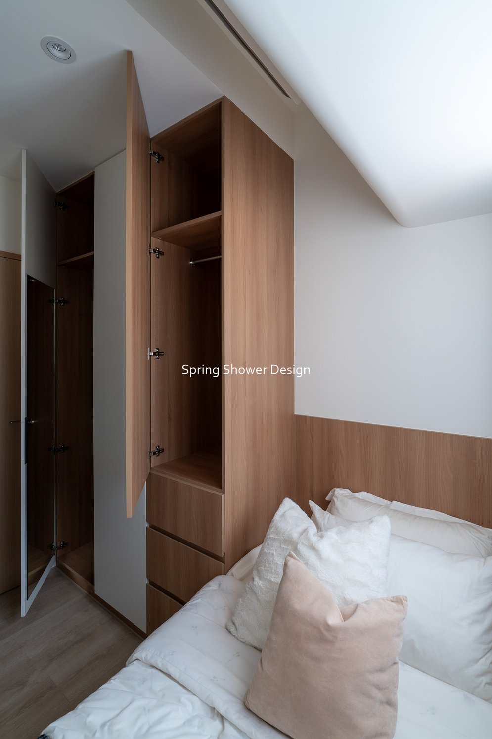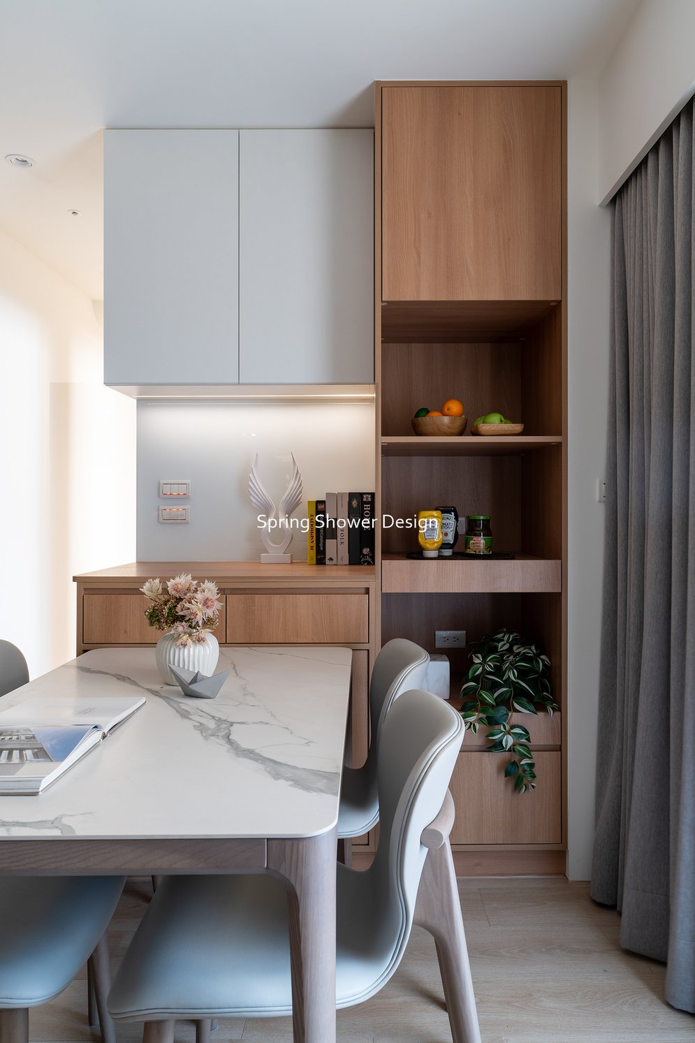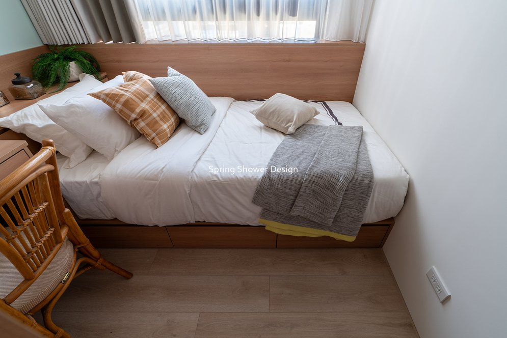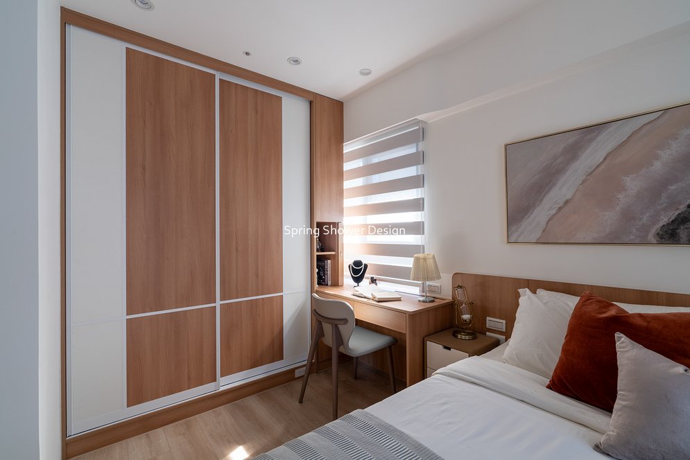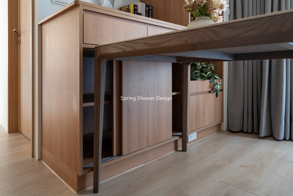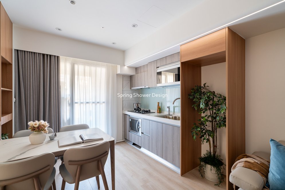 客廳主牆運用仿清水模美耐板、暖色木紋與木格柵元素,拉高視覺比例,打造屋主喜愛的日式風格調性。餐廚區保持開放式格局,以同色系系統板規劃冰箱與餐櫃,同時預留餐桌位置,維持整體感。主臥室3.7坪,延續公區木紋氛圍,從床頭延伸至化妝桌與衣櫃,加入完整收納功能。整個家透過量身訂製的櫃體規劃,提供高彈性收納,讓日式小清新的風格與實用機能兼具,實現既簡約又整齊的居家生活!