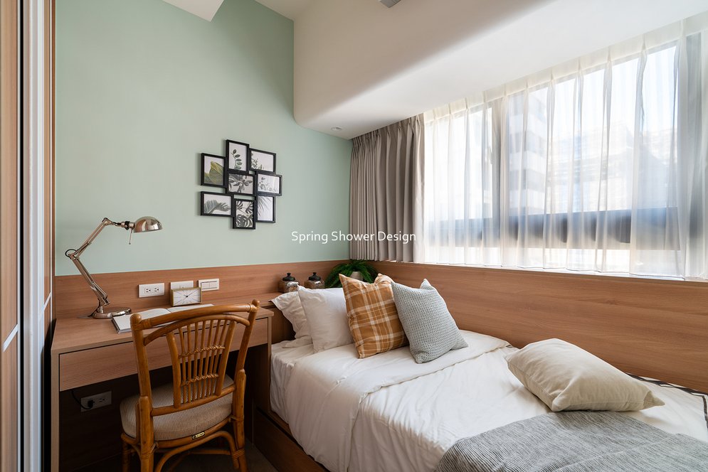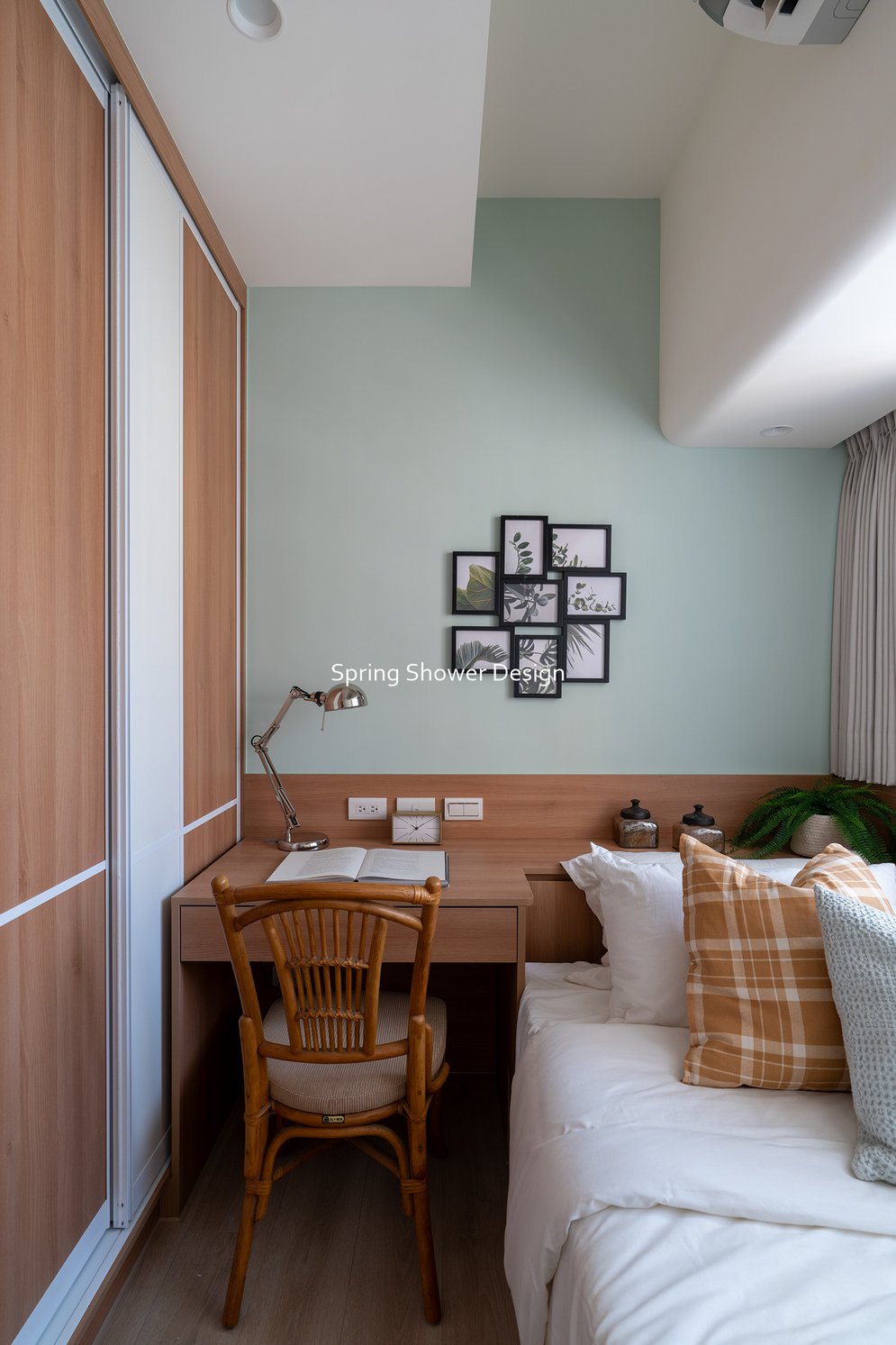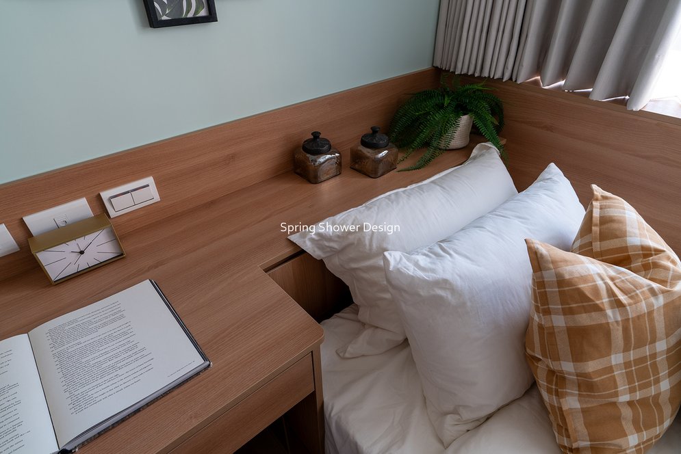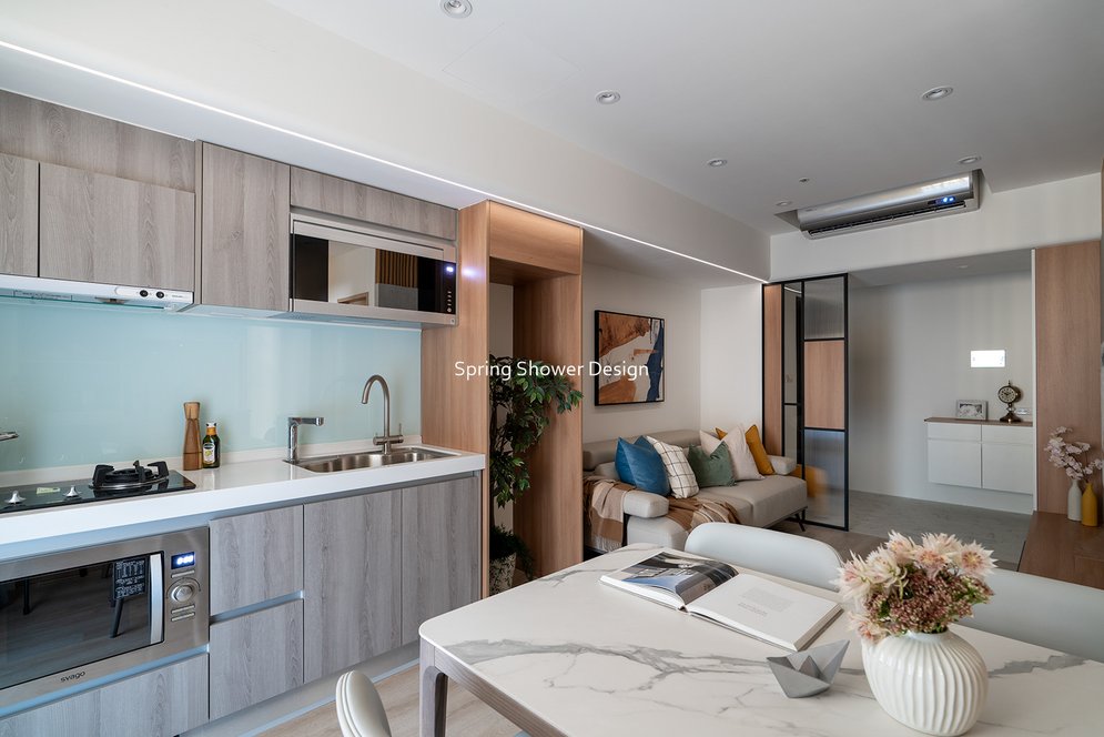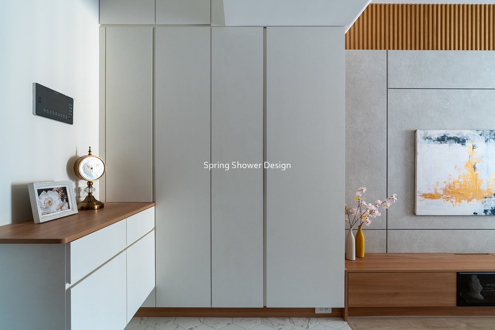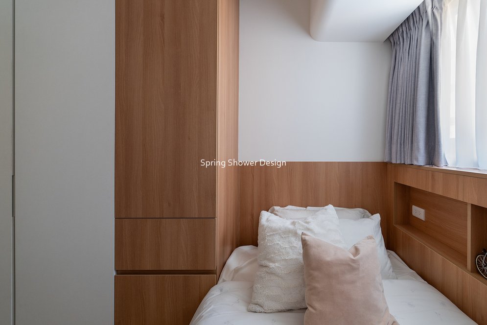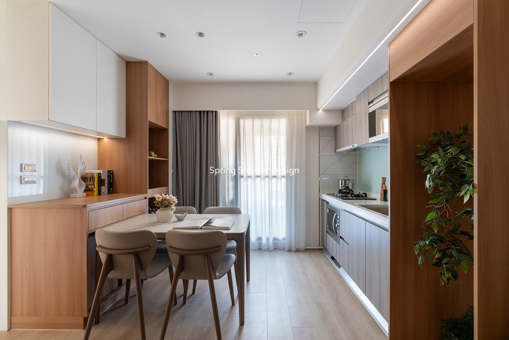 客廳主牆運用仿清水模美耐板、暖色木紋與木格柵元素,拉高視覺比例,打造屋主喜愛的日式風格調性。餐廚區保持開放式格局,以同色系系統板規劃冰箱與餐櫃,同時預留餐桌位置,維持整體感。主臥室3.7坪,延續公區木紋氛圍,從床頭延伸至化妝桌與衣櫃,加入完整收納功能。整個家透過量身訂製的櫃體規劃,提供高彈性收納,讓日式小清新的風格與實用機能兼具,實現既簡約又整齊的居家生活!