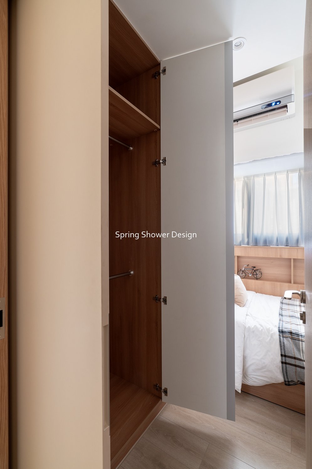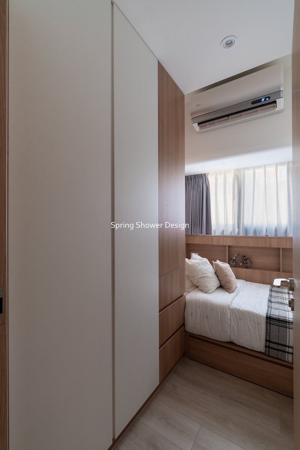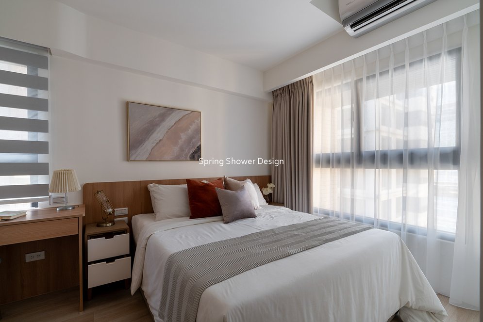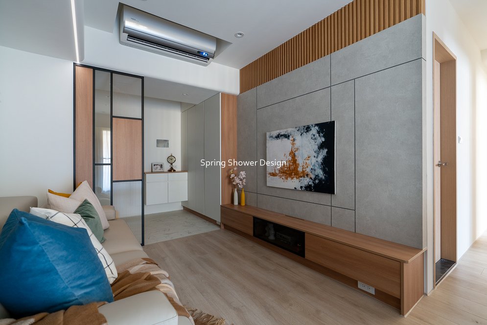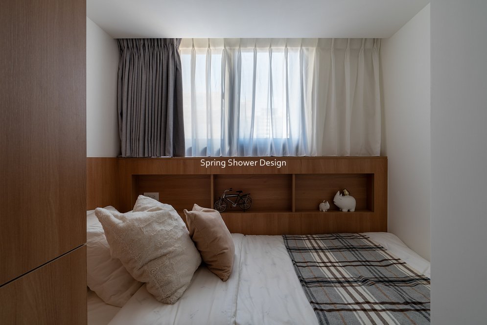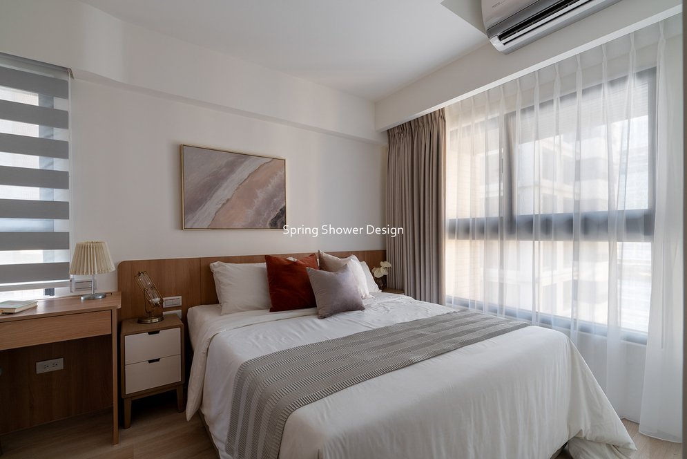 客廳主牆運用仿清水模美耐板、暖色木紋與木格柵元素,拉高視覺比例,打造屋主喜愛的日式風格調性。餐廚區保持開放式格局,以同色系系統板規劃冰箱與餐櫃,同時預留餐桌位置,維持整體感。主臥室3.7坪,延續公區木紋氛圍,從床頭延伸至化妝桌與衣櫃,加入完整收納功能。整個家透過量身訂製的櫃體規劃,提供高彈性收納,讓日式小清新的風格與實用機能兼具,實現既簡約又整齊的居家生活!