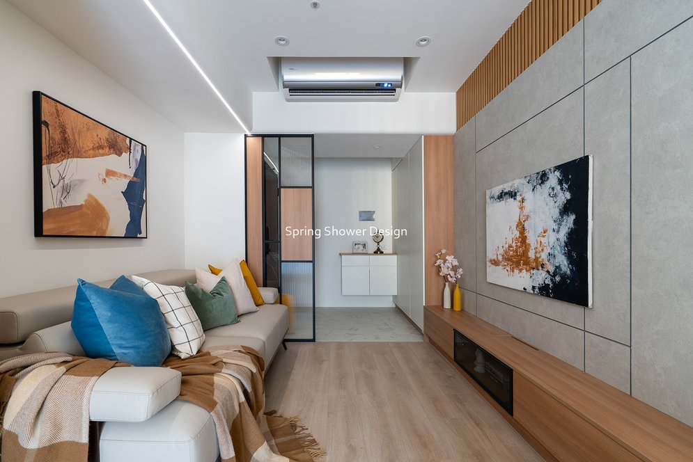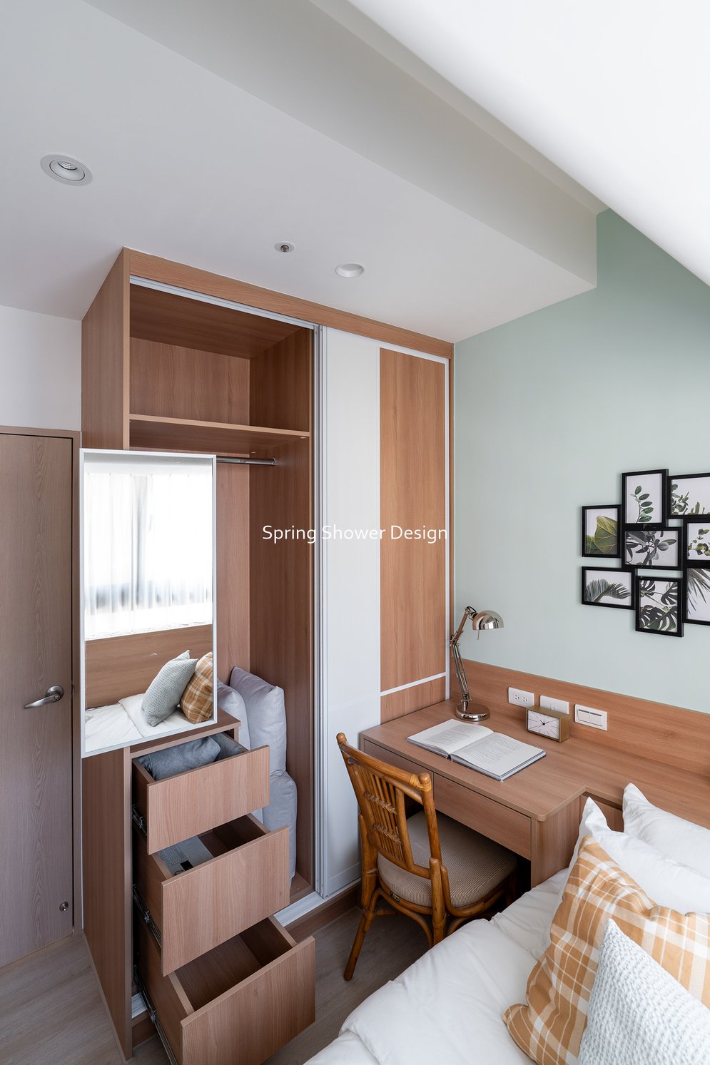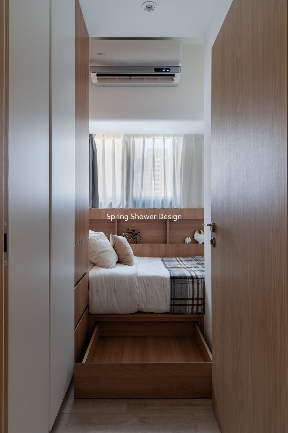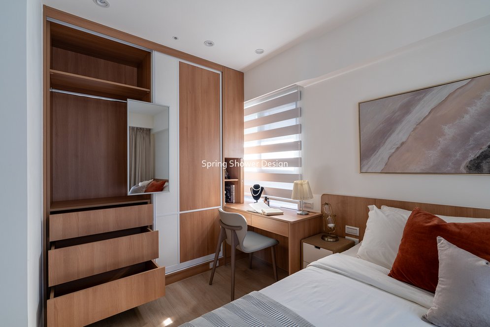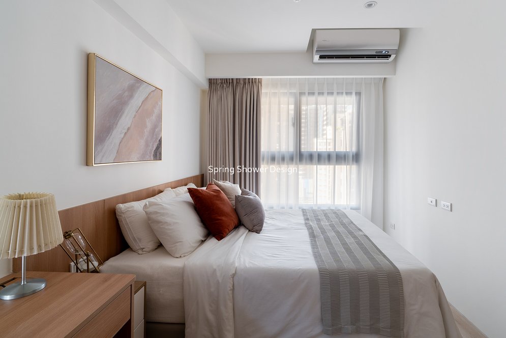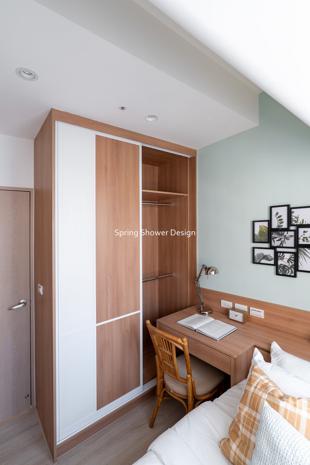 客廳主牆運用仿清水模美耐板、暖色木紋與木格柵元素,拉高視覺比例,打造屋主喜愛的日式風格調性。餐廚區保持開放式格局,以同色系系統板規劃冰箱與餐櫃,同時預留餐桌位置,維持整體感。主臥室3.7坪,延續公區木紋氛圍,從床頭延伸至化妝桌與衣櫃,加入完整收納功能。整個家透過量身訂製的櫃體規劃,提供高彈性收納,讓日式小清新的風格與實用機能兼具,實現既簡約又整齊的居家生活!