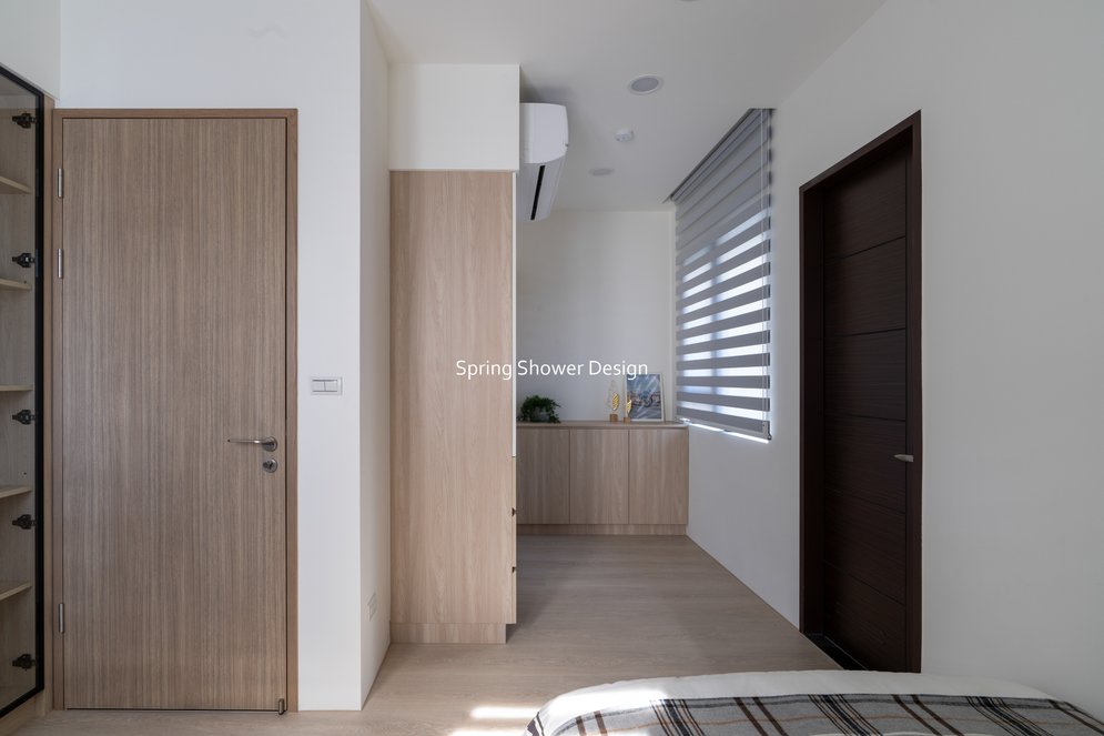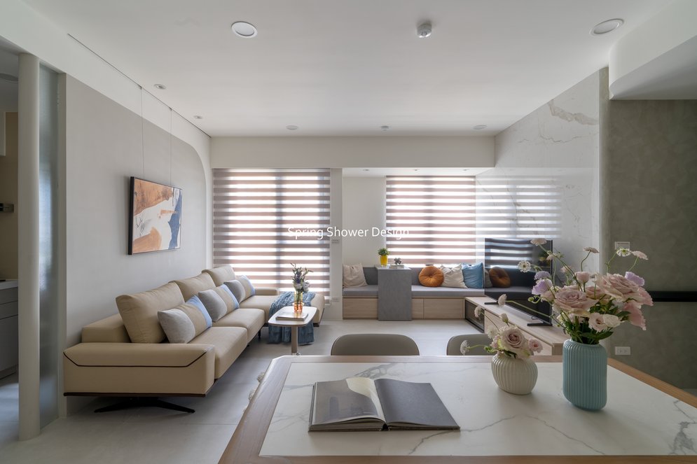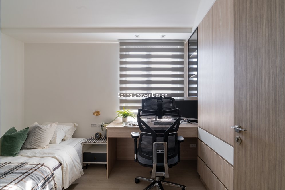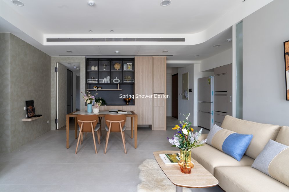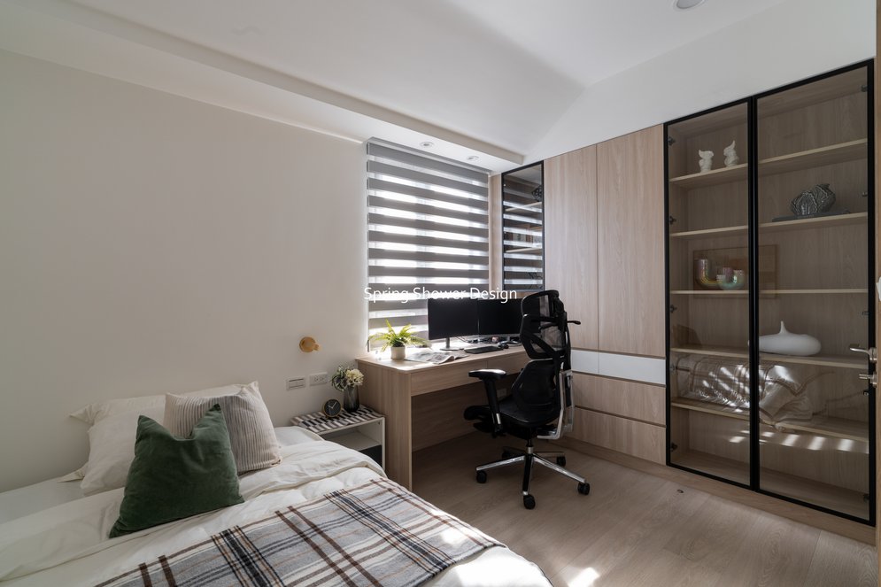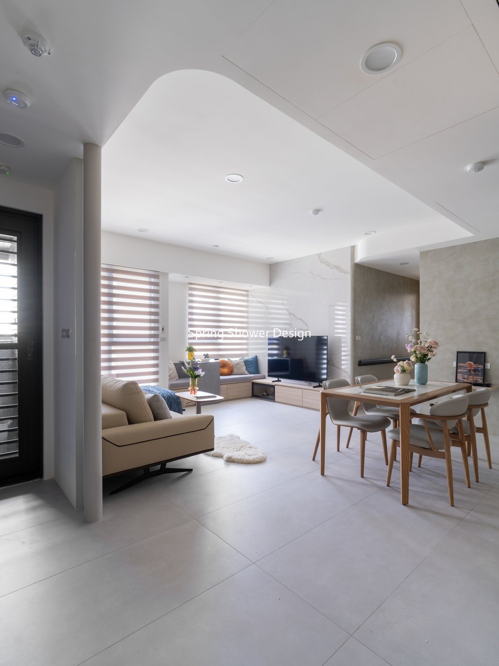 餐廳、客廳與廚房採光充足,延續開放式廚房格局,加入直立式電器櫃與冰箱收納。客廳電視牆選用大板磚,挑高無接縫,底部延伸電視櫃與臥榻,維持視野通透,L型沙發區面向窗景,讓光線與景觀融入生活。主臥室規劃更衣室與儲藏室,睡眠、收納、化妝區空間分明。更衣室設計吊衣與包包收納,冬衣與寢具可以分門別類收納,保持整齊。主浴室門向調整,採水磨石壁磚跳色,淋浴區新增鏡櫃收納,兼顧美感與實用性。兒子房規劃書桌、展示櫃、床位與衣櫃,空間依需求靈活運用;男主人房則保留充足收納與舒適睡眠區。整體設計以公共與私領域分明、光線通透、收納充足為核心,為屋主一家人量身訂製專屬宅。