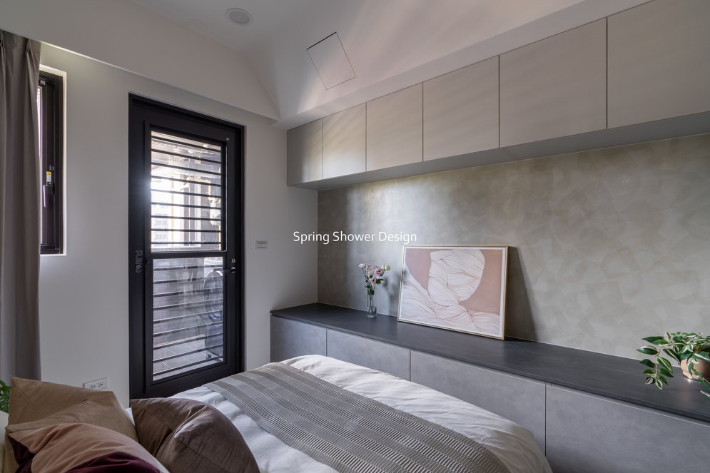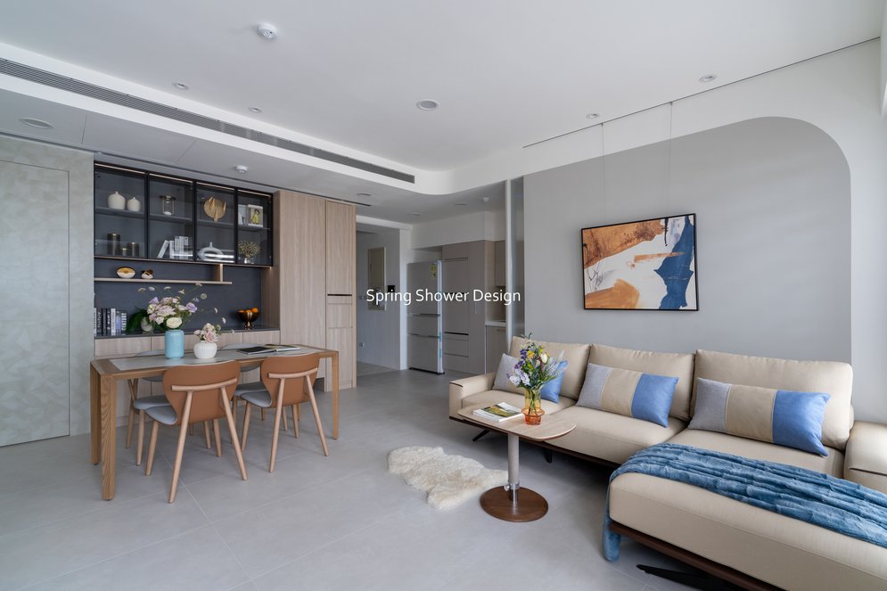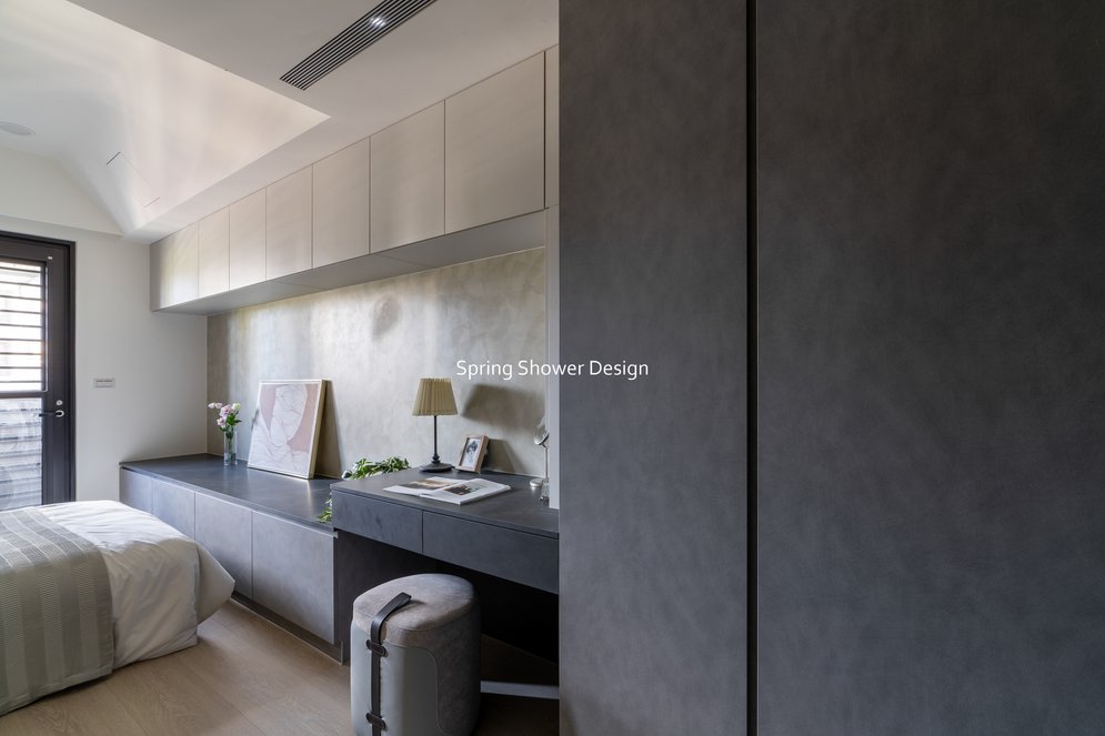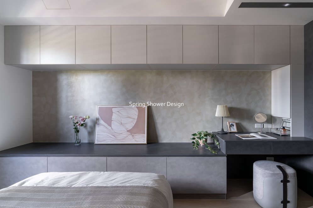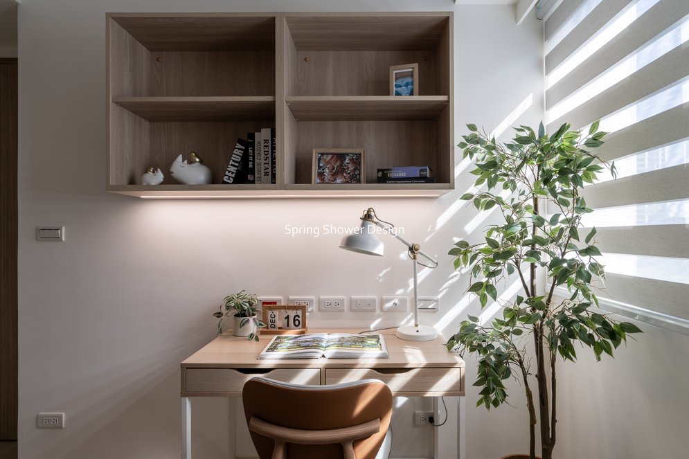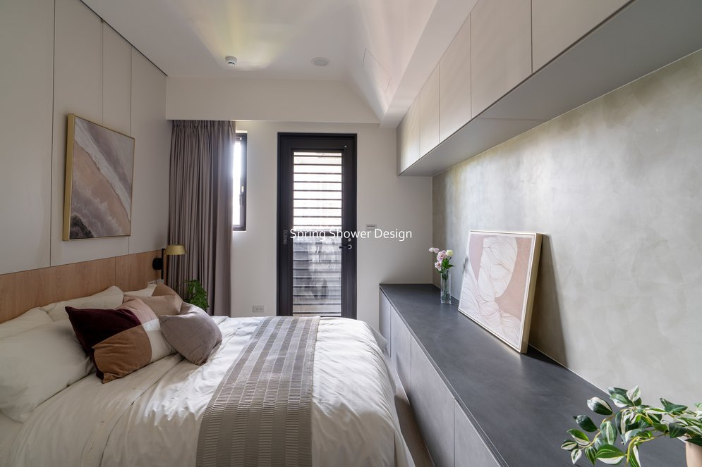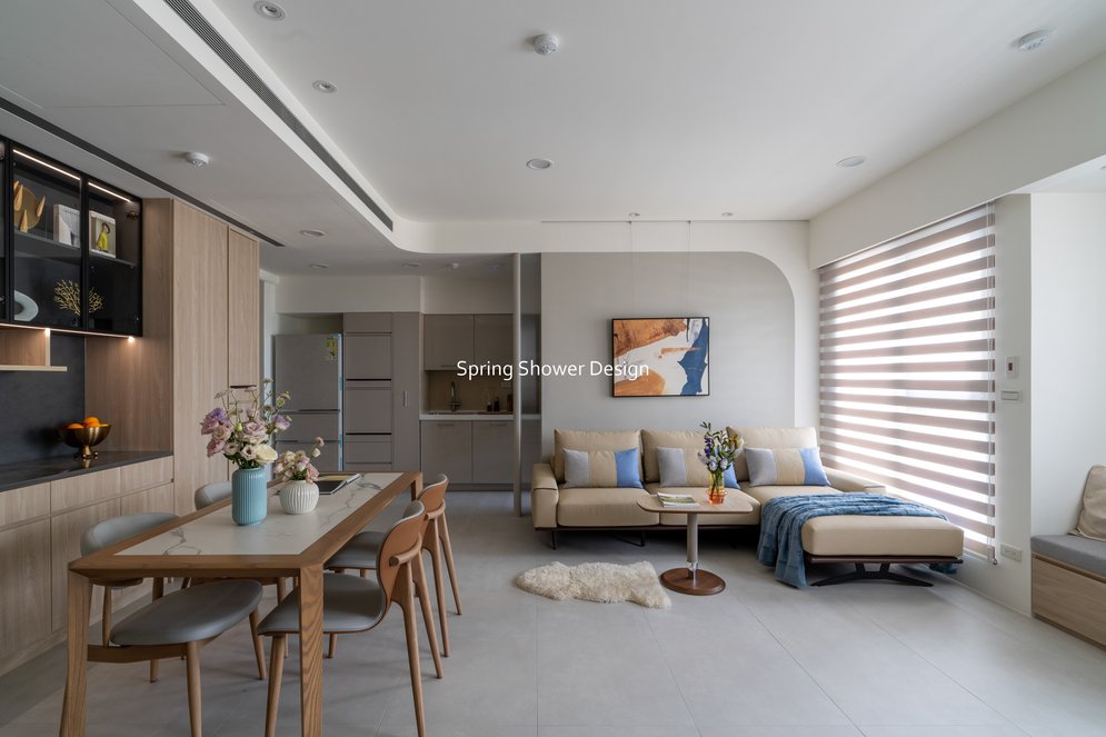 餐廳、客廳與廚房採光充足,延續開放式廚房格局,加入直立式電器櫃與冰箱收納。客廳電視牆選用大板磚,挑高無接縫,底部延伸電視櫃與臥榻,維持視野通透,L型沙發區面向窗景,讓光線與景觀融入生活。主臥室規劃更衣室與儲藏室,睡眠、收納、化妝區空間分明。更衣室設計吊衣與包包收納,冬衣與寢具可以分門別類收納,保持整齊。主浴室門向調整,採水磨石壁磚跳色,淋浴區新增鏡櫃收納,兼顧美感與實用性。兒子房規劃書桌、展示櫃、床位與衣櫃,空間依需求靈活運用;男主人房則保留充足收納與舒適睡眠區。整體設計以公共與私領域分明、光線通透、收納充足為核心,為屋主一家人量身訂製專屬宅。