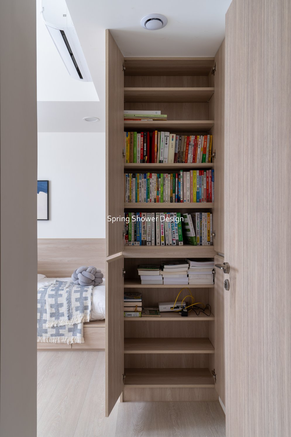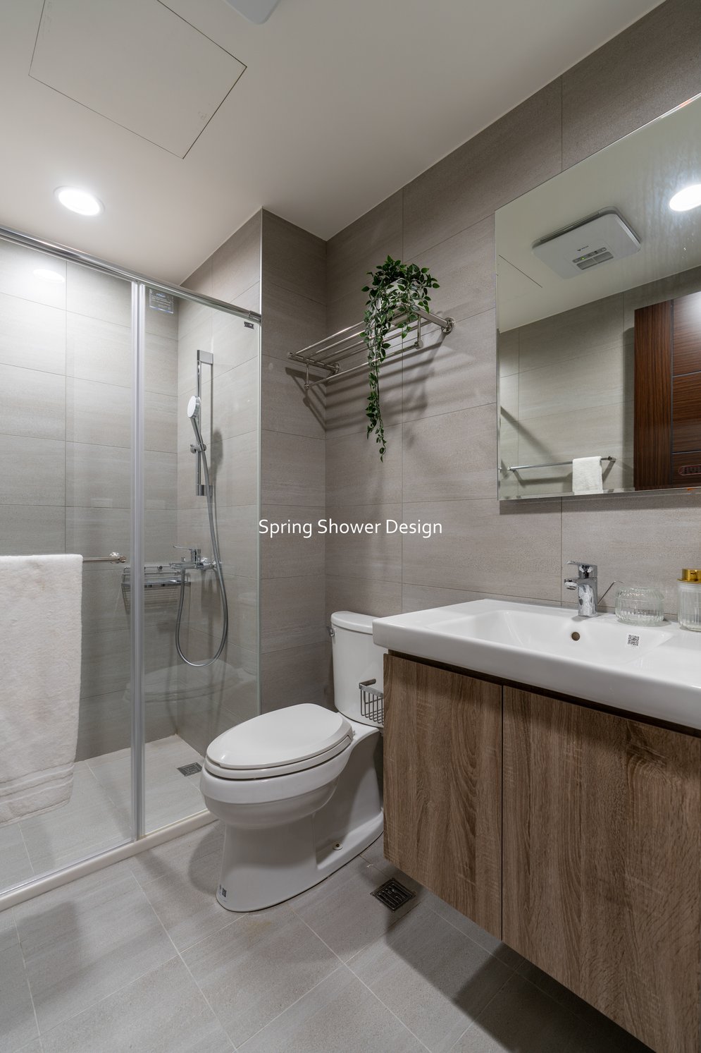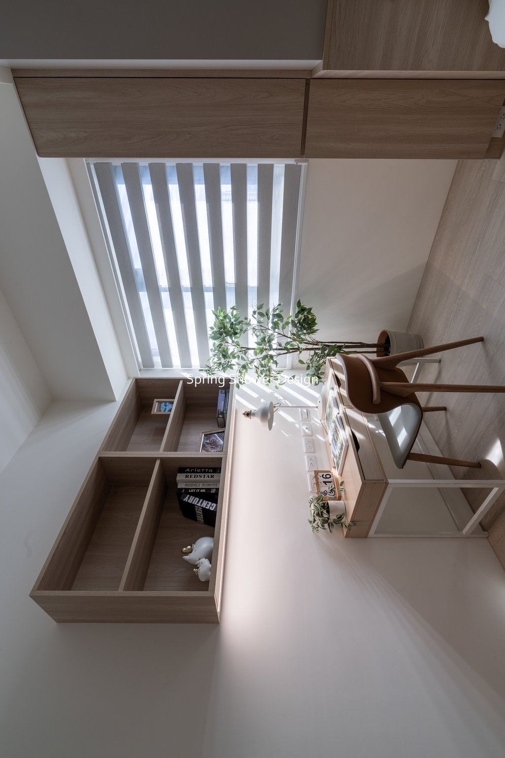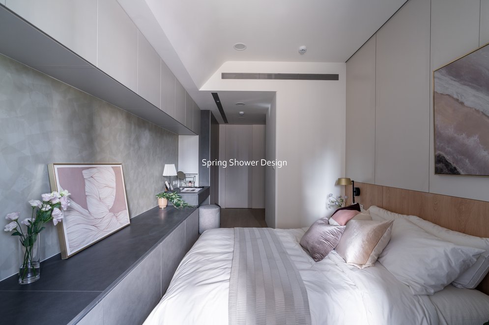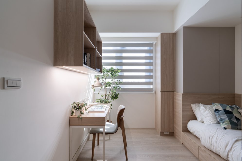餐廳、客廳與廚房採光充足,延續開放式廚房格局,加入直立式電器櫃與冰箱收納。客廳電視牆選用大板磚,挑高無接縫,底部延伸電視櫃與臥榻,維持視野通透,L型沙發區面向窗景,讓光線與景觀融入生活。主臥室規劃更衣室與儲藏室,睡眠、收納、化妝區空間分明。更衣室設計吊衣與包包收納,冬衣與寢具可以分門別類收納,保持整齊。主浴室門向調整,採水磨石壁磚跳色,淋浴區新增鏡櫃收納,兼顧美感與實用性。兒子房規劃書桌、展示櫃、床位與衣櫃,空間依需求靈活運用;男主人房則保留充足收納與舒適睡眠區。整體設計以公共與私領域分明、光線通透、收納充足為核心,為屋主一家人量身訂製專屬宅。