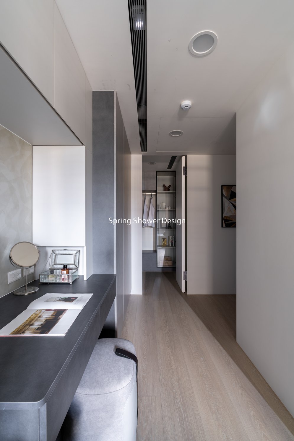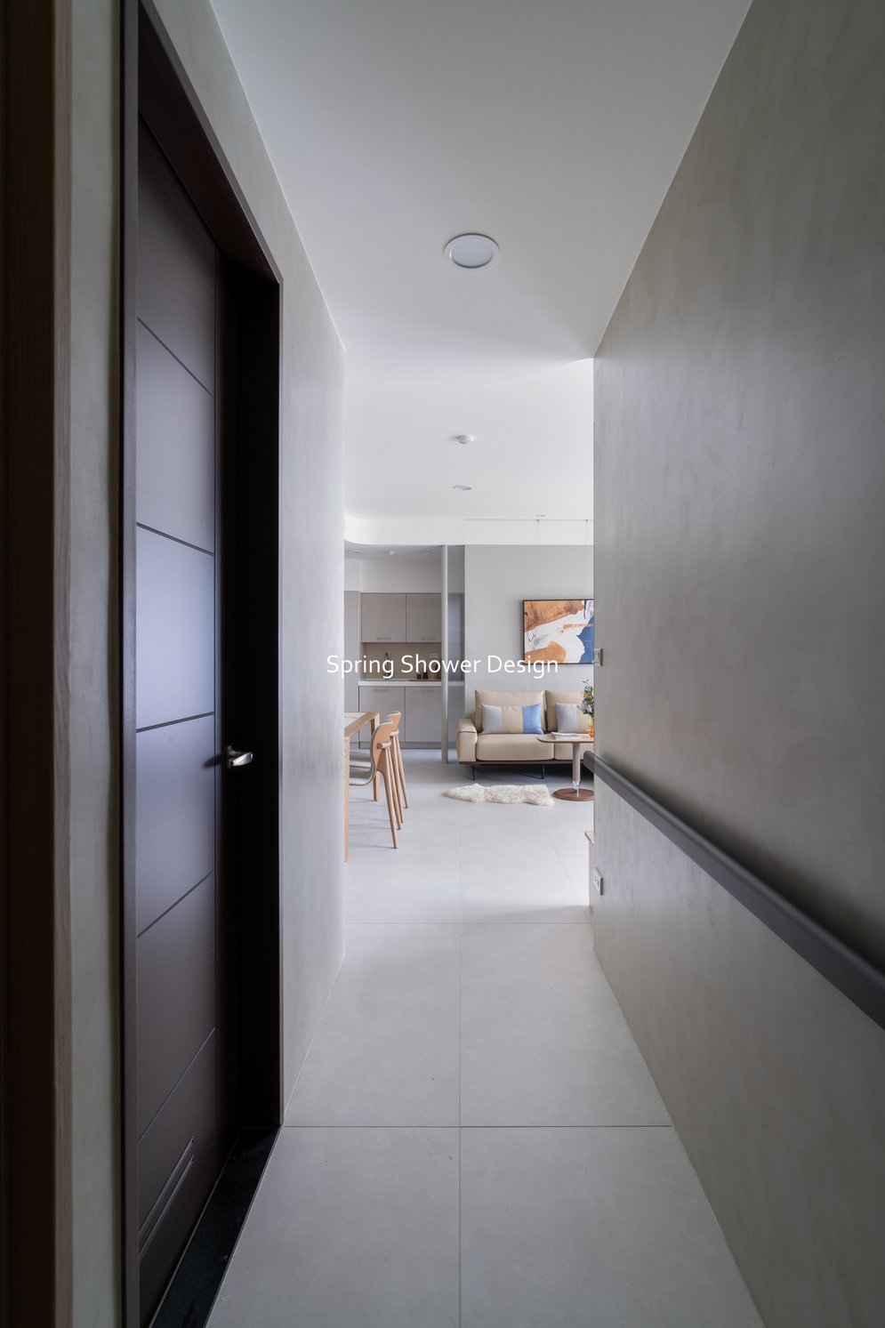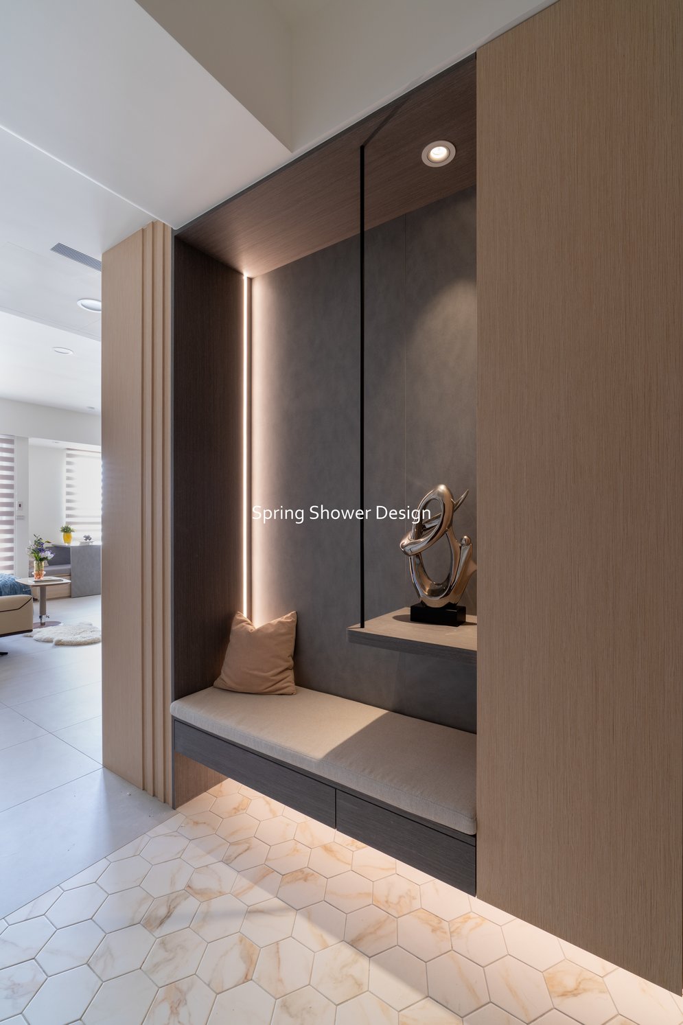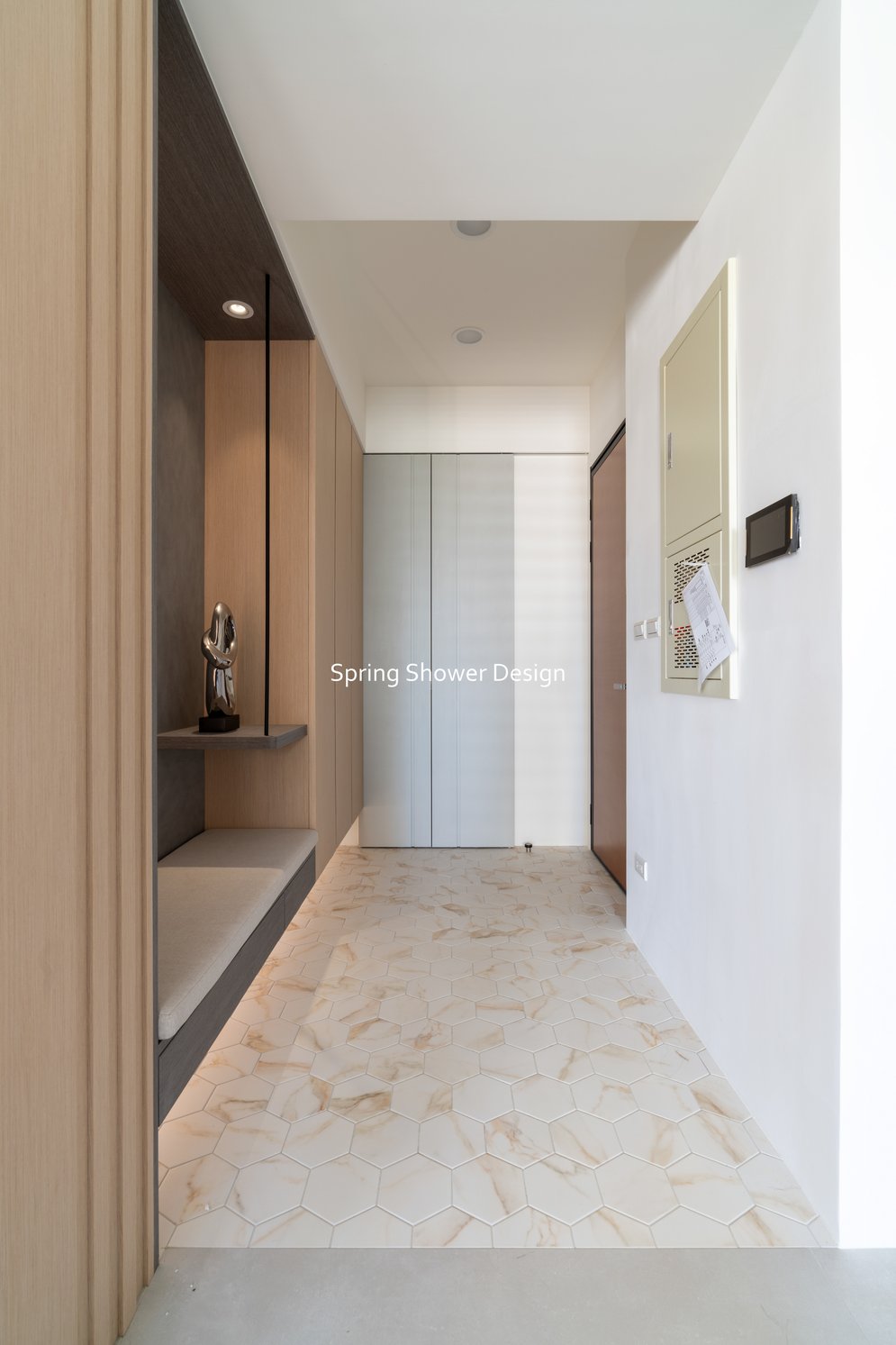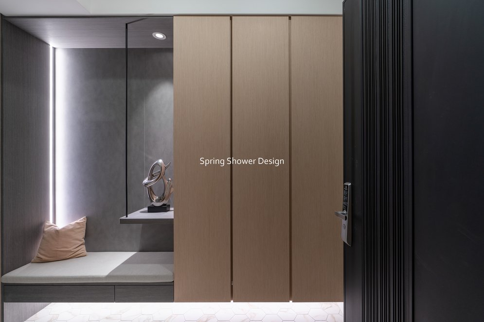 這是一個兩戶合併的家,我們保留三間衛浴與兩個廚房,重新規劃格局與收納,讓公共空間方正明亮,私領域舒適實用。玄關空間巧妙利用原本的長型格局,一分為二:前半部作為衣帽間,與新玄關互通,後半部成為主臥更衣室。隔間採用陶粒牆,增加隔音效果;鞋櫃、穿鞋椅與隱藏鏡面設計,兼顧美觀與使用便利。