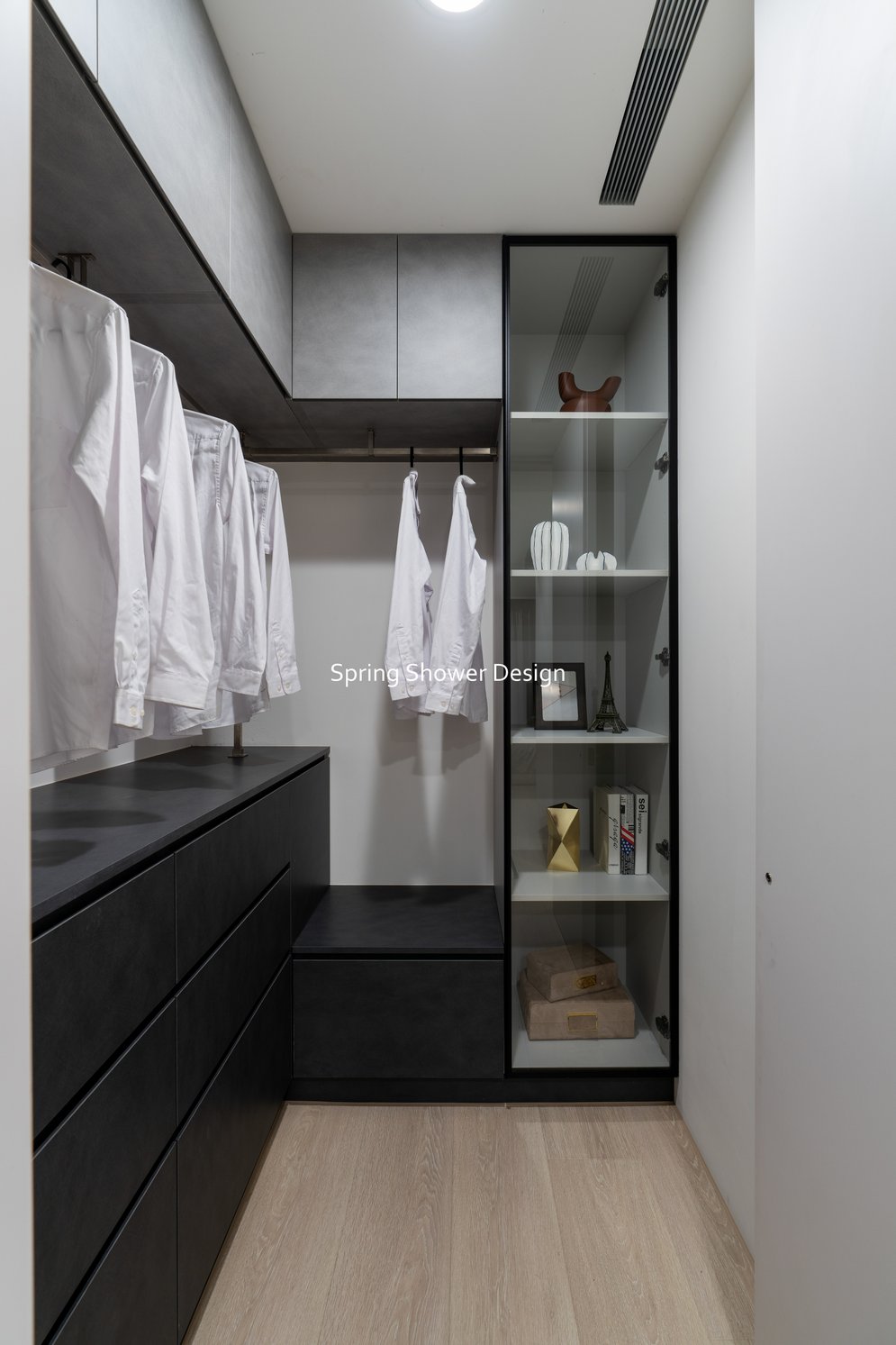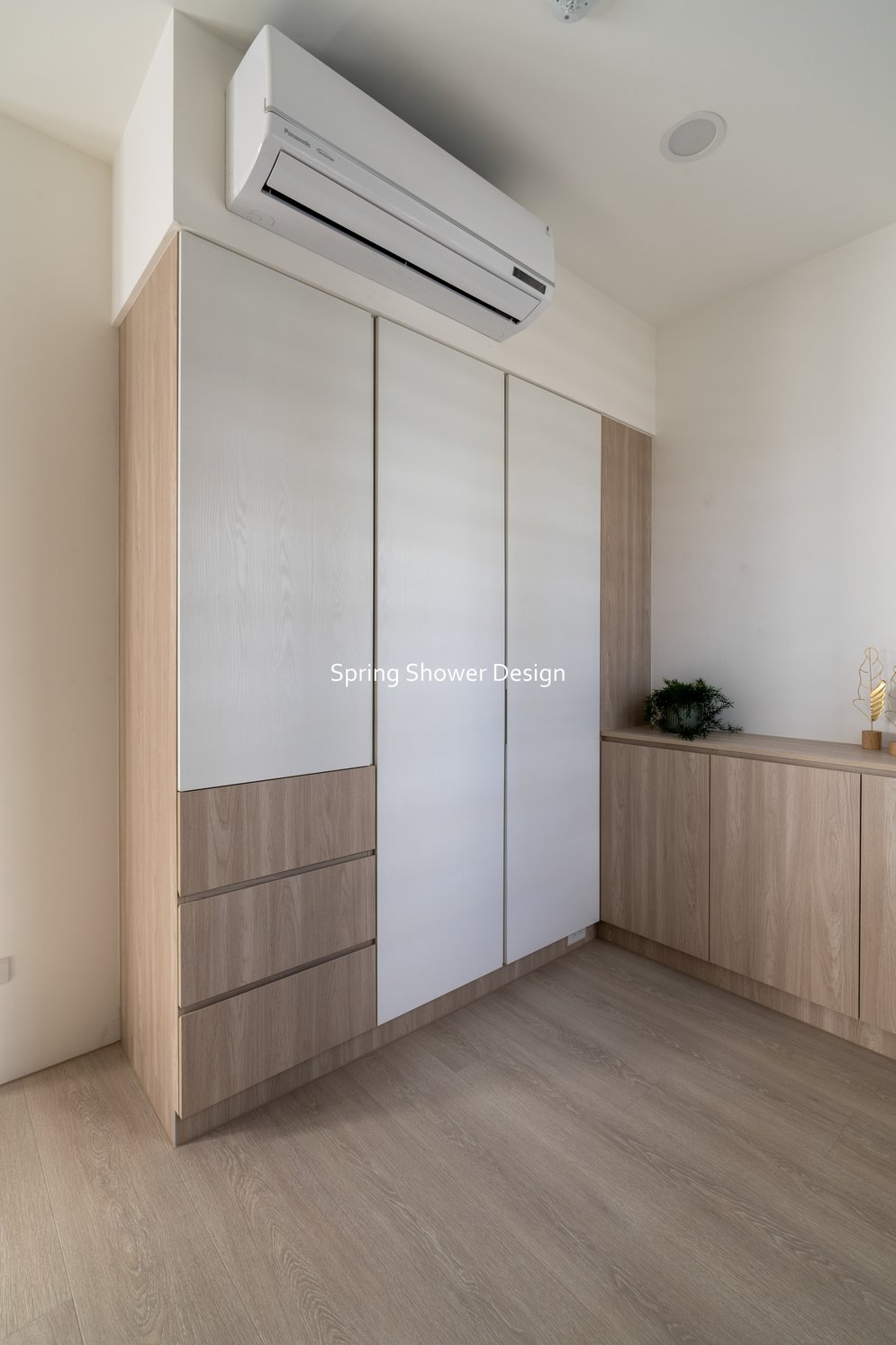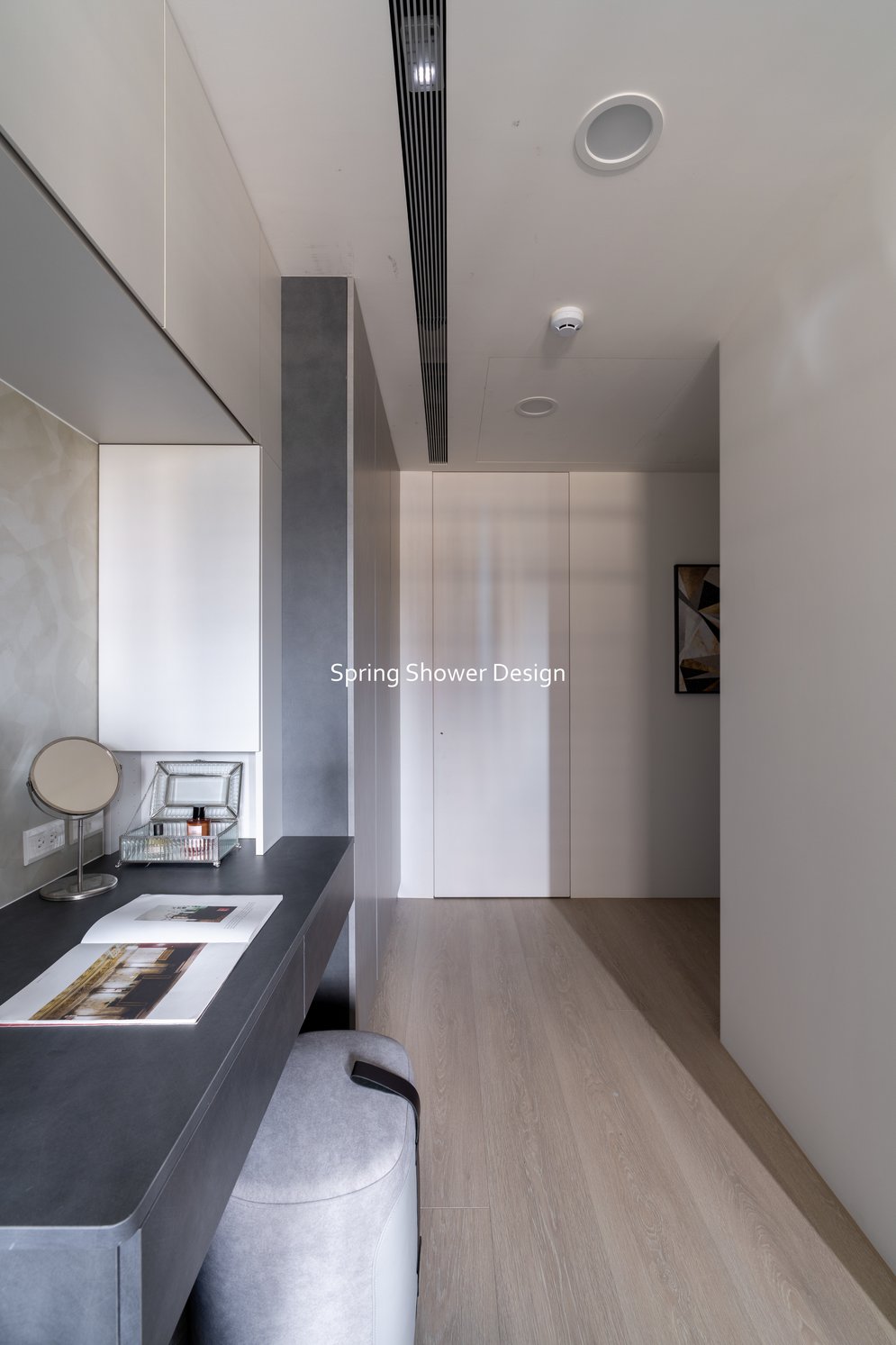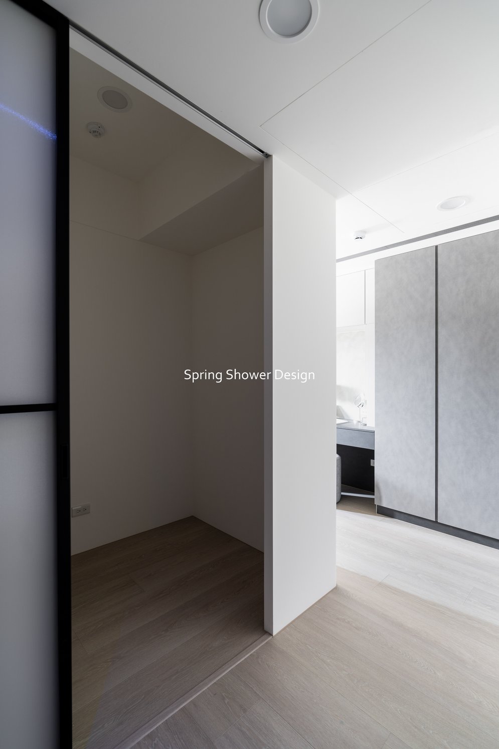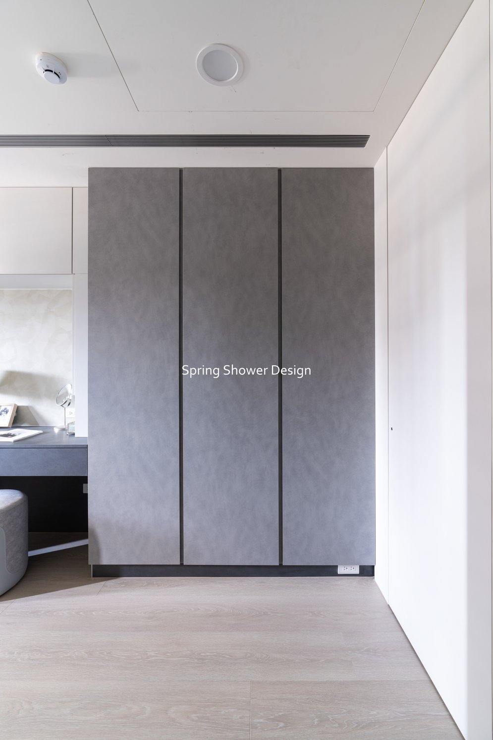 這是一個兩戶合併的家,我們保留三間衛浴與兩個廚房,重新規劃格局與收納,讓公共空間方正明亮,私領域舒適實用。玄關空間巧妙利用原本的長型格局,一分為二:前半部作為衣帽間,與新玄關互通,後半部成為主臥更衣室。隔間採用陶粒牆,增加隔音效果;鞋櫃、穿鞋椅與隱藏鏡面設計,兼顧美觀與使用便利。