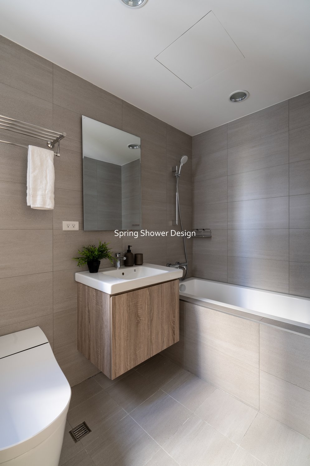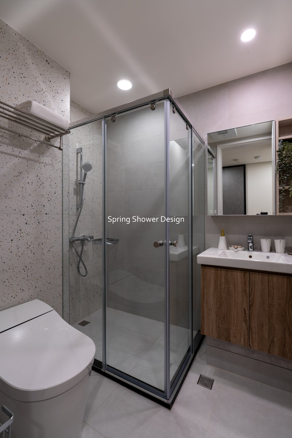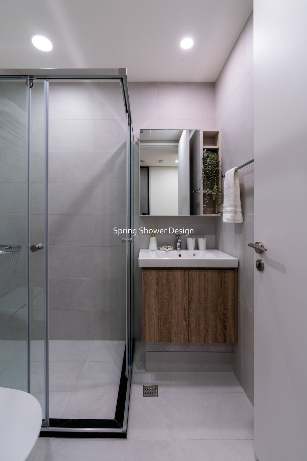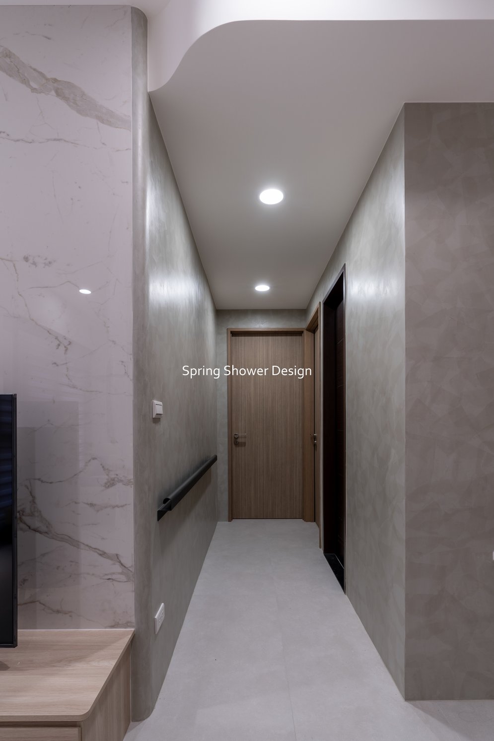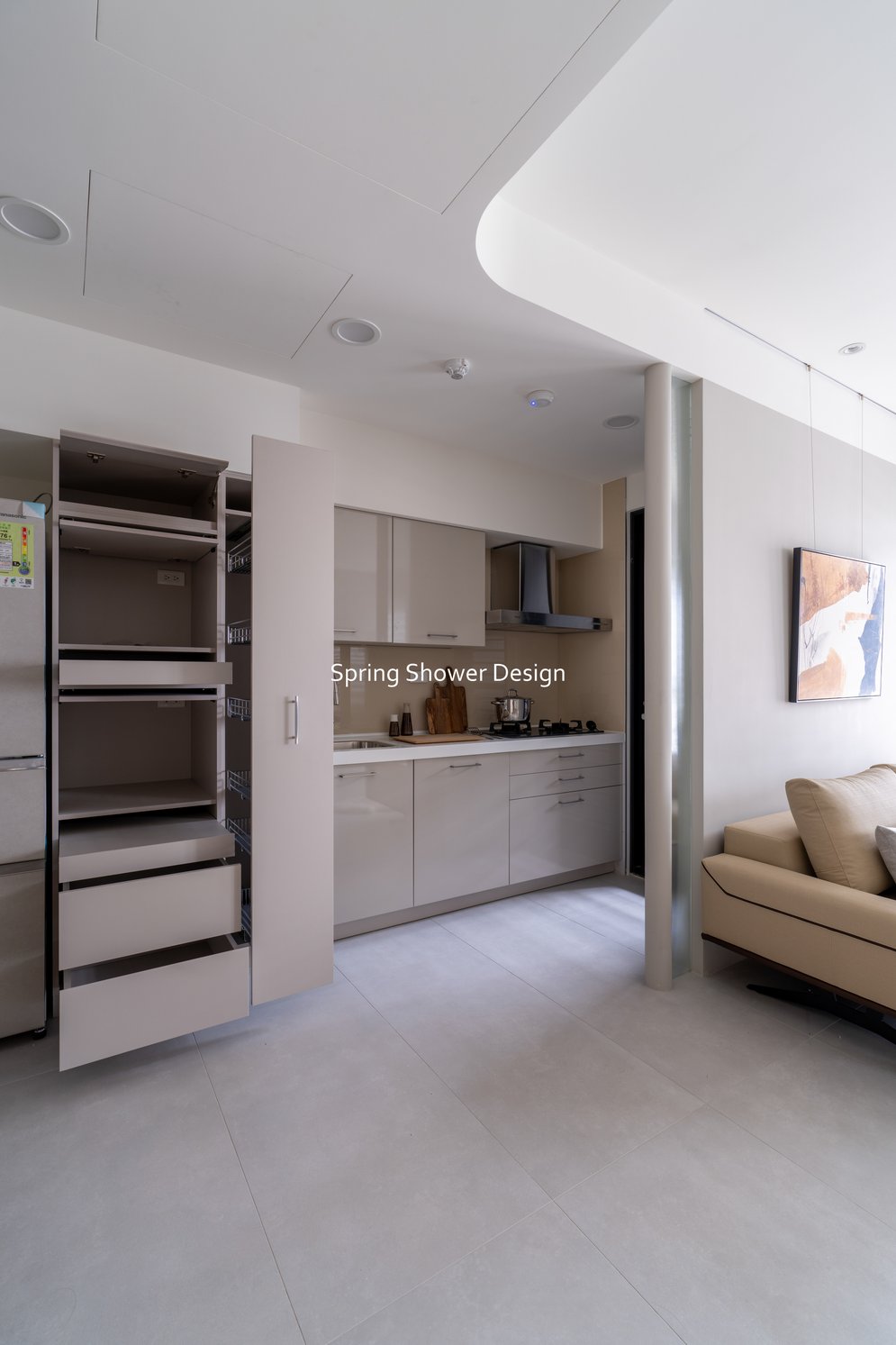 這是一個兩戶合併的家,我們保留三間衛浴與兩個廚房,重新規劃格局與收納,讓公共空間方正明亮,私領域舒適實用。玄關空間巧妙利用原本的長型格局,一分為二:前半部作為衣帽間,與新玄關互通,後半部成為主臥更衣室。隔間採用陶粒牆,增加隔音效果;鞋櫃、穿鞋椅與隱藏鏡面設計,兼顧美觀與使用便利。