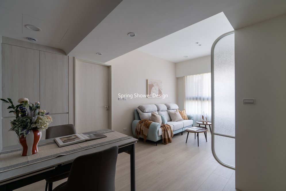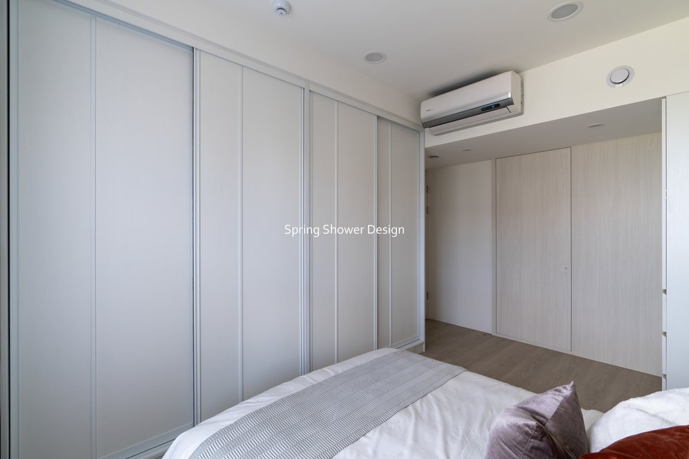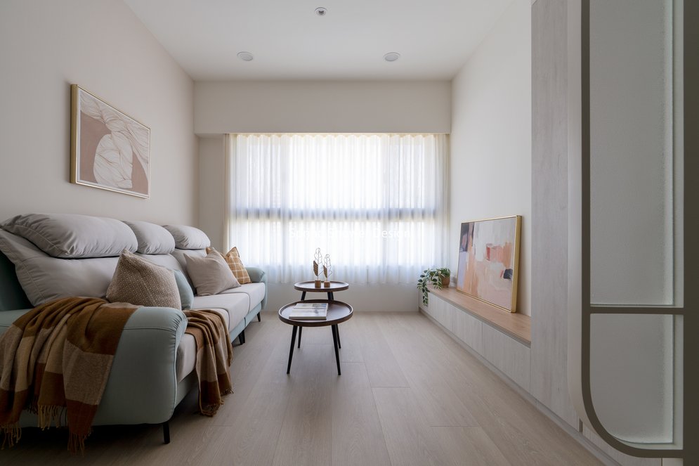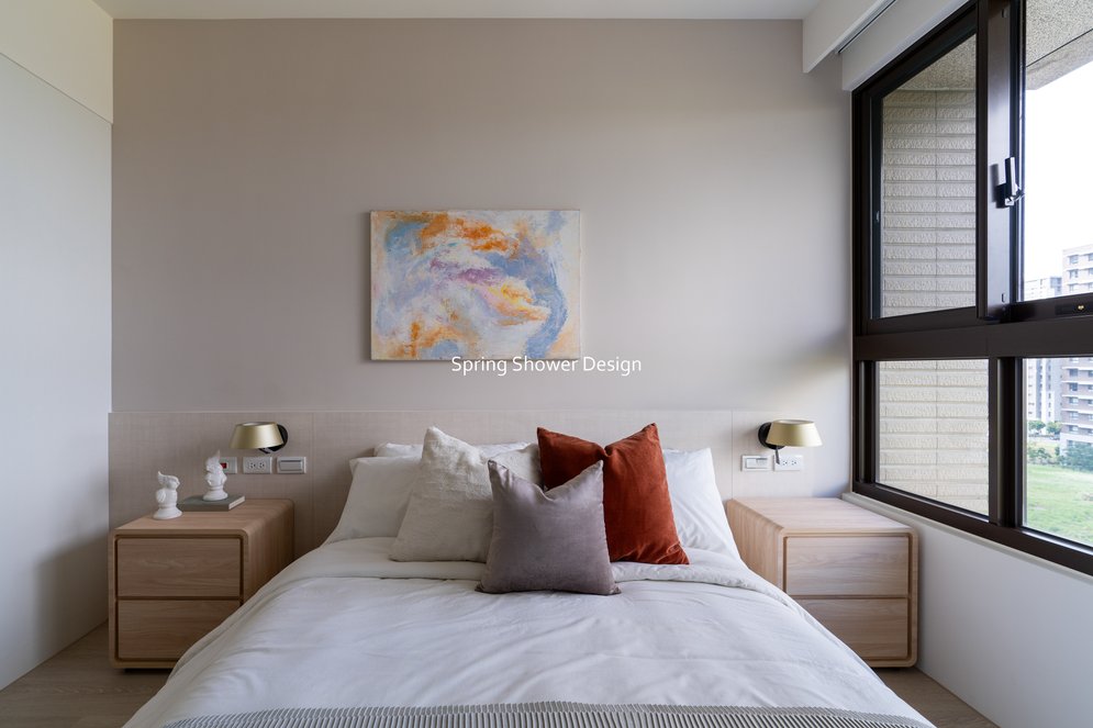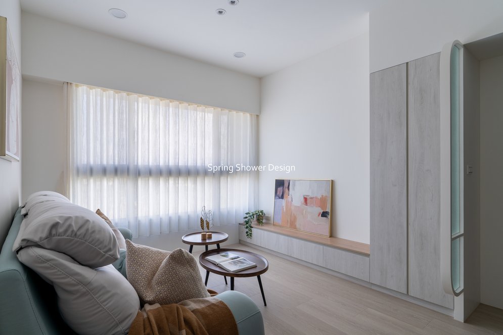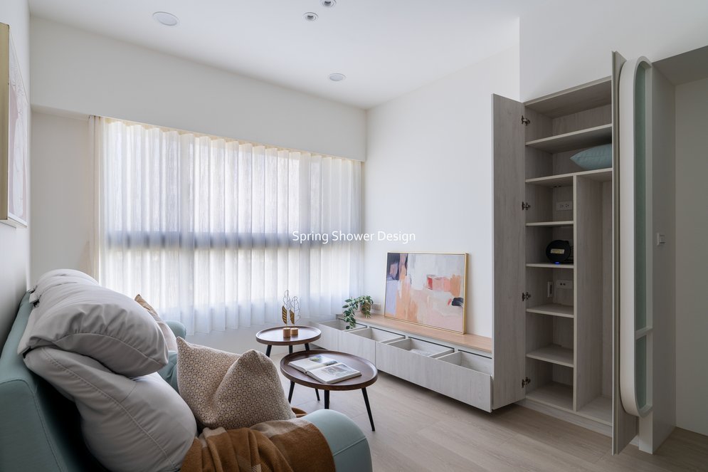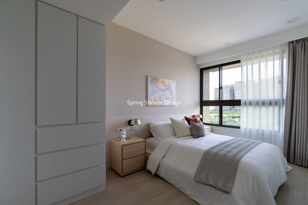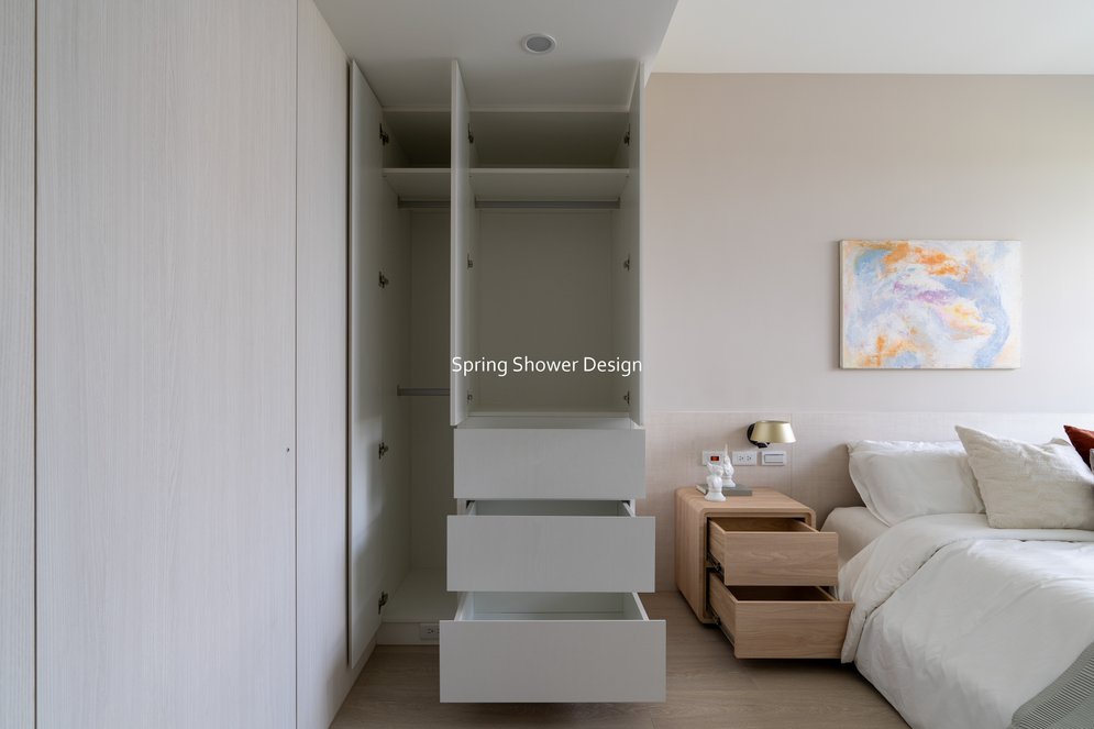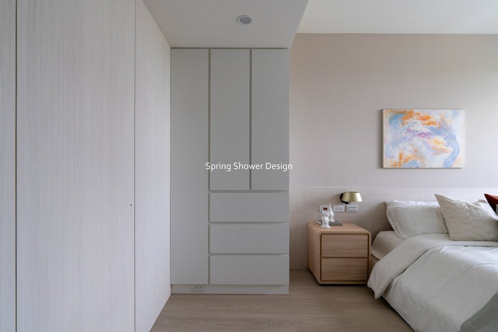 主臥以布織紋床頭板和奶茶色營造溫暖氛圍,衣櫃分區收納,海量空間方便整理衣物。客廳採淡粉色系搭配簡約線板,視覺明亮溫馨,電視牆整合影音與吸塵器收納,銀霞玻璃屏風巧妙引光又遮視線,兼具設計感與實用性。