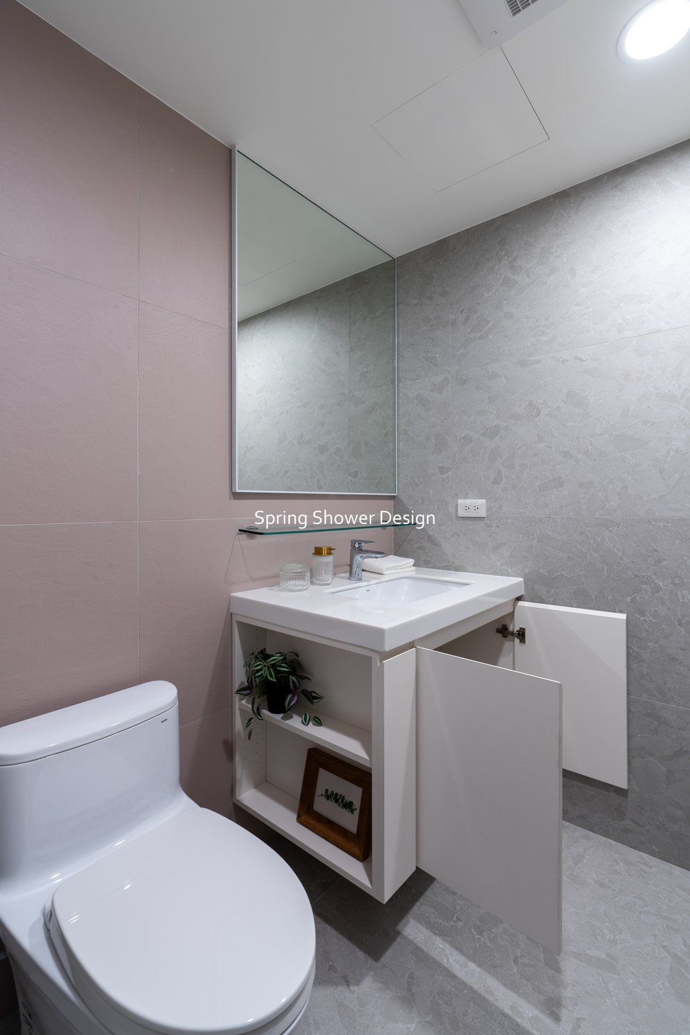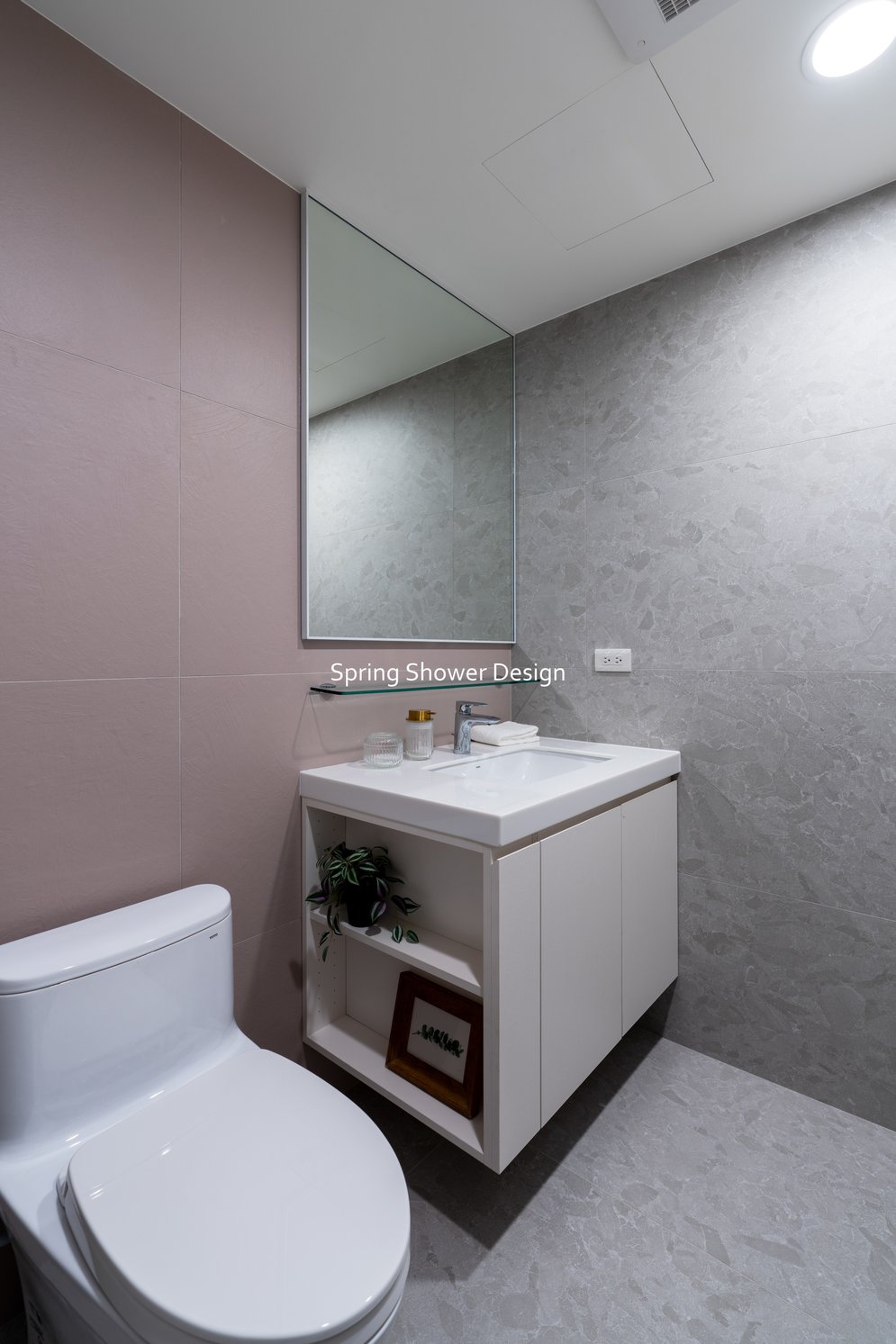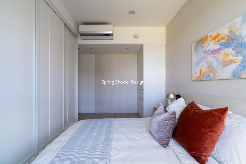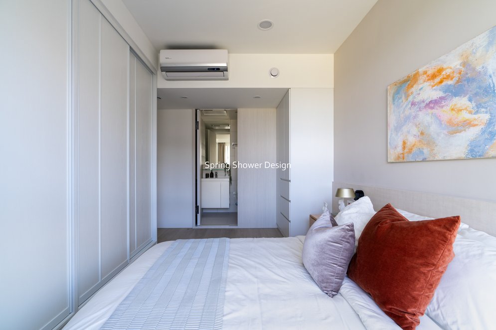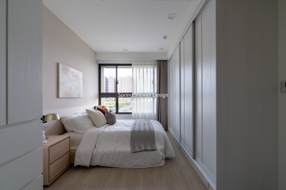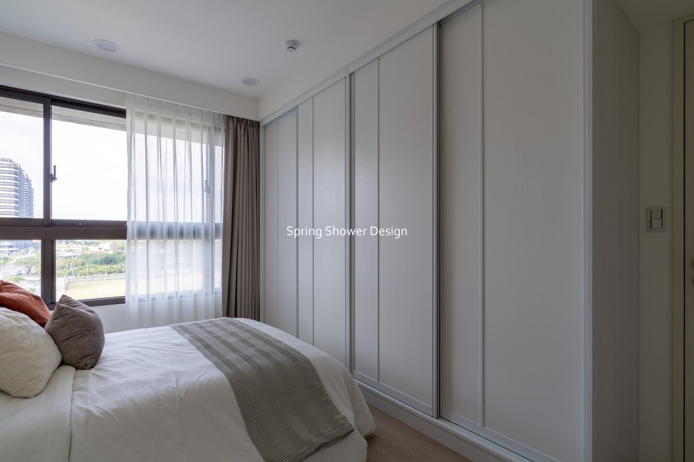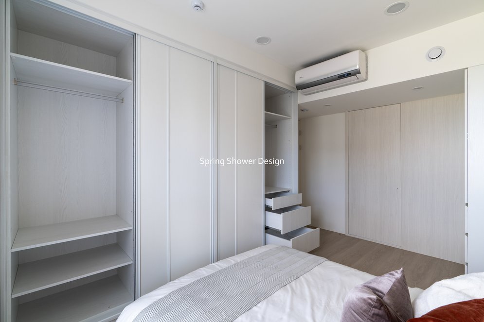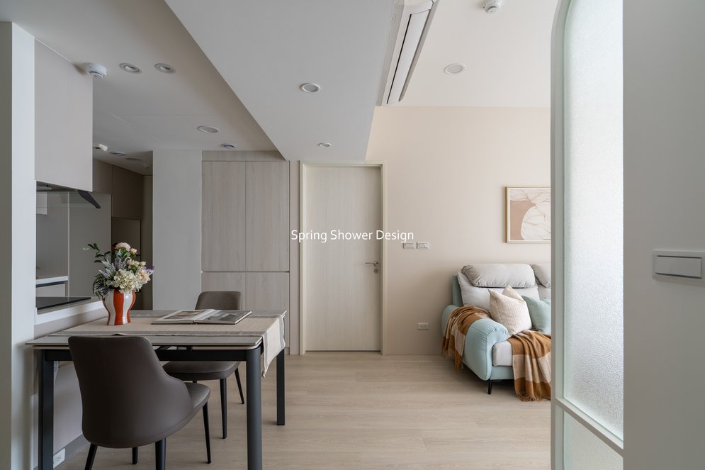 主臥以布織紋床頭板和奶茶色營造溫暖氛圍,衣櫃分區收納,海量空間方便整理衣物。客廳採淡粉色系搭配簡約線板,視覺明亮溫馨,電視牆整合影音與吸塵器收納,銀霞玻璃屏風巧妙引光又遮視線,兼具設計感與實用性。