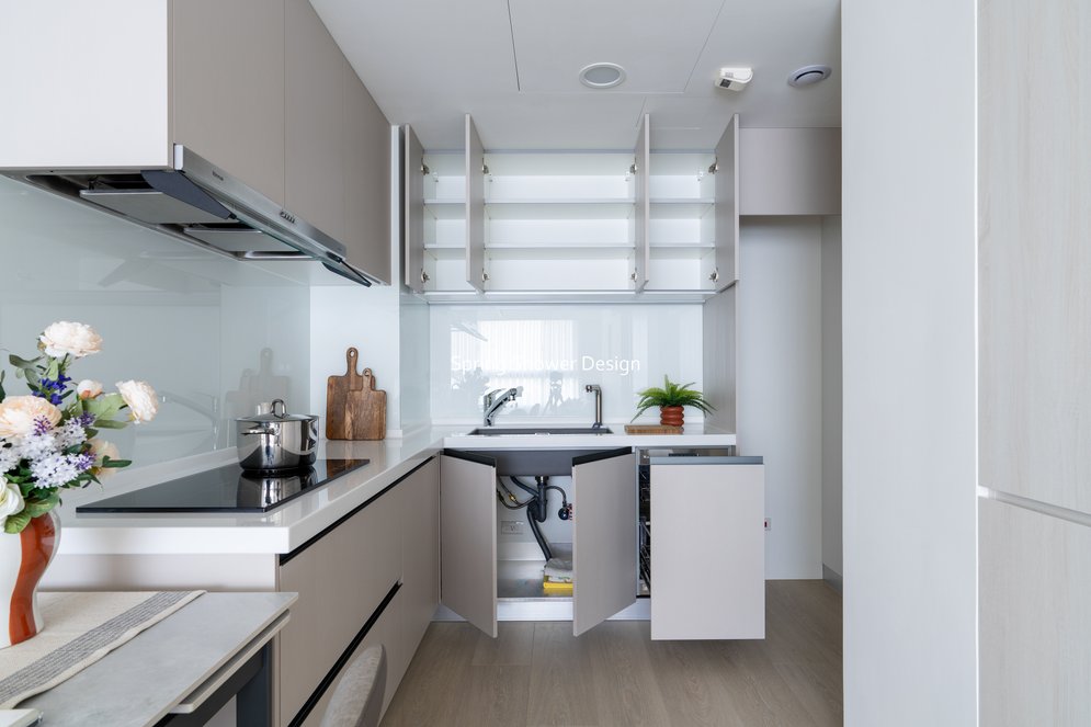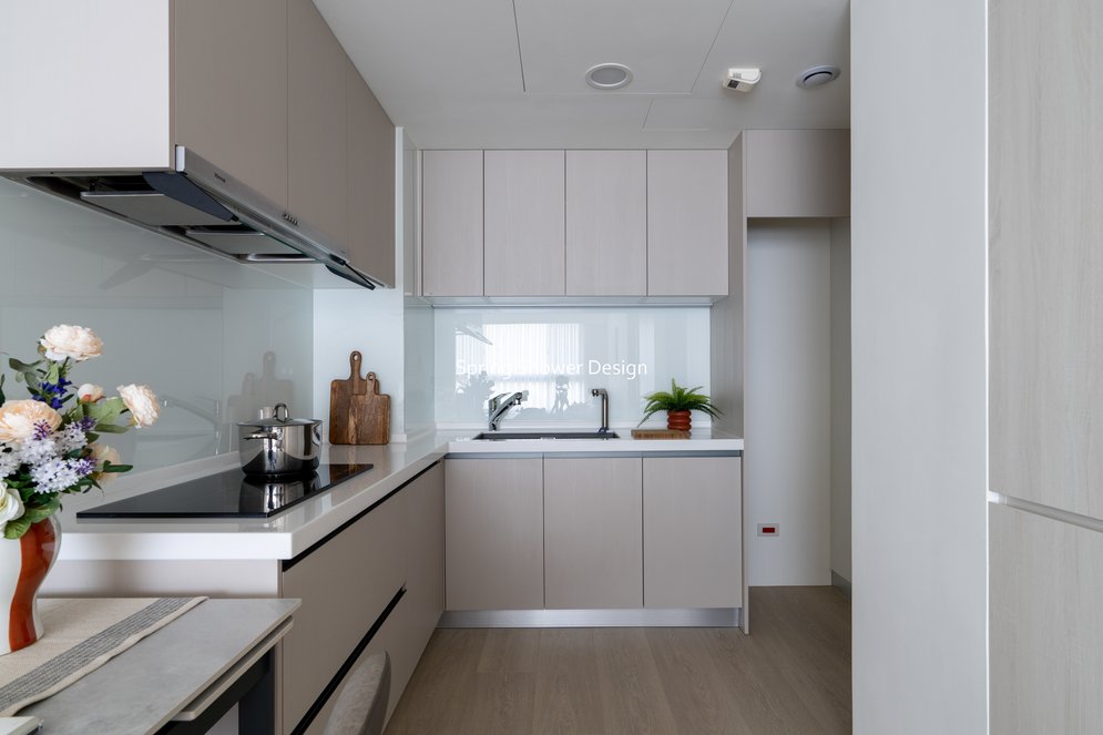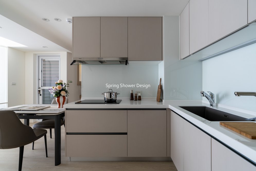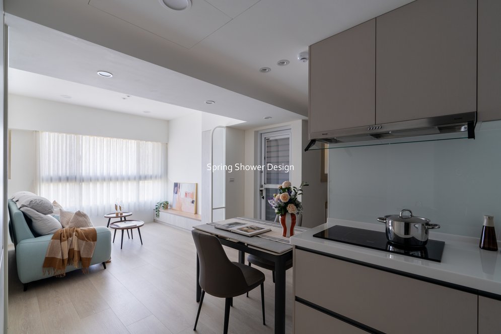 這間屋齡10年的中古屋,原本磁磚澎供、漏水,收納不足、格局不理想。我們重新規劃空間,玄關以陶粒牆分界,不僅增加收納,也改善開門見灶的風水問題;廚房從一字型改為L型,水槽與操作空間加大,搭配屋主喜愛的IH爐,兼具實用與美觀。