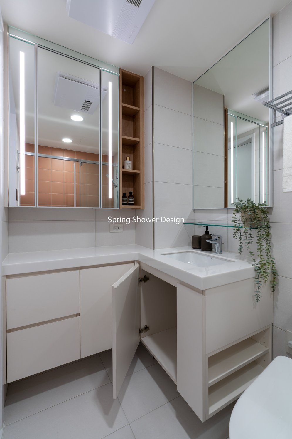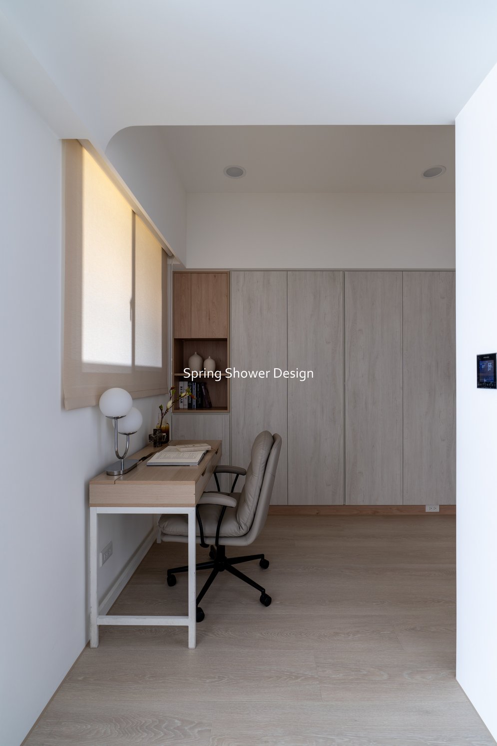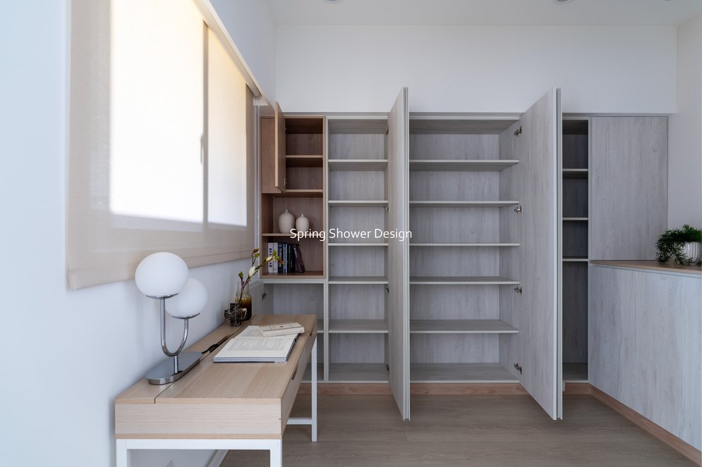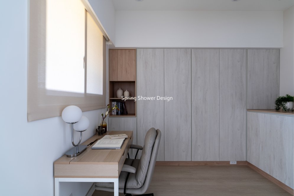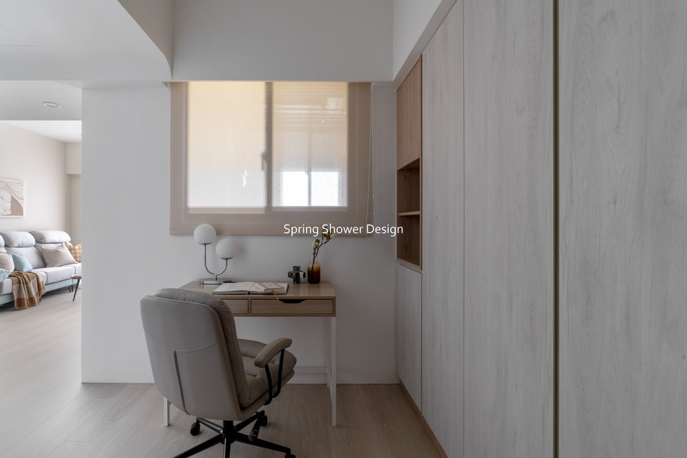 浴室整合為主浴與半套廁所,乾濕分離、收納充足,並以簡潔線條與明亮材質提升質感。多功能室改為書房與佛堂,保持開放動線,窗邊書桌與L型收納櫃讓空間更舒適,佛堂區域設計簡潔、燈光柔和。