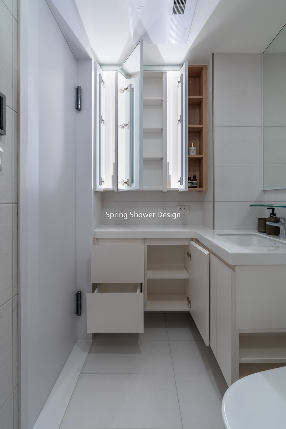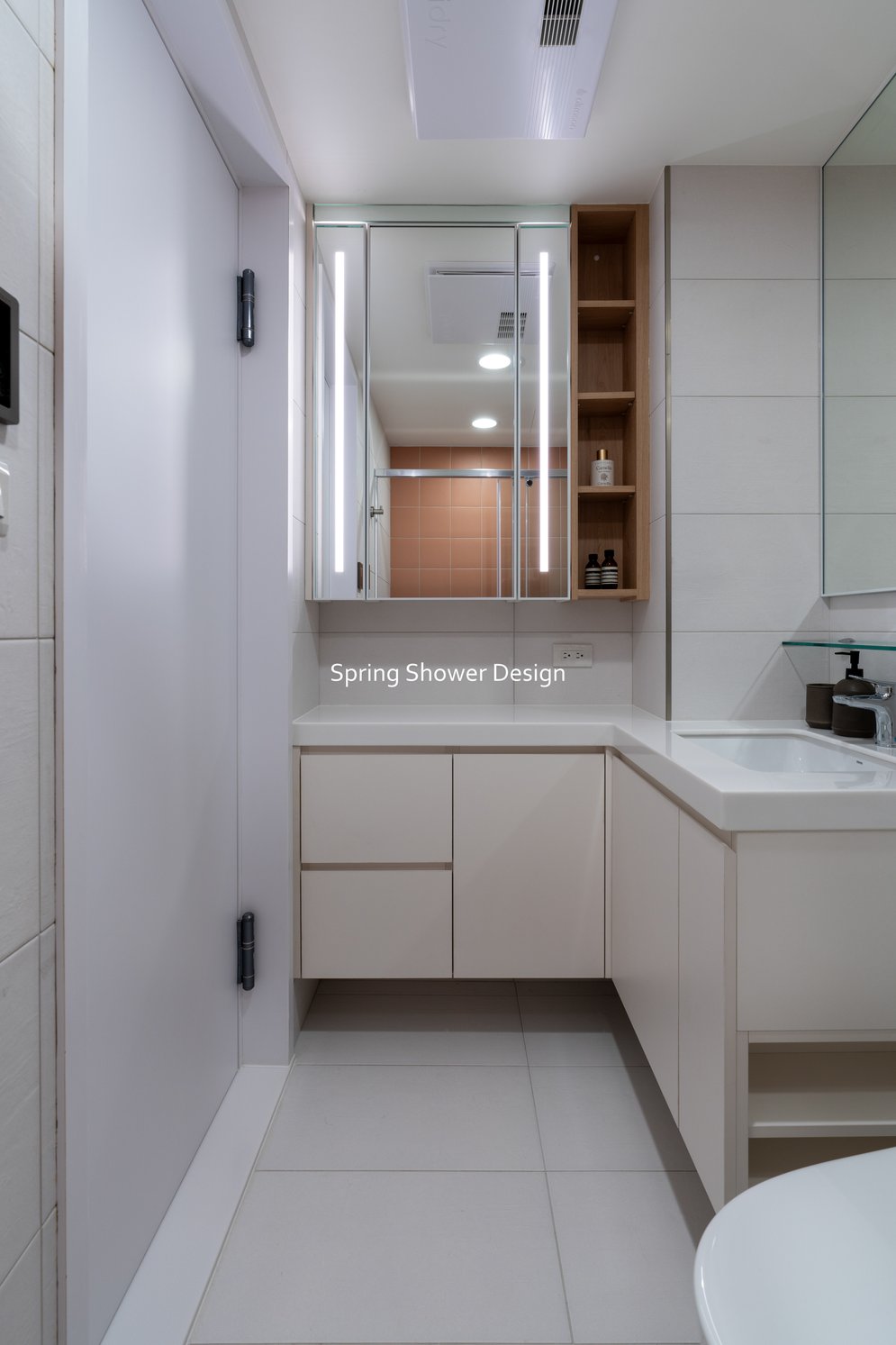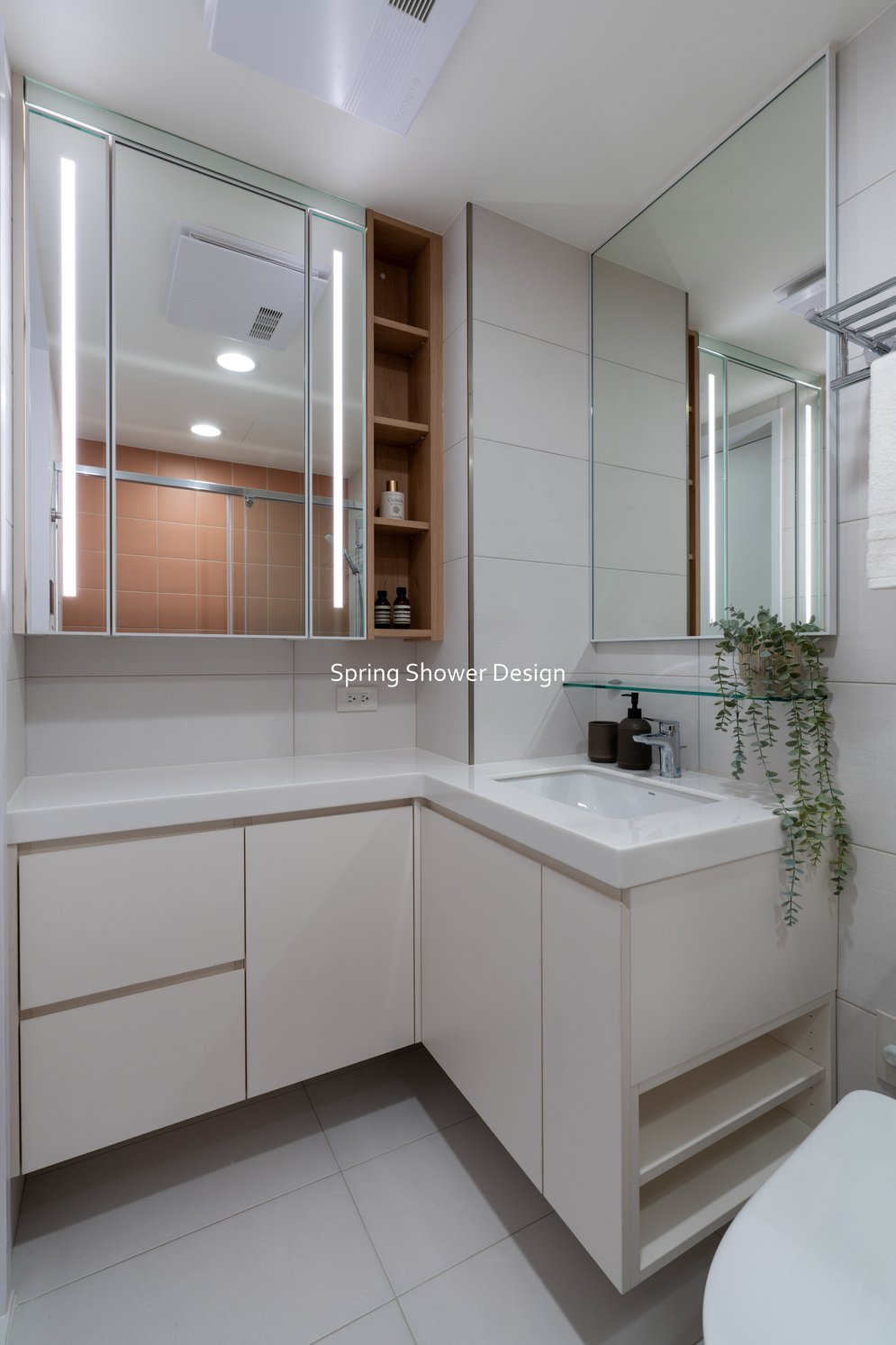 浴室整合為主浴與半套廁所,乾濕分離、收納充足,並以簡潔線條與明亮材質提升質感。多功能室改為書房與佛堂,保持開放動線,窗邊書桌與L型收納櫃讓空間更舒適,佛堂區域設計簡潔、燈光柔和。