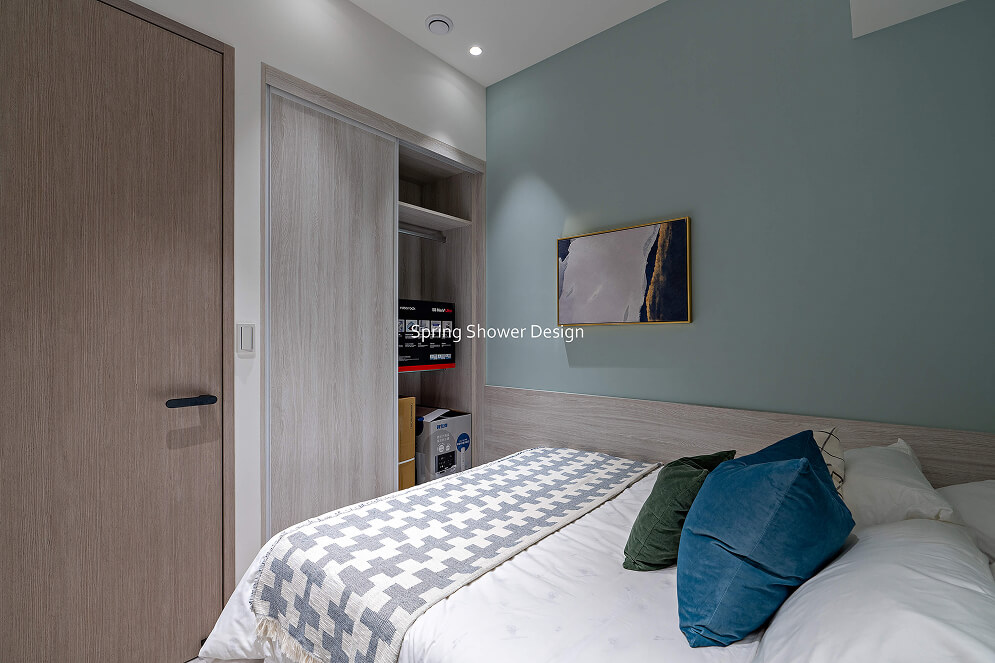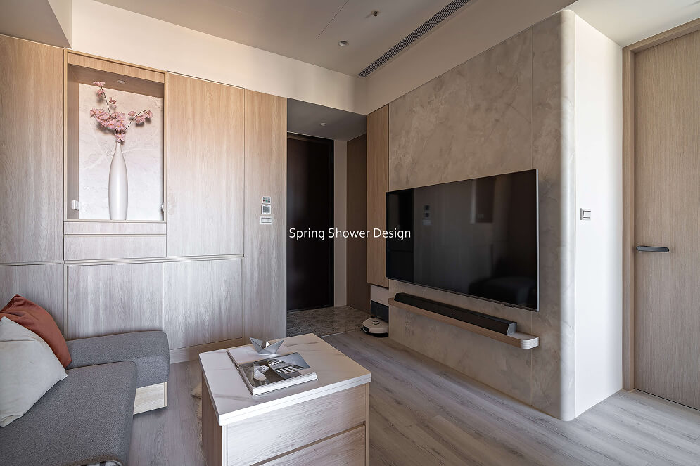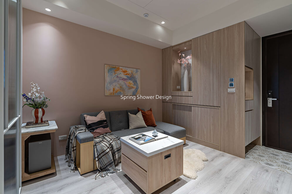 12.6坪的家,要住夫妻和一個就讀小學的兒子,一家三口。屋主在預售屋客變階段就找春雨團隊合作,我們調整了電視牆的位置,讓小孩房能多出一組衣櫃,並利用玄關轉角設計收納櫃,讓小坪數空間發揮到最大坪效。