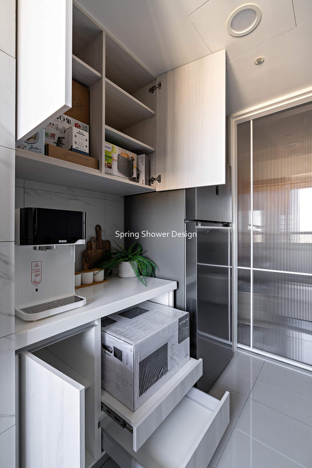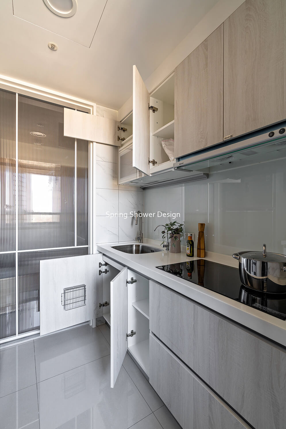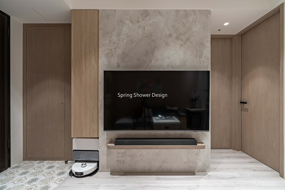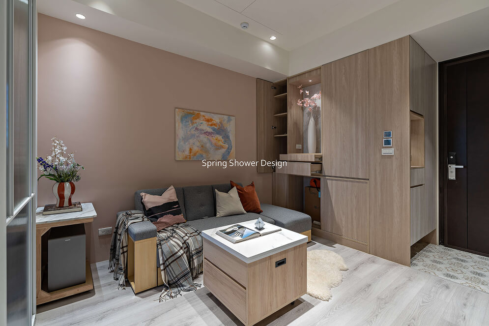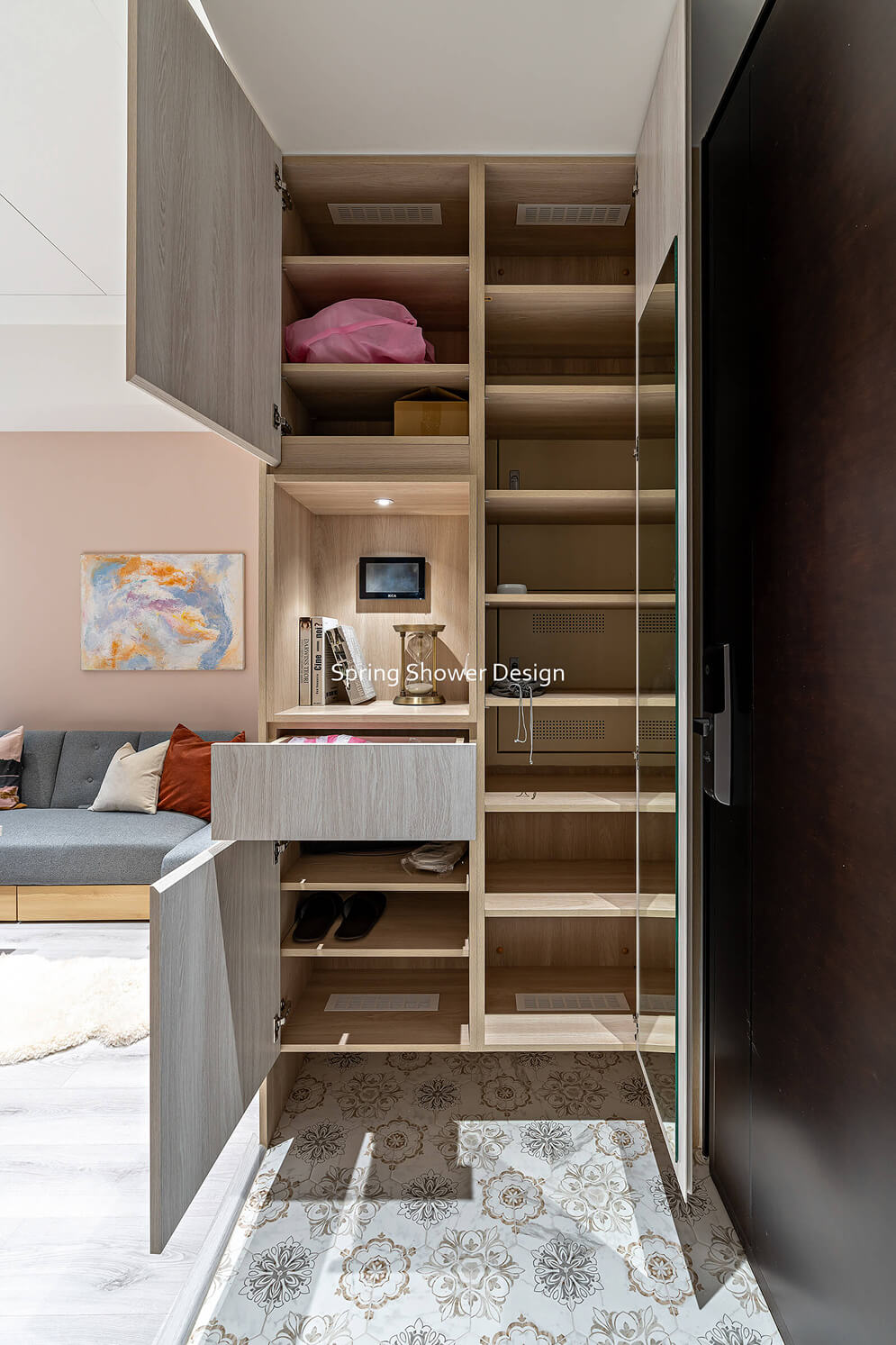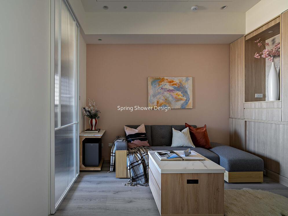公共空間以淡粉色搭配木紋,營造溫暖氛圍;從玄關轉折到客廳的「L型組織收納」,透過雙面櫃結合開放格,讓每個面向都順手好用。延伸側面則滿足屋主需求,規劃了「神明桌設計」,並挑選石紋背板,與整體空間風格完美融合。電視牆使用「淺灰白石紋美耐板」,增添現代感並點亮空間。廚房門改為長虹玻璃拉門,讓光線延伸至客廳,增添通透感。