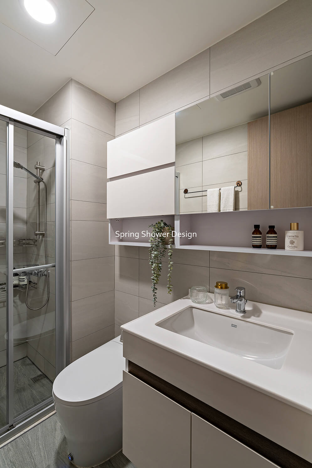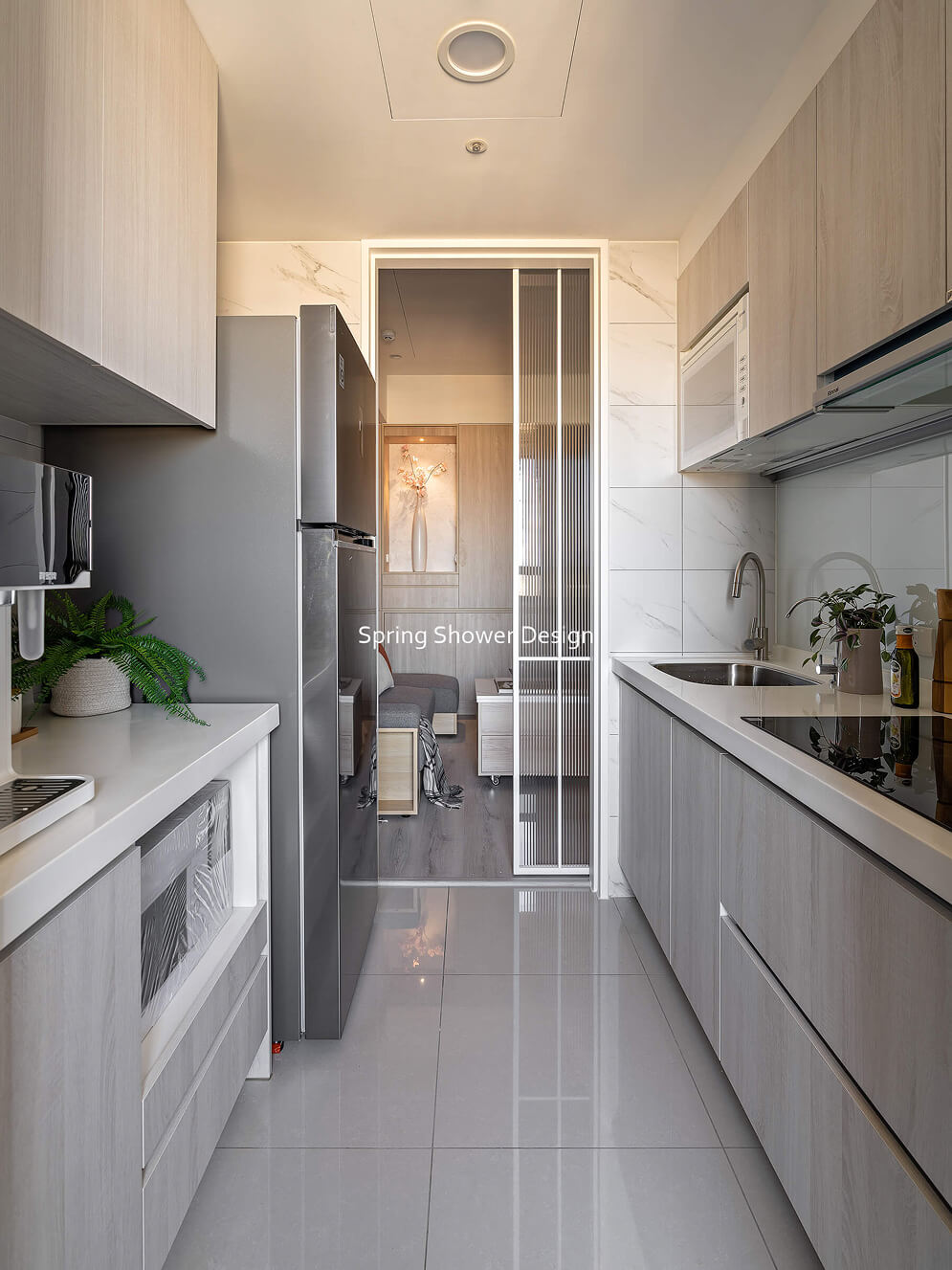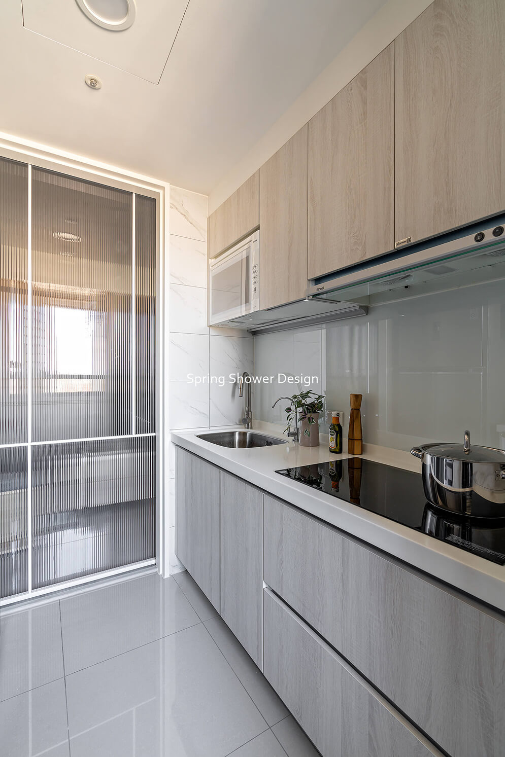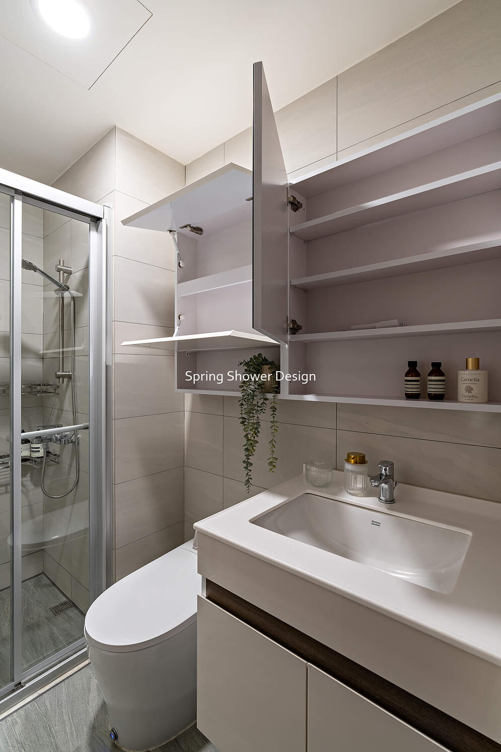 公共空間以淡粉色搭配木紋,營造溫暖氛圍;從玄關轉折到客廳的「L型組織收納」,透過雙面櫃結合開放格,讓每個面向都順手好用。延伸側面則滿足屋主需求,規劃了「神明桌設計」,並挑選石紋背板,與整體空間風格完美融合。電視牆使用「淺灰白石紋美耐板」,增添現代感並點亮空間。廚房門改為長虹玻璃拉門,讓光線延伸至客廳,增添通透感。