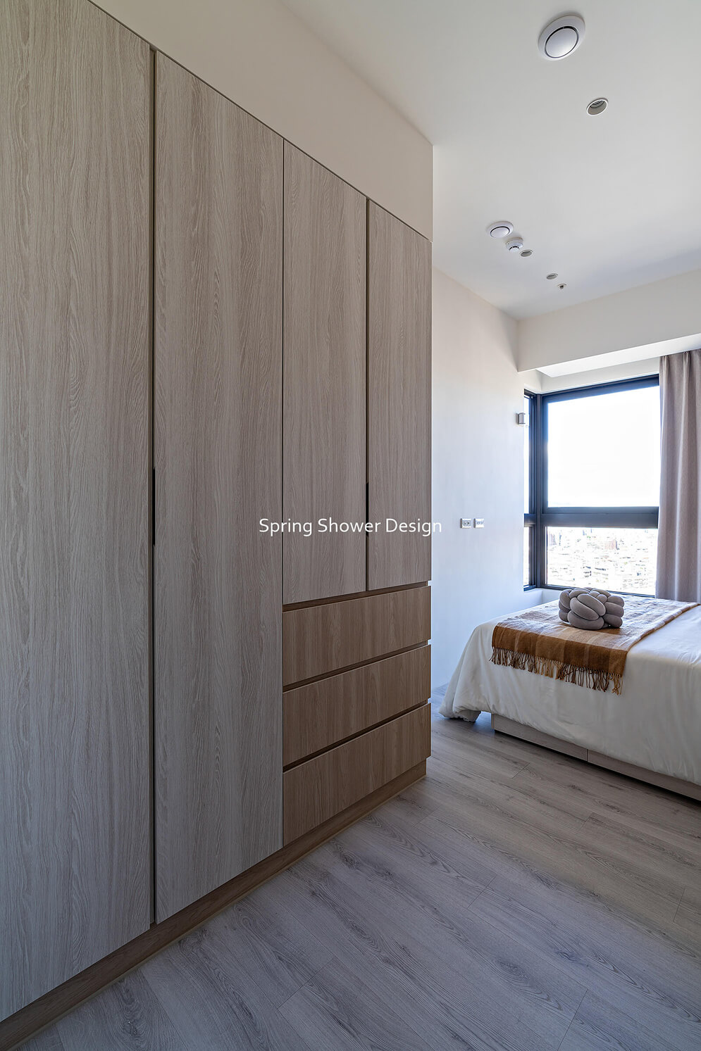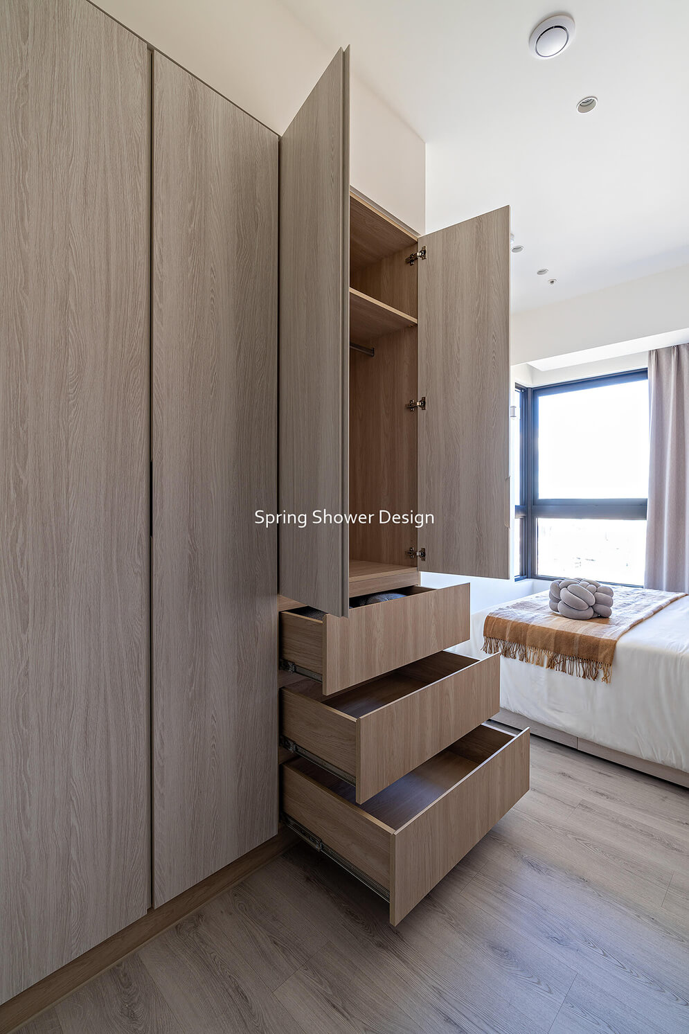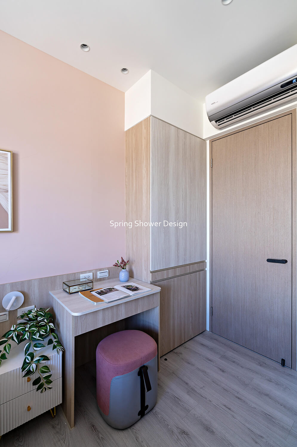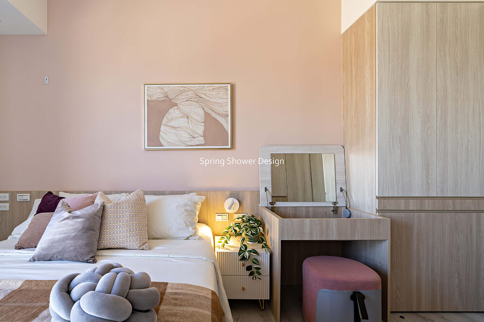 主臥室規劃「大衣櫃+上掀式化妝桌」,同時滿足收納、照明與摺衣動線;小孩房則預留雙人床、書桌插座與展示櫃,陪伴孩子一路成長。小坪數也能兼顧美感與實用,透過「格局微調+聰明收納」,就能住得舒適又溫馨!