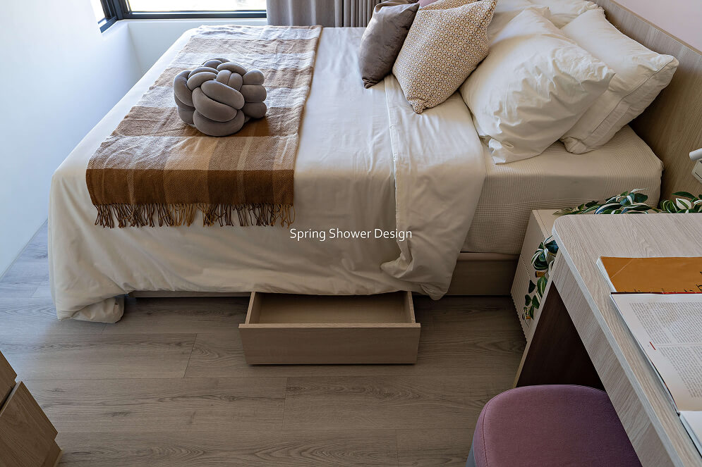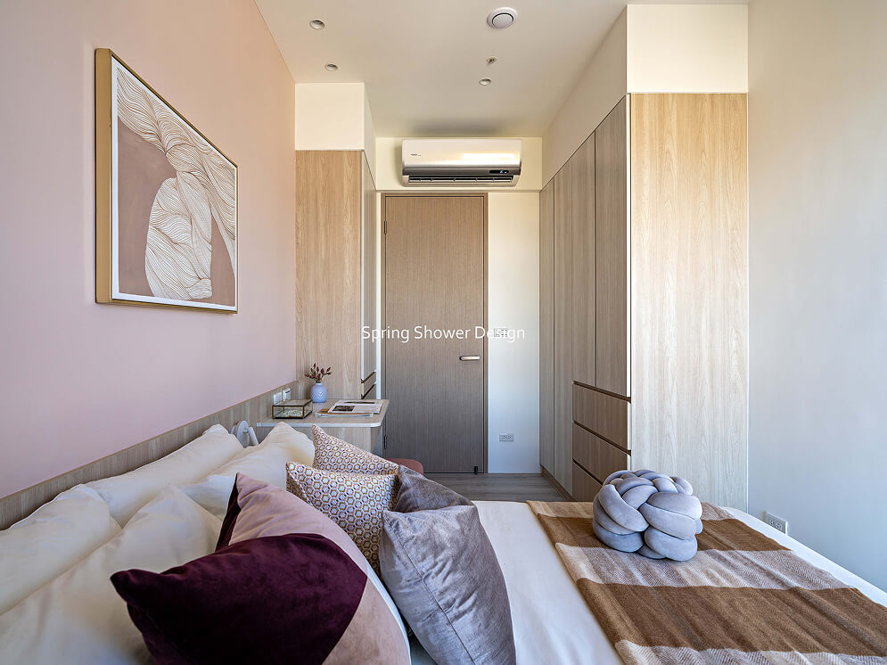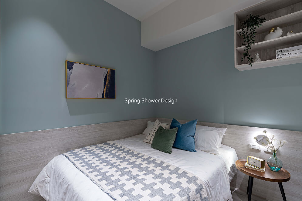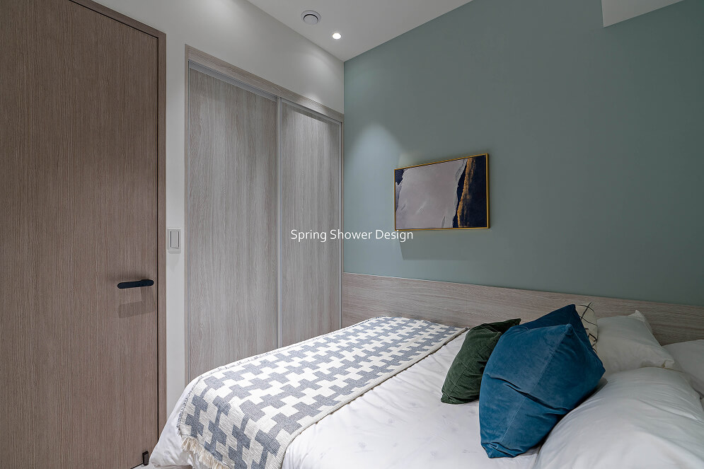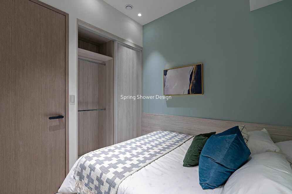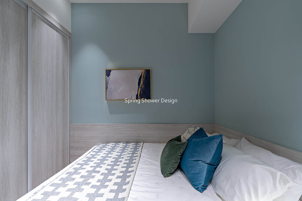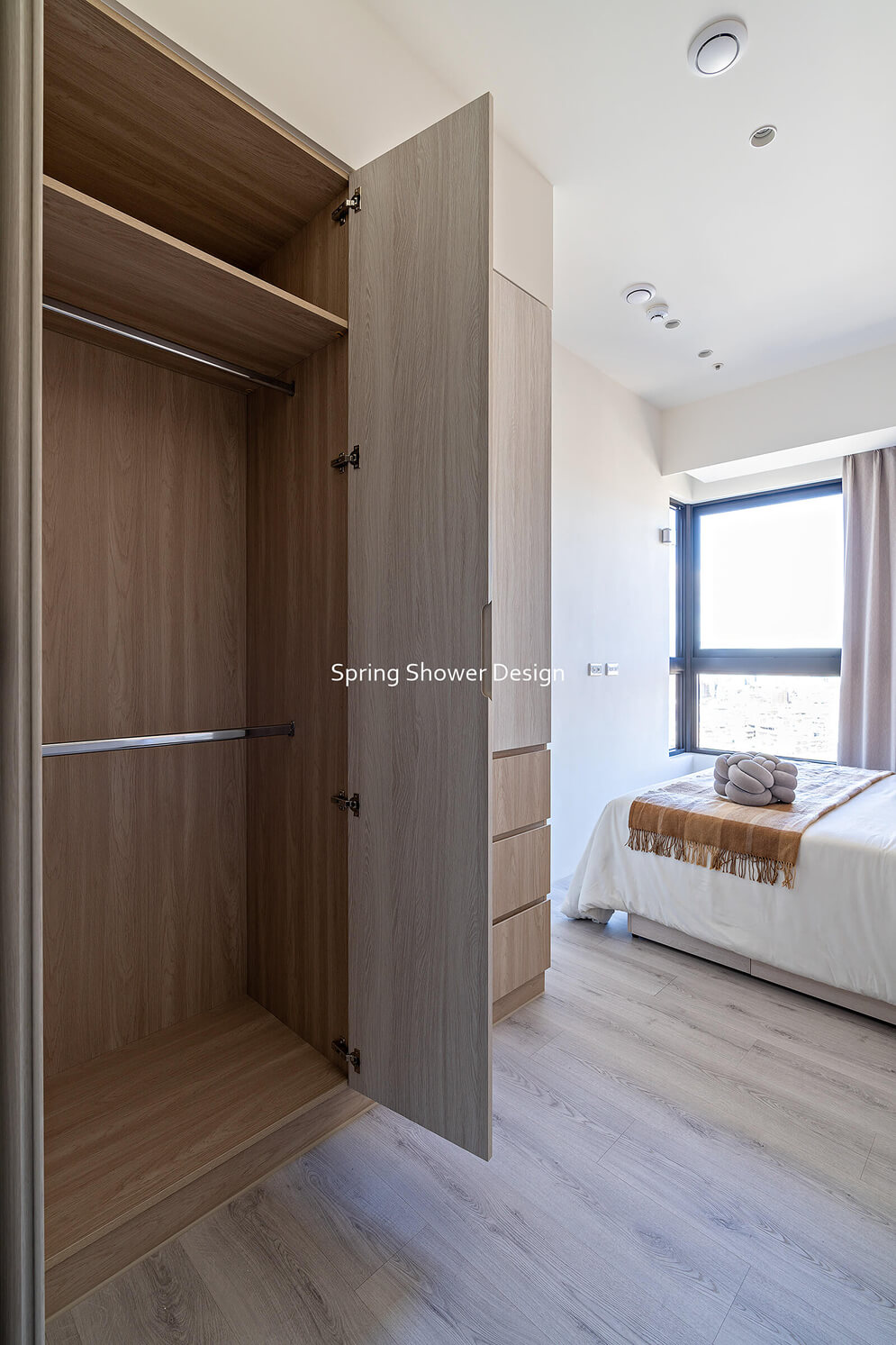 主臥室規劃「大衣櫃+上掀式化妝桌」,同時滿足收納、照明與摺衣動線;小孩房則預留雙人床、書桌插座與展示櫃,陪伴孩子一路成長。小坪數也能兼顧美感與實用,透過「格局微調+聰明收納」,就能住得舒適又溫馨!