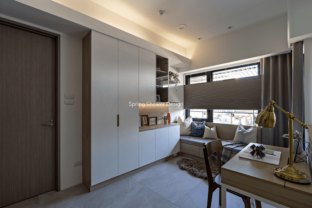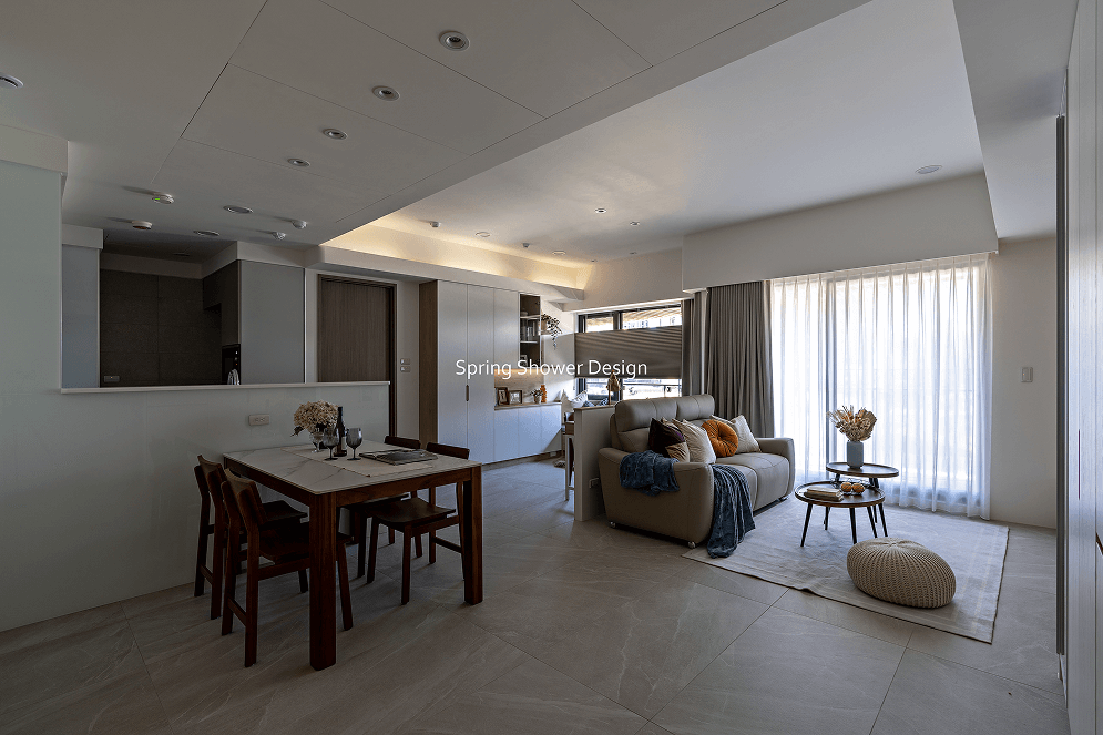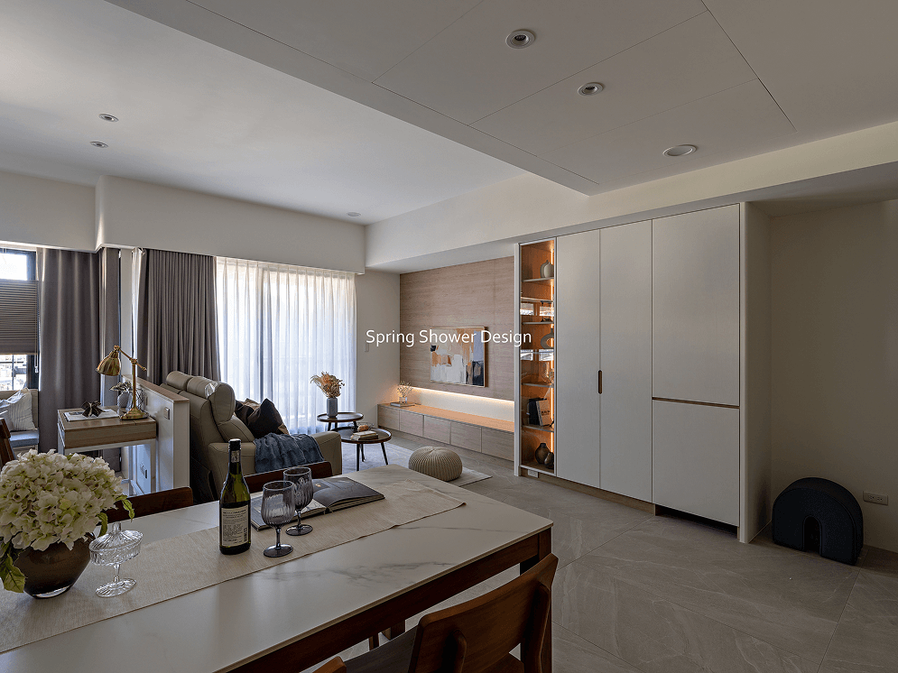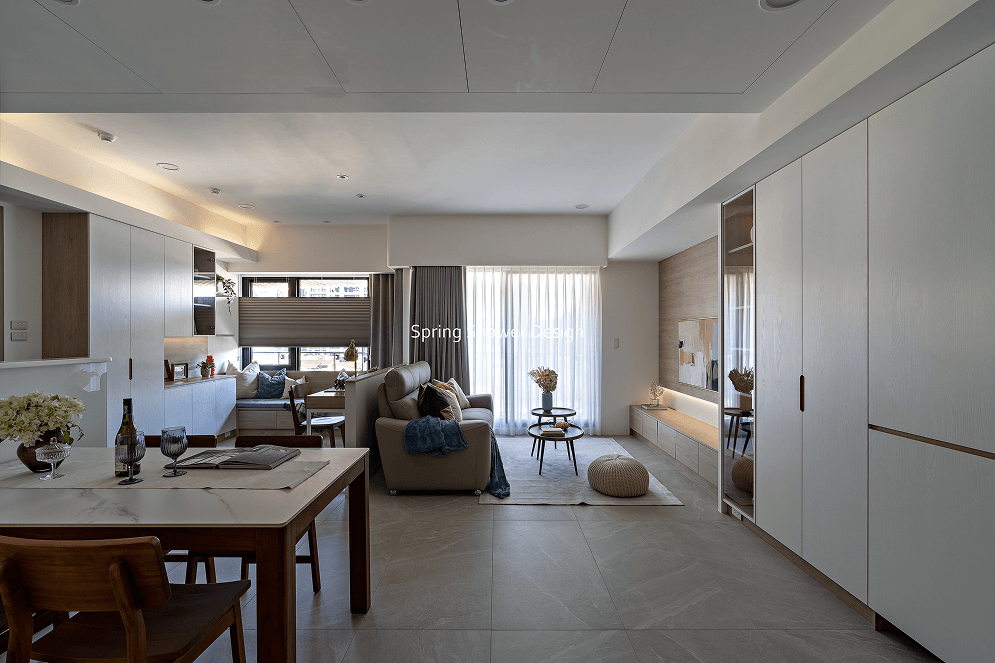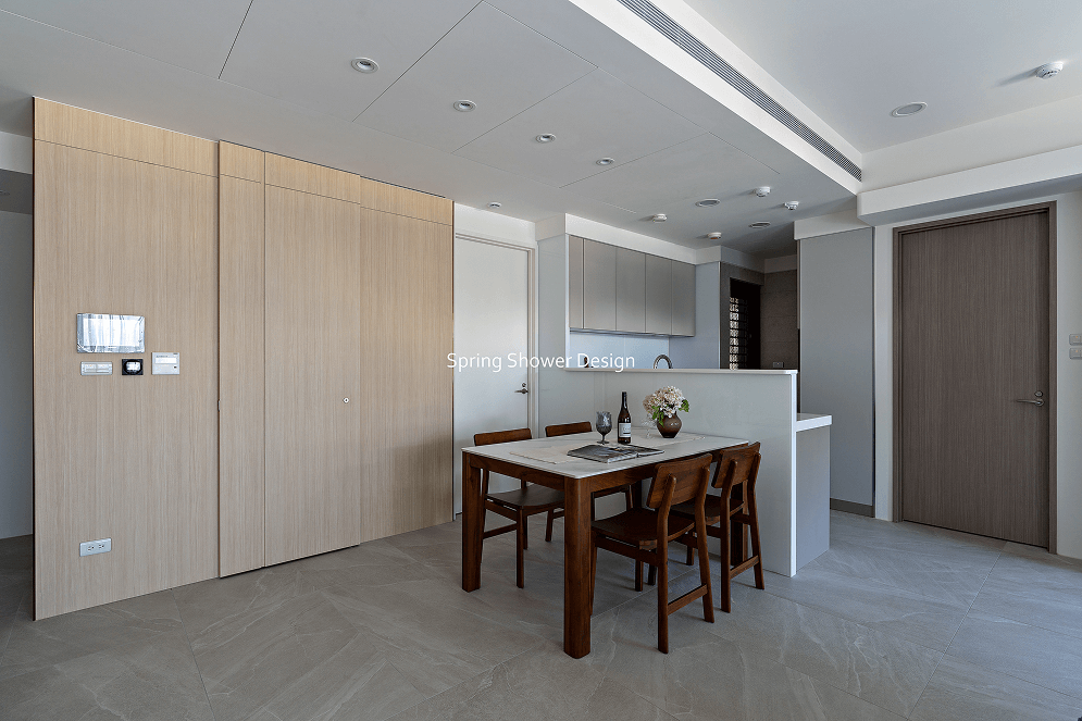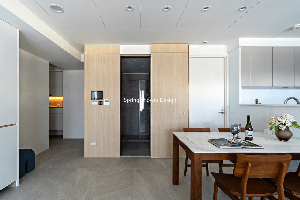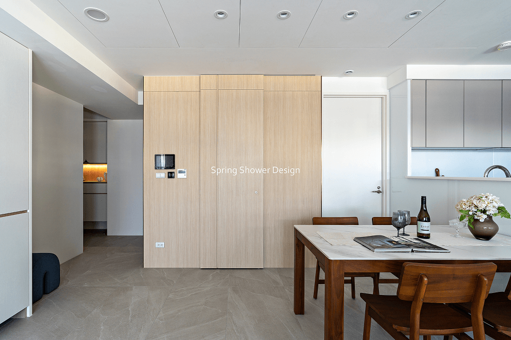 為避免餐廳區牆面視覺雜亂,設計師將臥室門重新貼膜為白色,使木紋隱藏門與廚房牆體形成整體性,維持空間延續性與明亮度。材質與色系配置上,全室以「淺木紋」為基調,再以白色量體平衡視覺重量,提升採光反射效果,營造清爽明亮的整體氛圍。透過立面整合與材質分界,讓開放格局仍維持明確功能性,為屋主打造乾淨、明亮、好維護的退休宅。