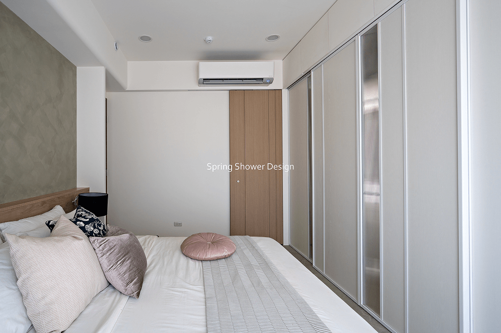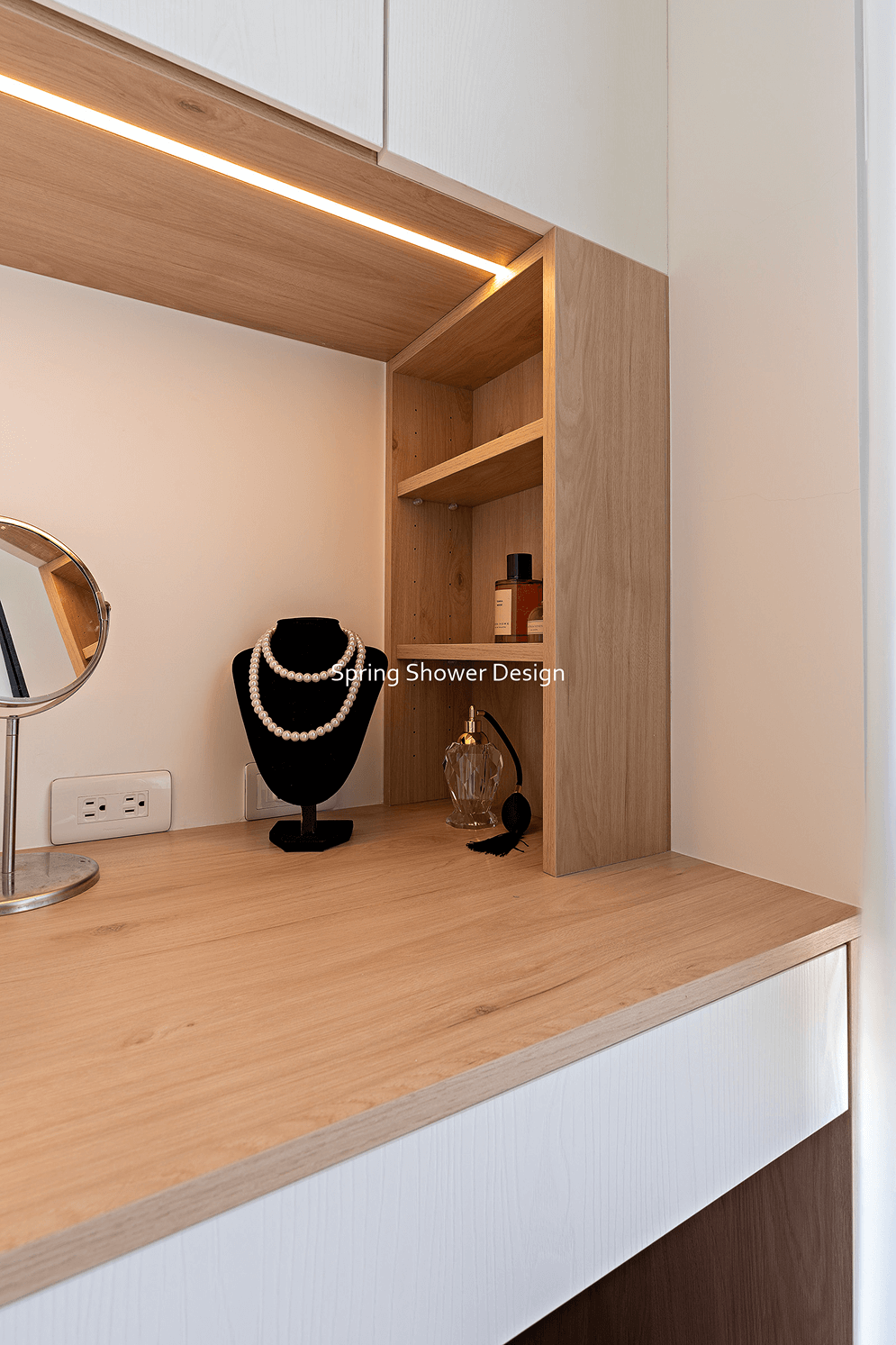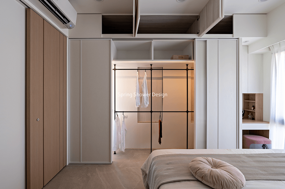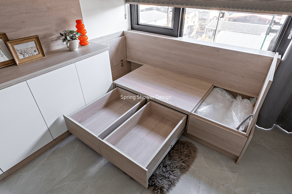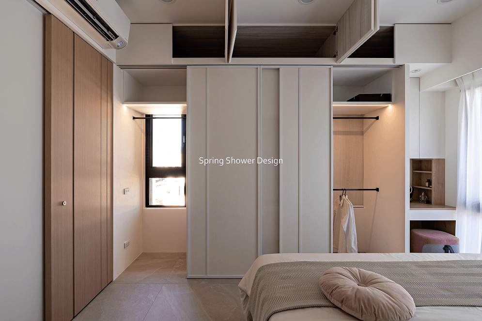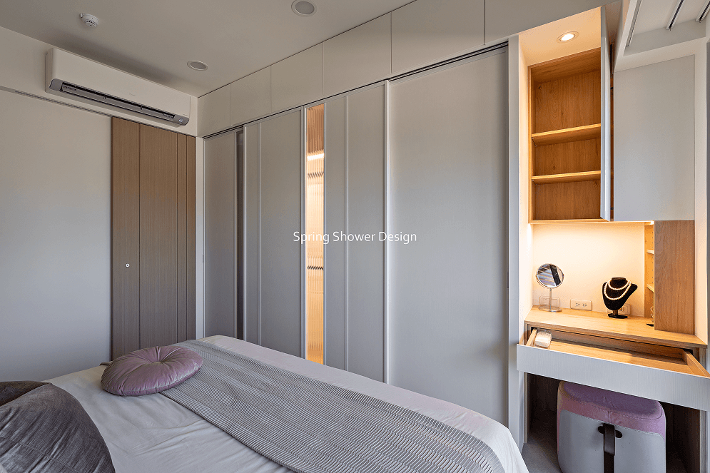 為避免餐廳區牆面視覺雜亂,設計師將臥室門重新貼膜為白色,使木紋隱藏門與廚房牆體形成整體性,維持空間延續性與明亮度。材質與色系配置上,全室以「淺木紋」為基調,再以白色量體平衡視覺重量,提升採光反射效果,營造清爽明亮的整體氛圍。透過立面整合與材質分界,讓開放格局仍維持明確功能性,為屋主打造乾淨、明亮、好維護的退休宅。