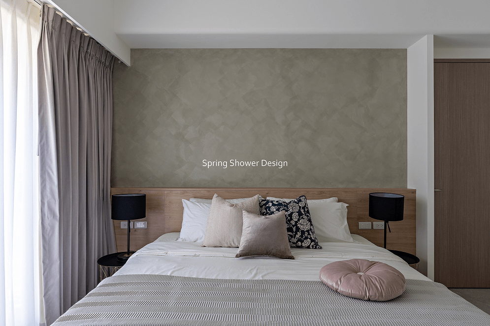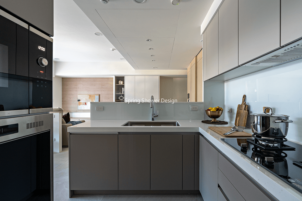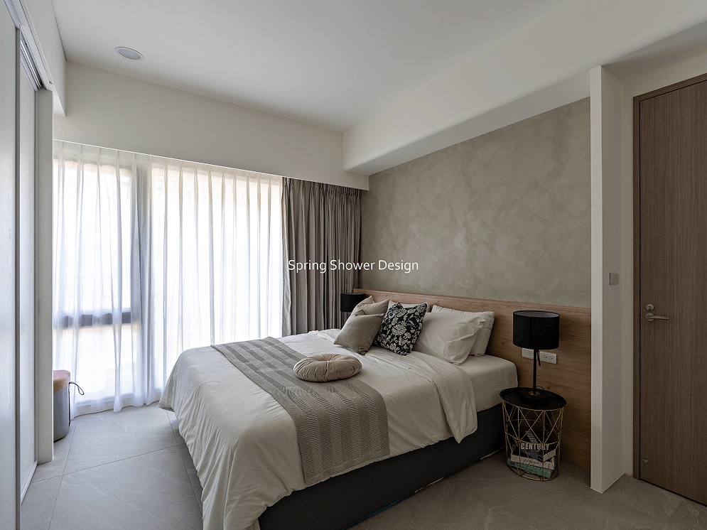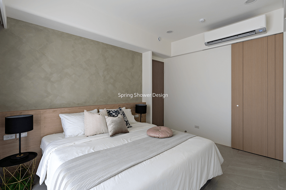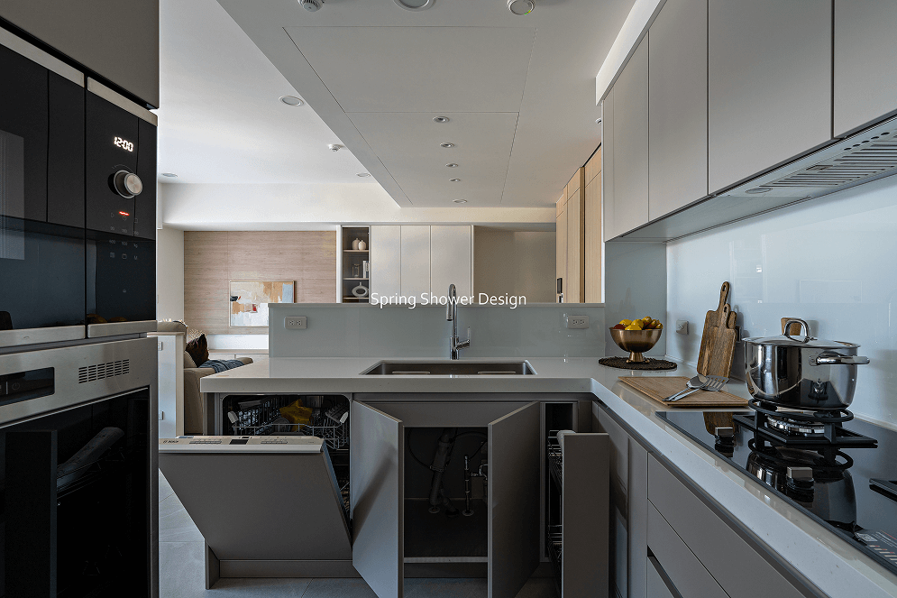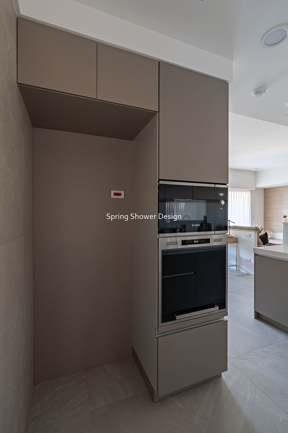 為避免餐廳區牆面視覺雜亂,設計師將臥室門重新貼膜為白色,使木紋隱藏門與廚房牆體形成整體性,維持空間延續性與明亮度。材質與色系配置上,全室以「淺木紋」為基調,再以白色量體平衡視覺重量,提升採光反射效果,營造清爽明亮的整體氛圍。透過立面整合與材質分界,讓開放格局仍維持明確功能性,為屋主打造乾淨、明亮、好維護的退休宅。