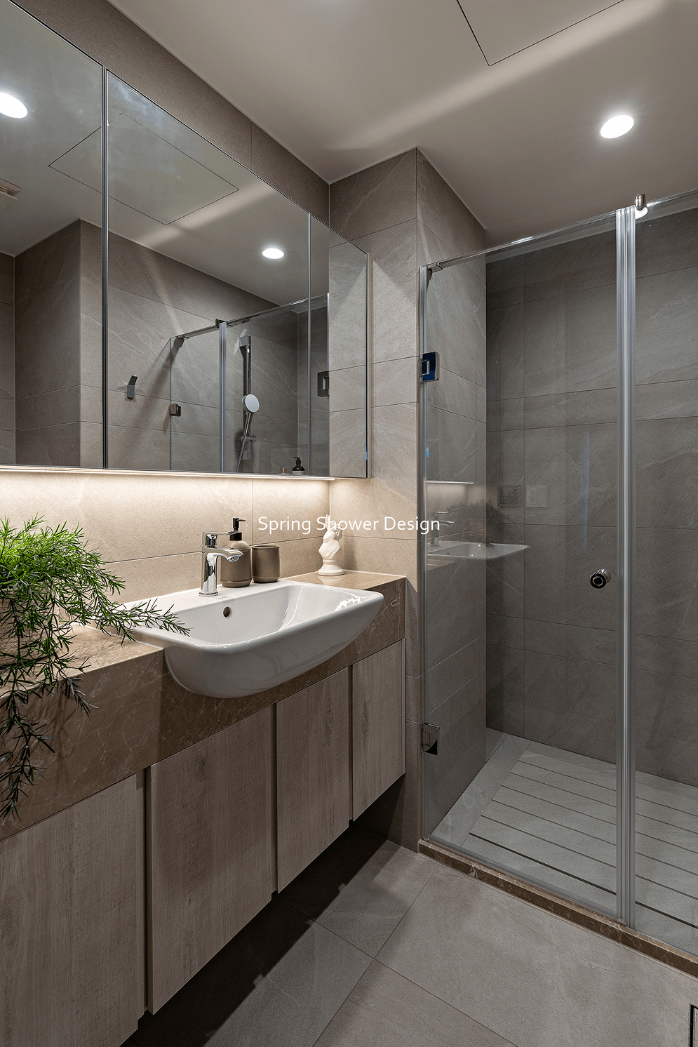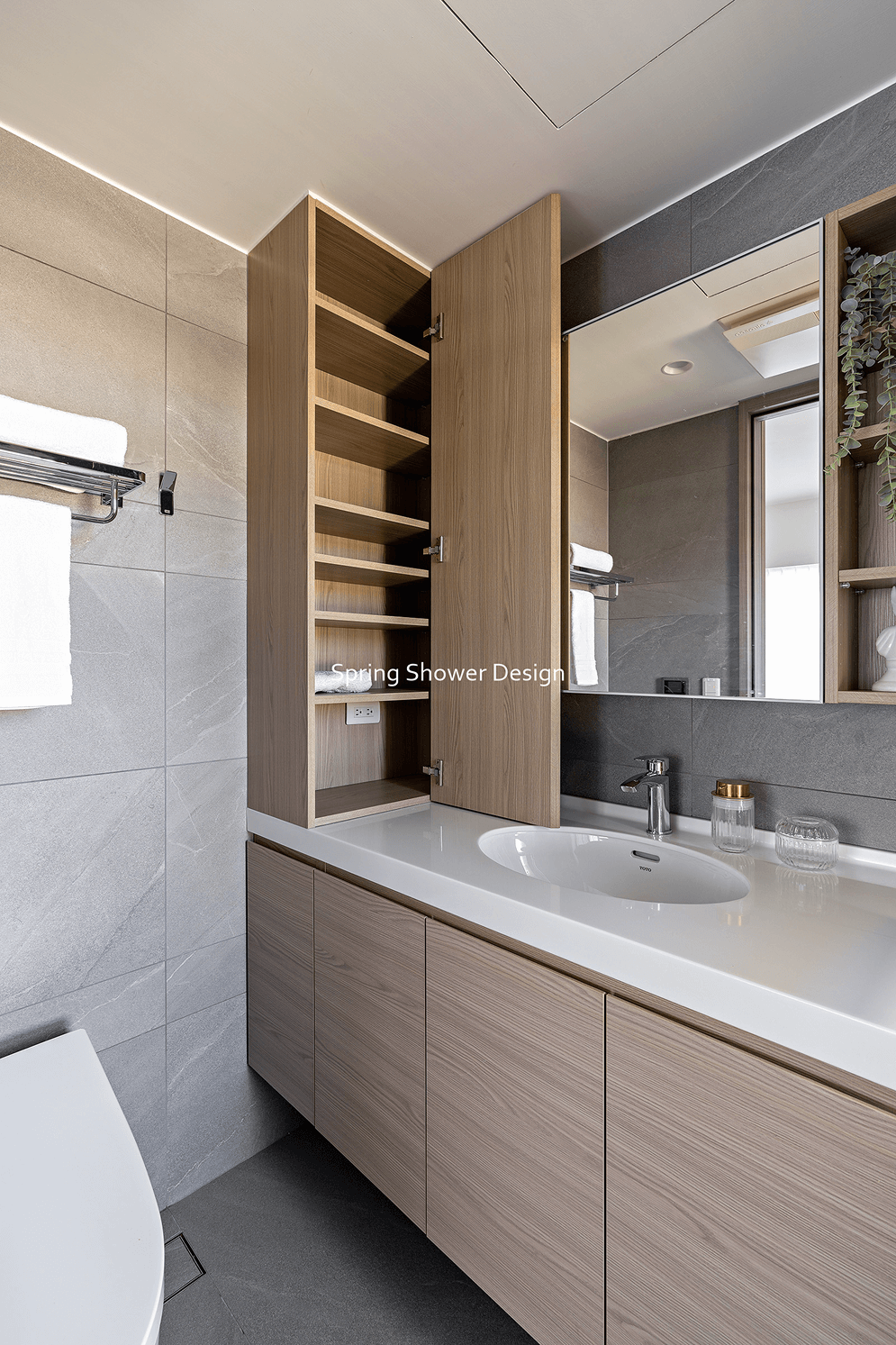整個家的格局採「開放式」規劃,我們將客廳、餐廳與臥室以木紋質感連貫,一路延伸至客廳的頂天木紋造型牆,形成視覺主軸。木紋造型同時隱藏客浴拉門,外觀乾淨俐落,門板採用「美耐板」材質,具防潮、耐刮與易清潔特性,即使手上有水,也能直接開啟使用。