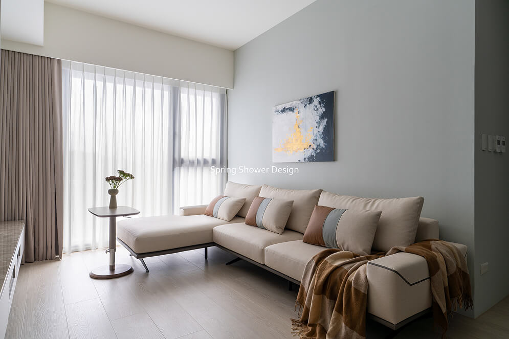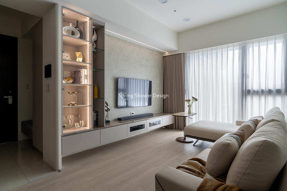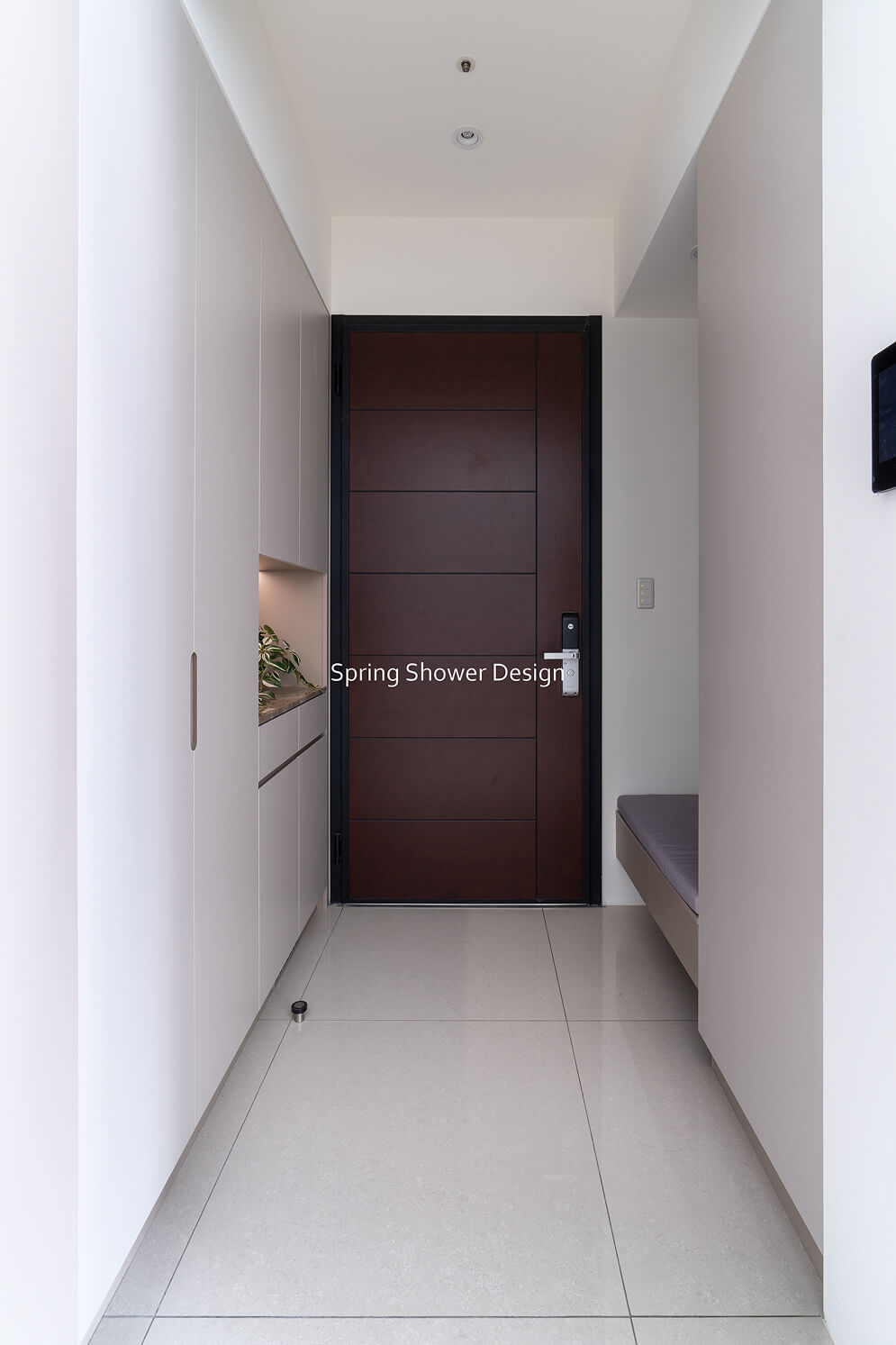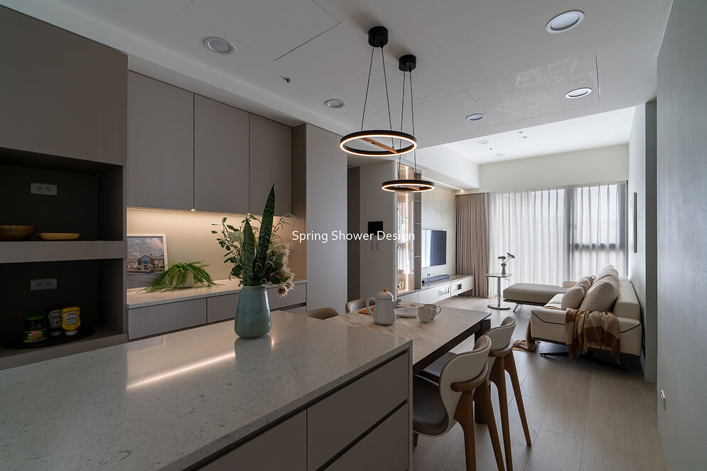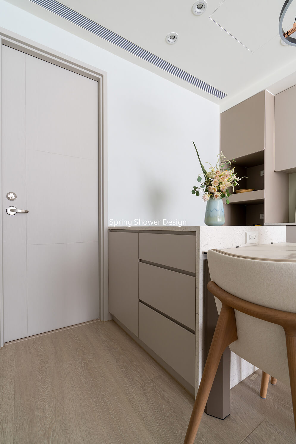 屋主喜歡奶茶色調與自然紋理,我們透過手刷紋、布織紋與石紋等異材質搭配,打造出柔和卻層次豐富的現代精緻宅。玄關一進門就能感受到溫度氛圍,我們善用門畸零空間,打造「穿鞋椅+污衣櫃」的完整玄關機能;穿鞋椅背牆挑選「仿水泥刷紋美耐板」,耐磨又能安心靠坐。