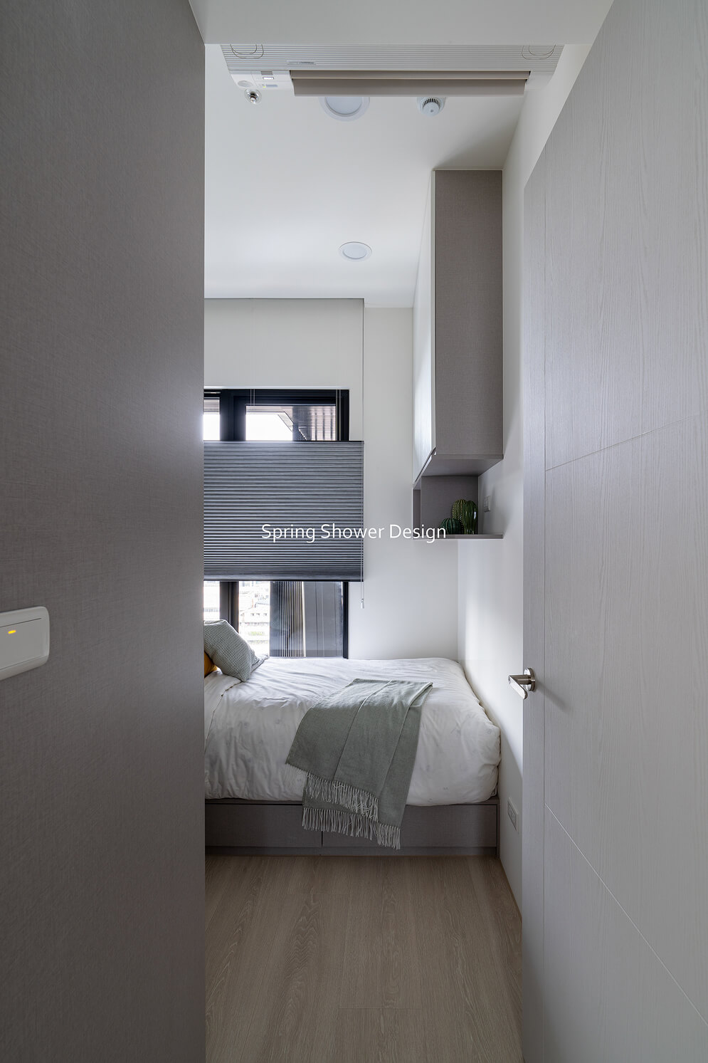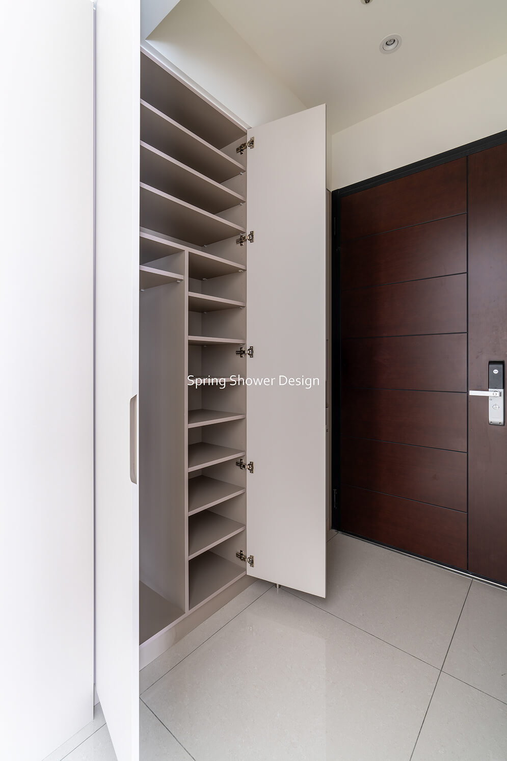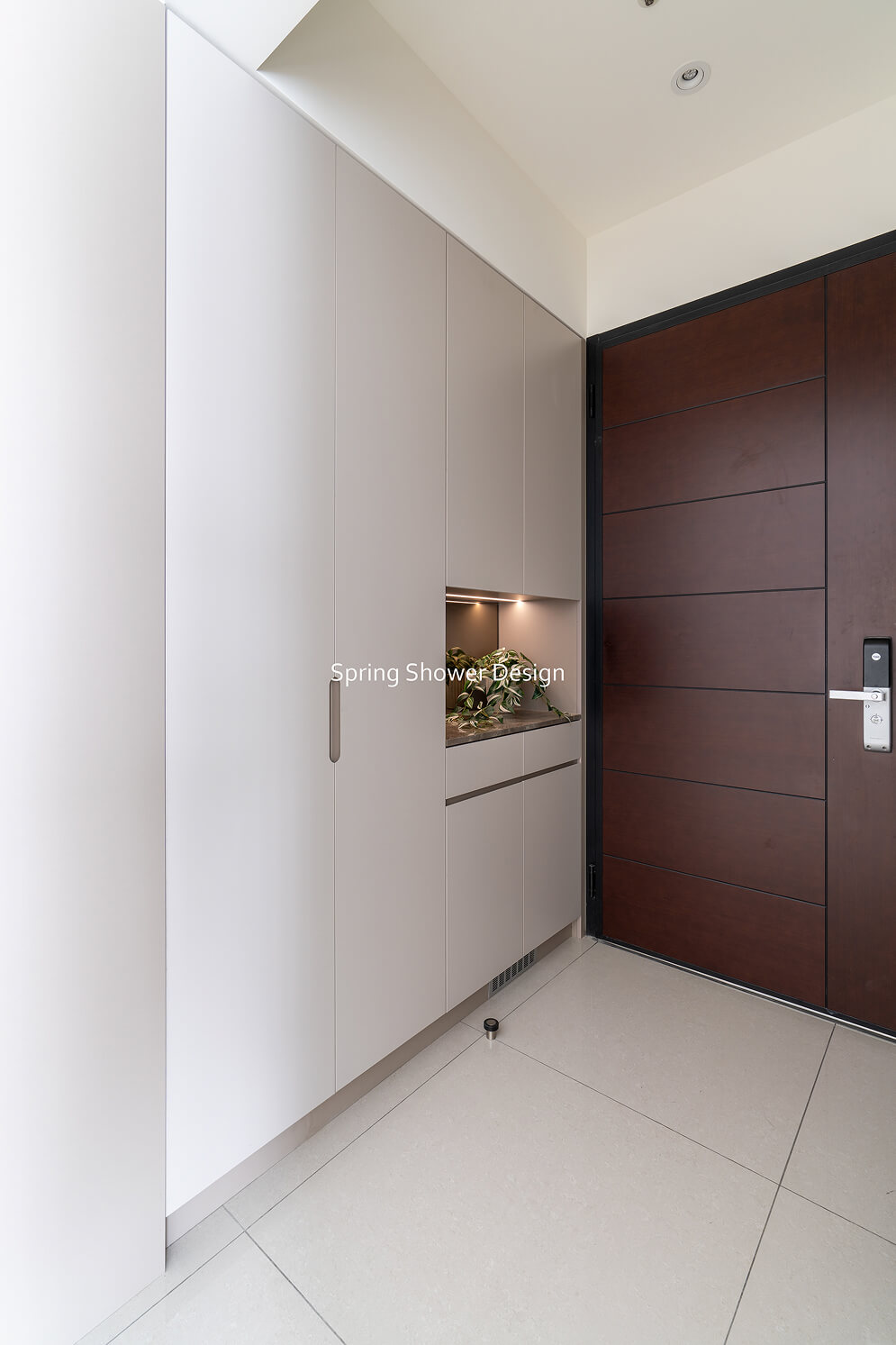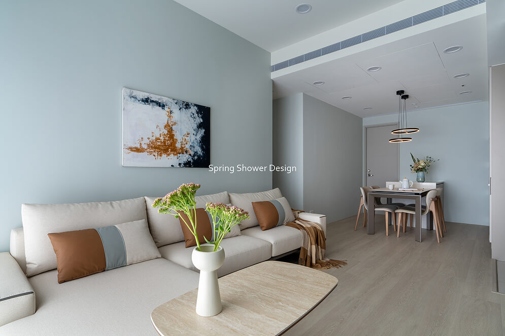 屋主喜歡奶茶色調與自然紋理,我們透過手刷紋、布織紋與石紋等異材質搭配,打造出柔和卻層次豐富的現代精緻宅。玄關一進門就能感受到溫度氛圍,我們善用門畸零空間,打造「穿鞋椅+污衣櫃」的完整玄關機能;穿鞋椅背牆挑選「仿水泥刷紋美耐板」,耐磨又能安心靠坐。