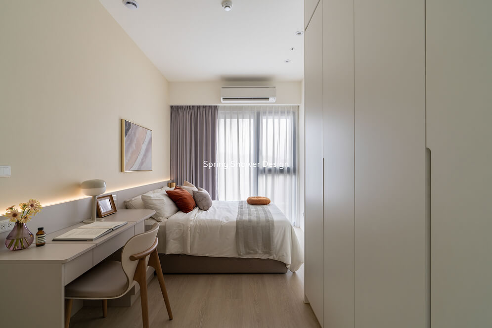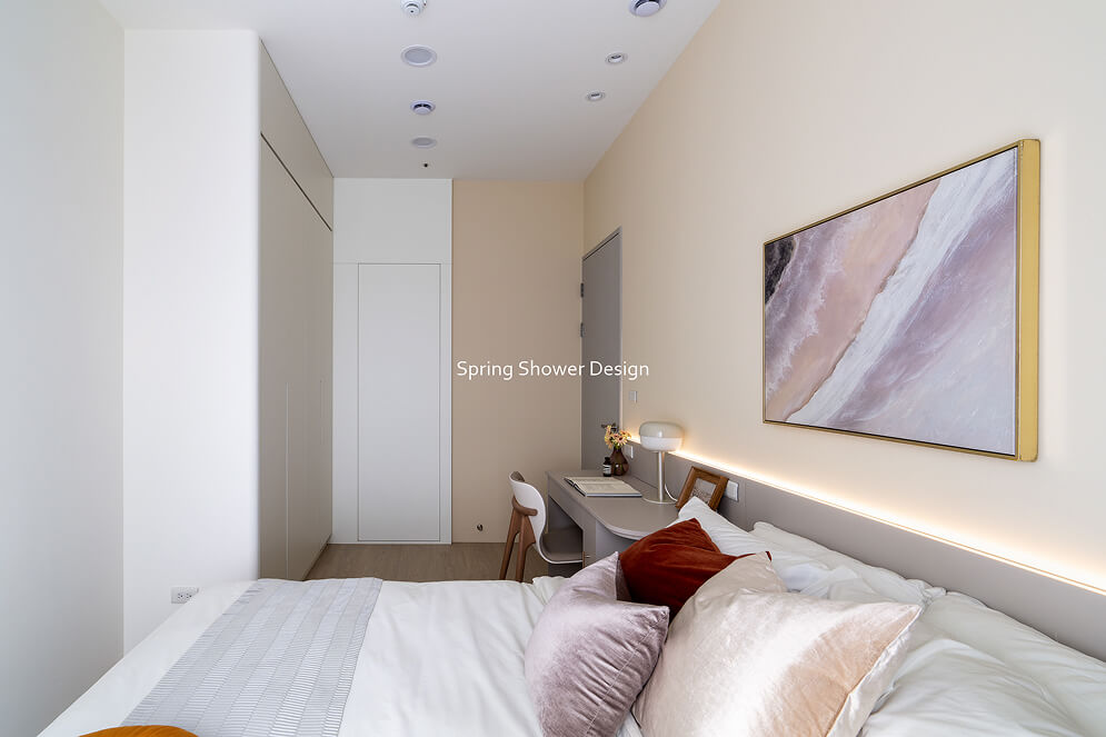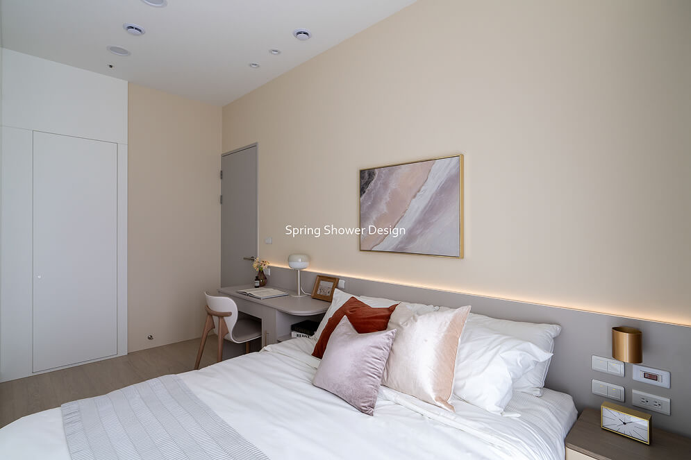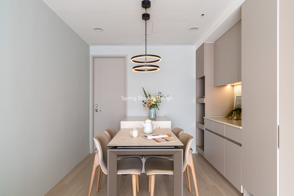 「污衣櫃」可以掛包包與外套,回家動線乾淨俐落;並以「壁布牆」材質規劃對講機與開關區,具抗刮、易清潔特性,沿著木作服貼R角,讓動線轉折更安全。餐廚區整合「中島+餐桌+餐櫃」設計,視覺延伸又機能強大;中島檯面採高硬度「賽麗石」,兼具美觀與耐用。主臥以奶杏+白色為主調,以「壁布」溫潤的觸感與柔和光影,營造放鬆氛圍。