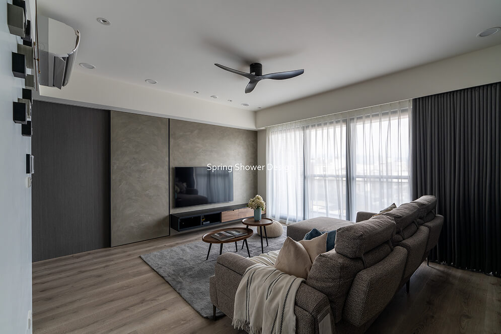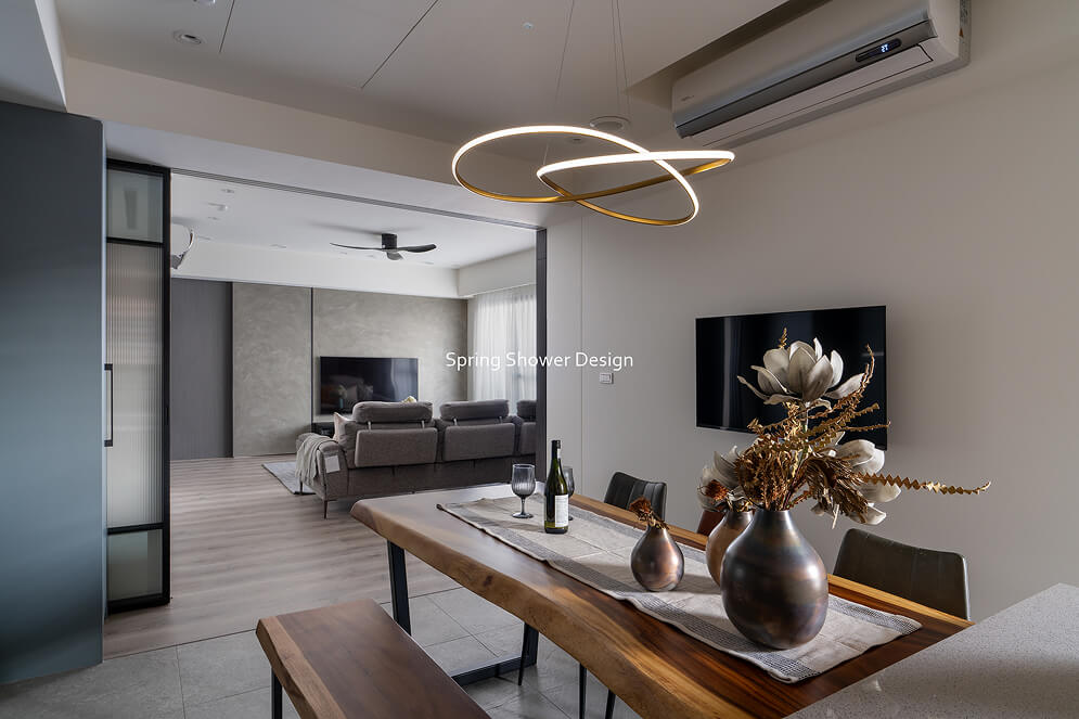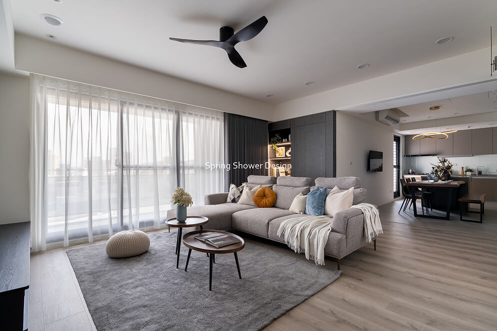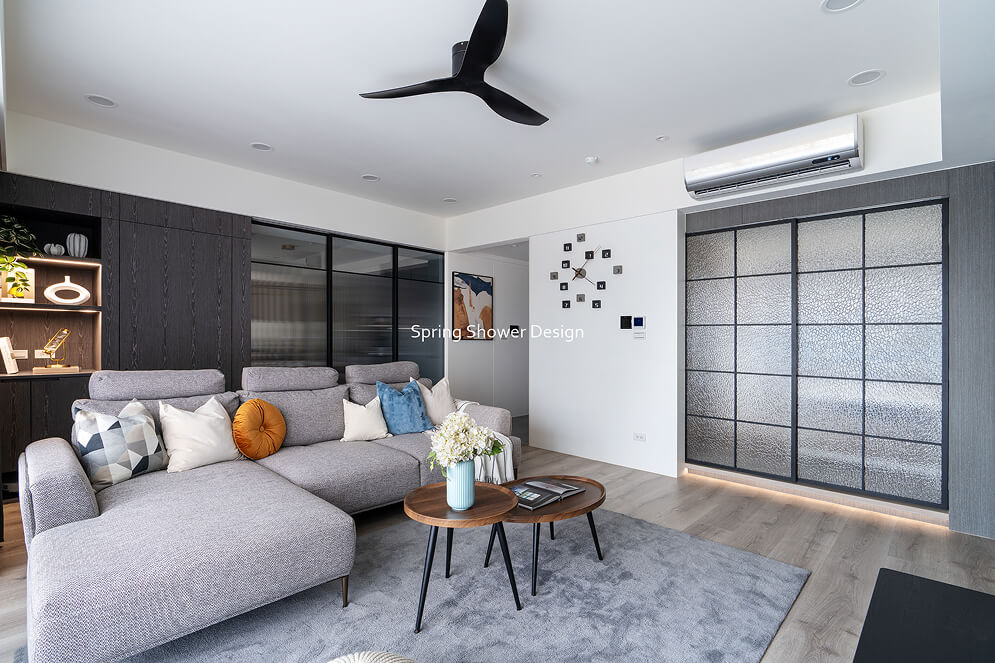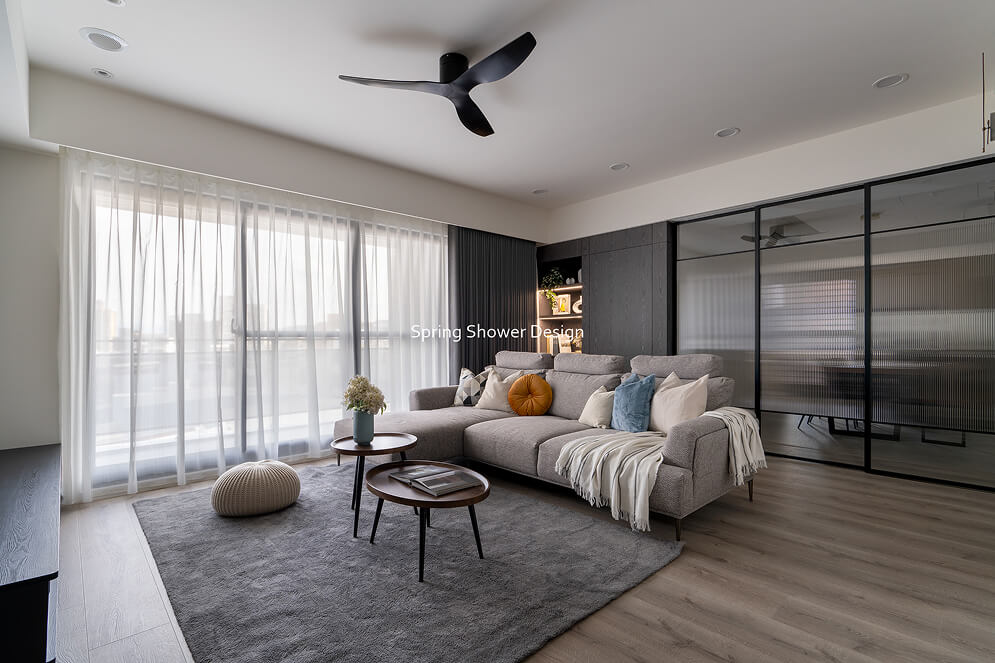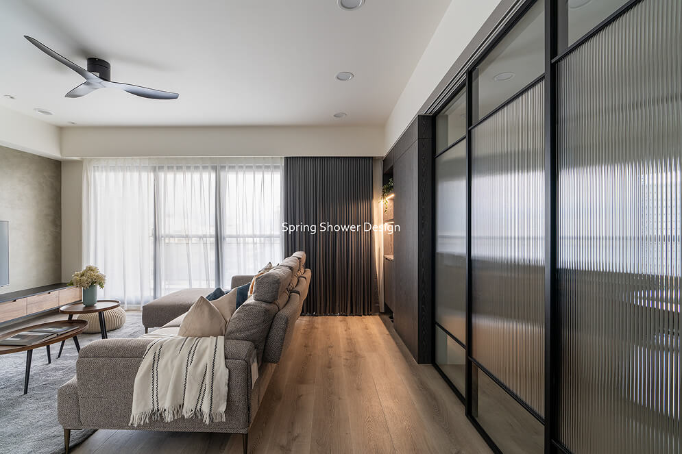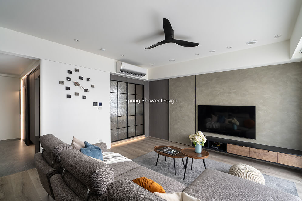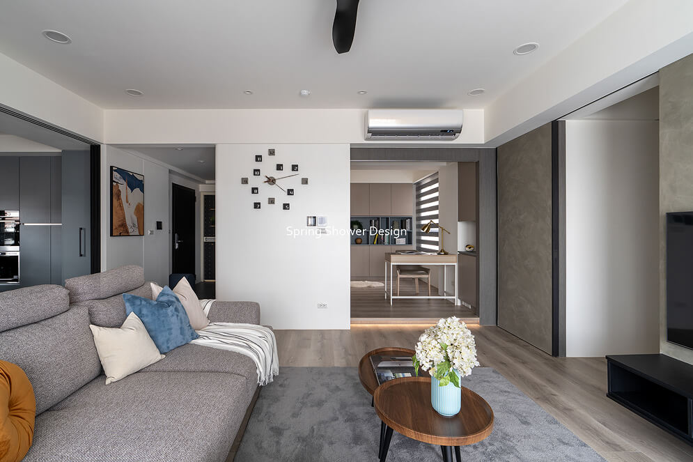 電視牆手刷塗料呈現水泥質感,搭配曜黑與木紋懸浮櫃,巧妙隱藏造型拉門;展示櫃兼顧風水與實用收納。多功能房平時作書房,鋪上睡墊即可作臨時客房;主臥更衣室與泡澡浴缸則打通主臥與相鄰小房間,形成舒適更衣區。客、餐廚區與多功能書房一體化,玻璃拉門取代隔間,讓光線流動、視覺通透,並可彈性調整隱私。