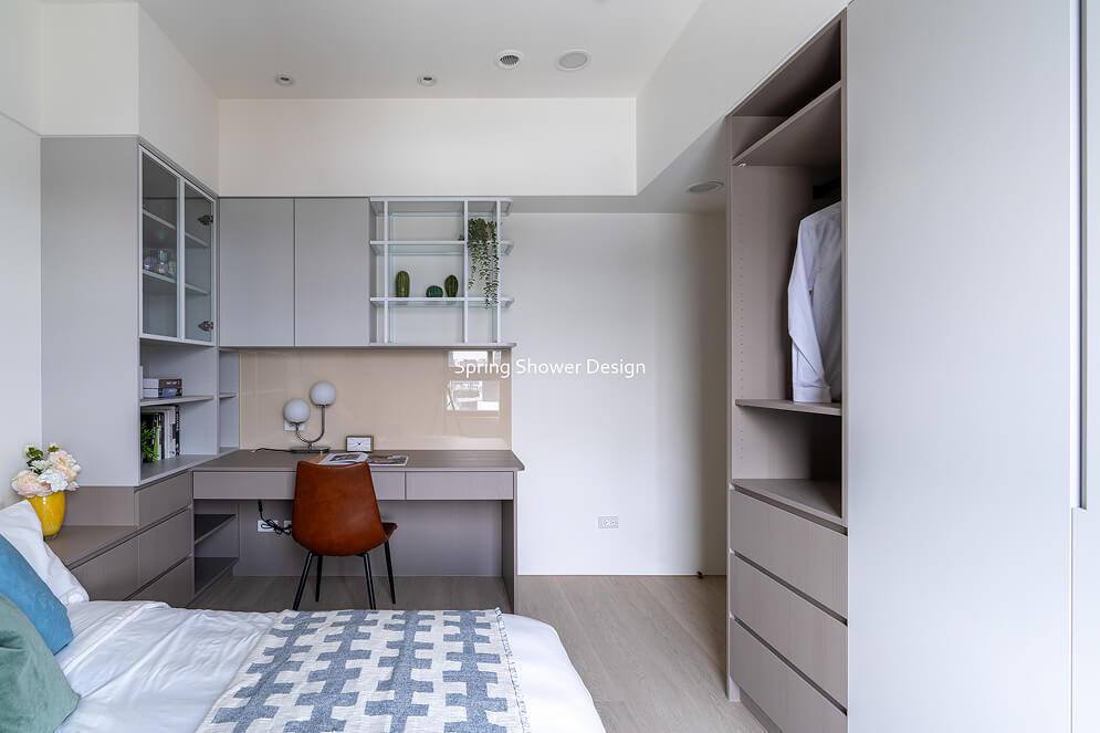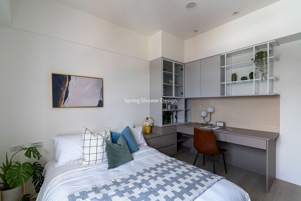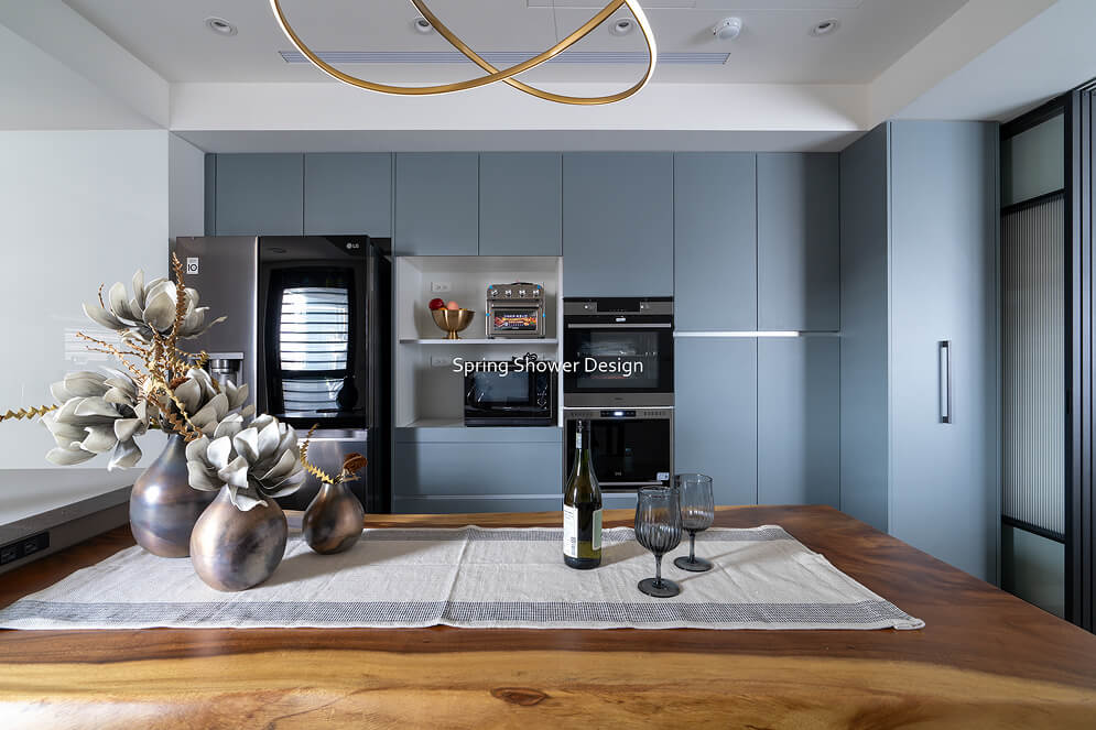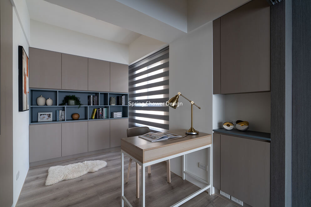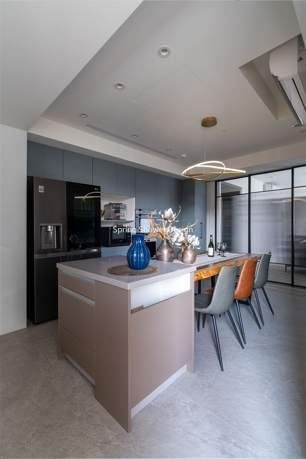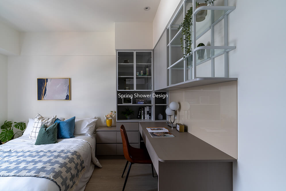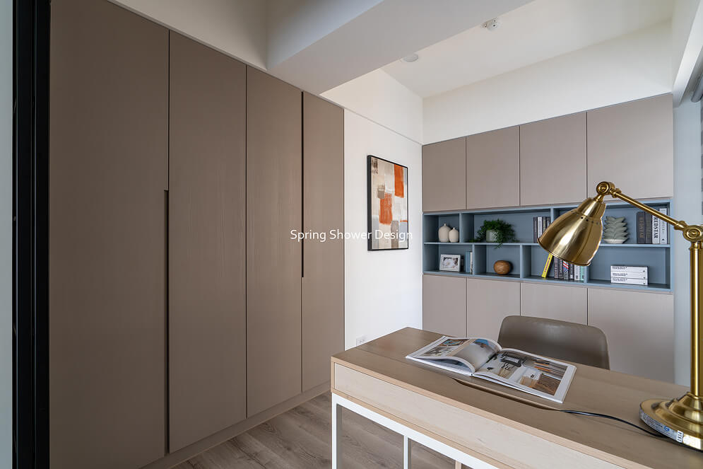 電視牆手刷塗料呈現水泥質感,搭配曜黑與木紋懸浮櫃,巧妙隱藏造型拉門;展示櫃兼顧風水與實用收納。多功能房平時作書房,鋪上睡墊即可作臨時客房;主臥更衣室與泡澡浴缸則打通主臥與相鄰小房間,形成舒適更衣區。客、餐廚區與多功能書房一體化,玻璃拉門取代隔間,讓光線流動、視覺通透,並可彈性調整隱私。