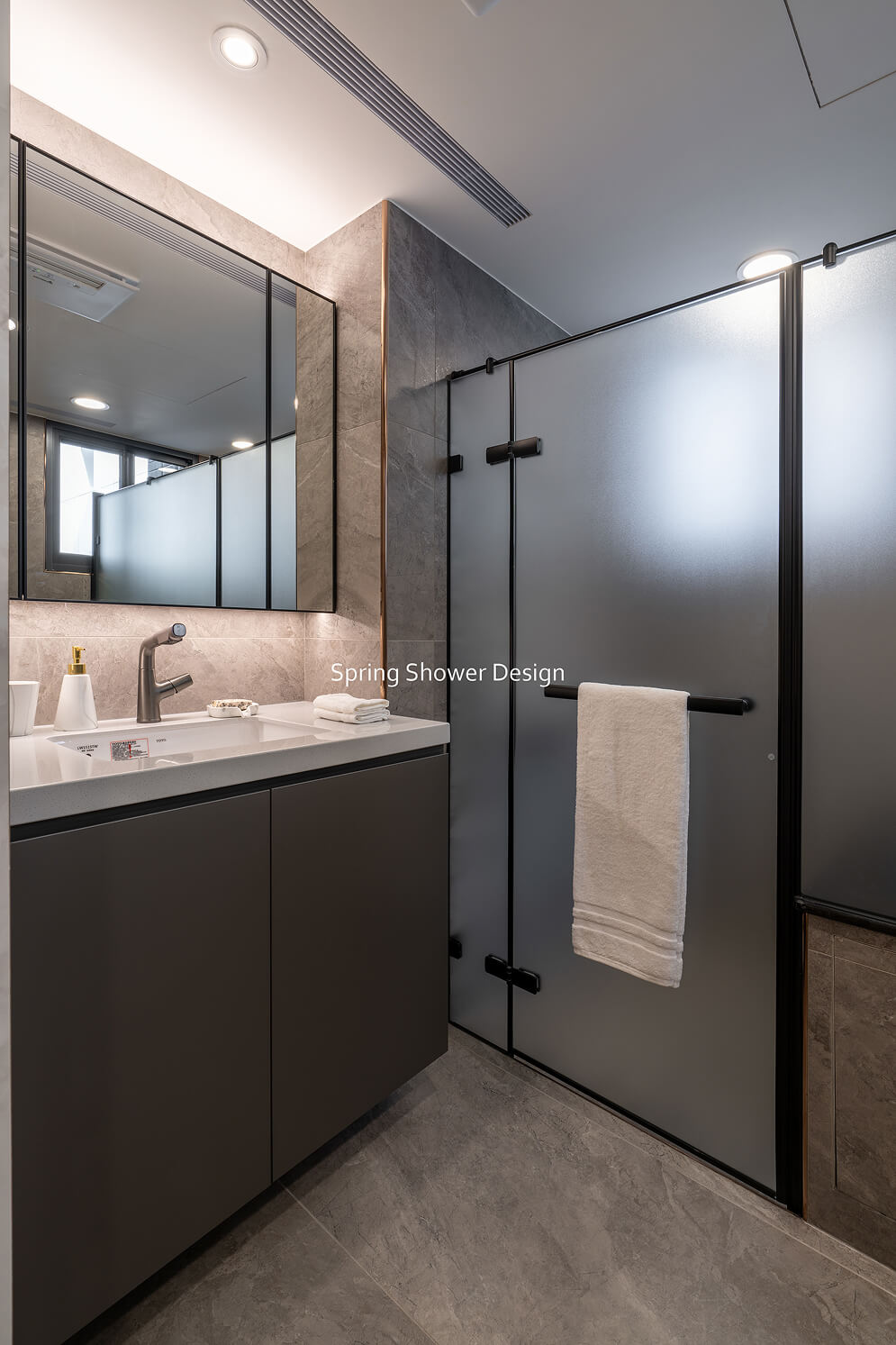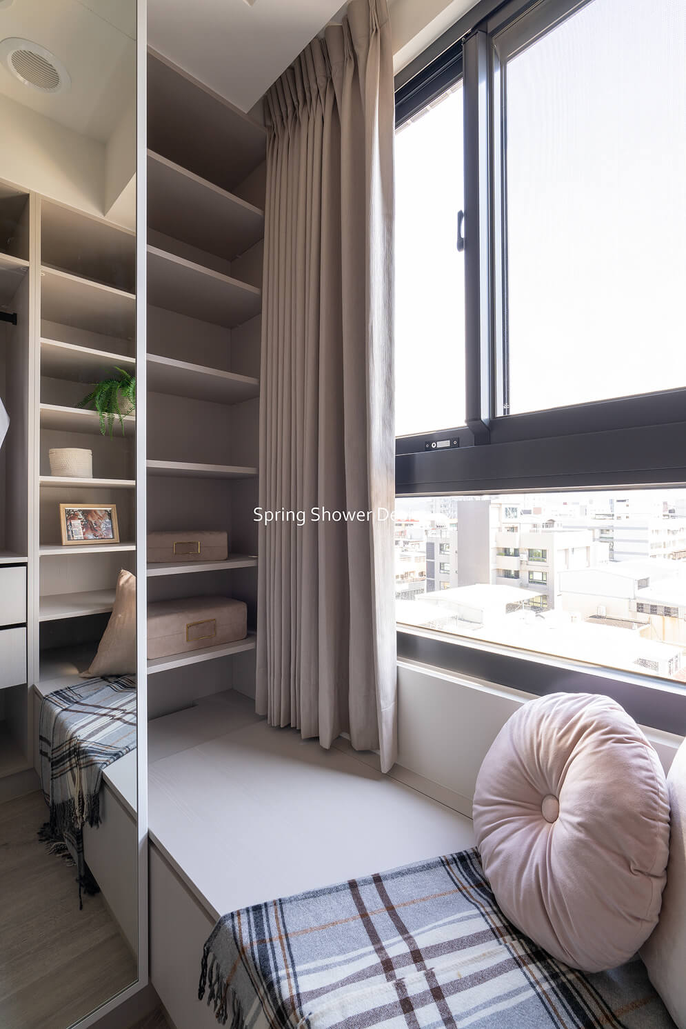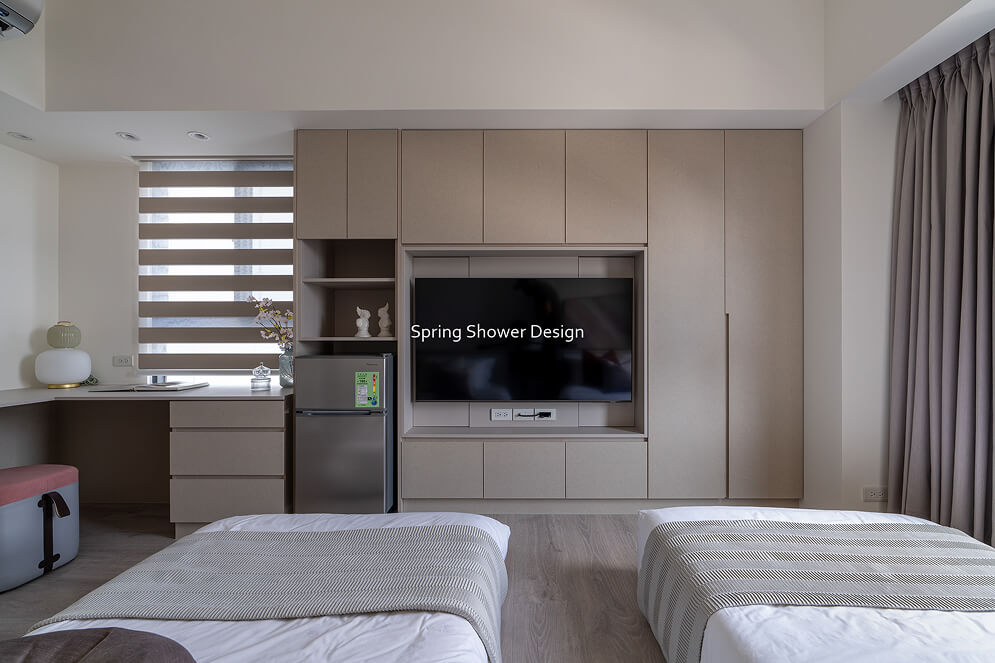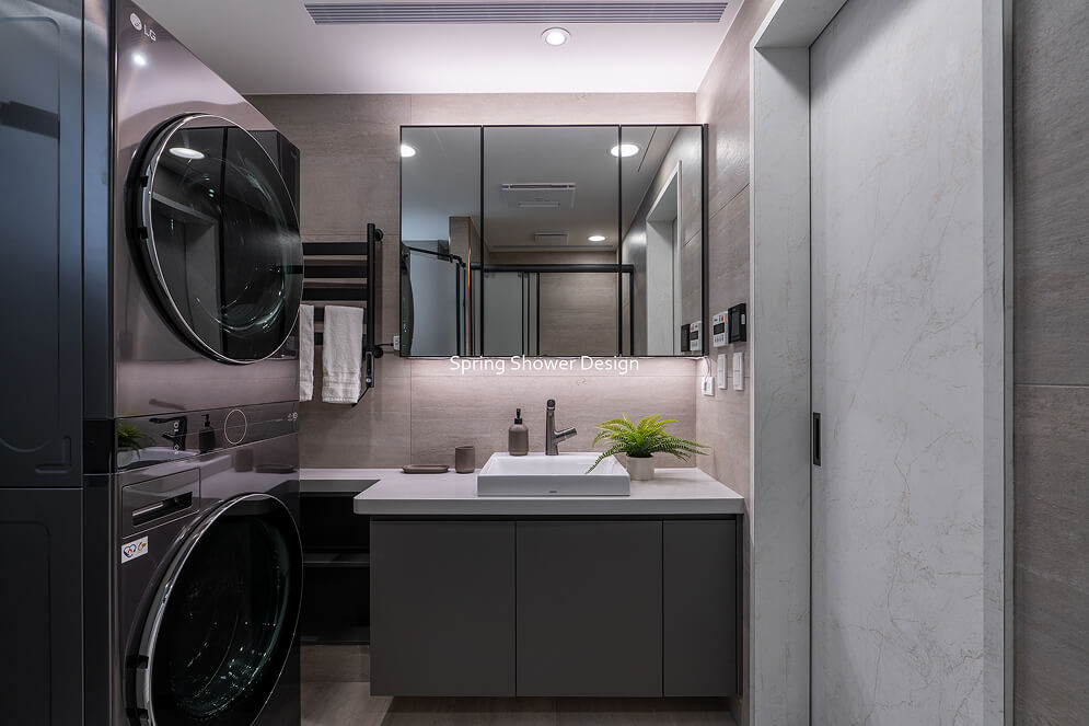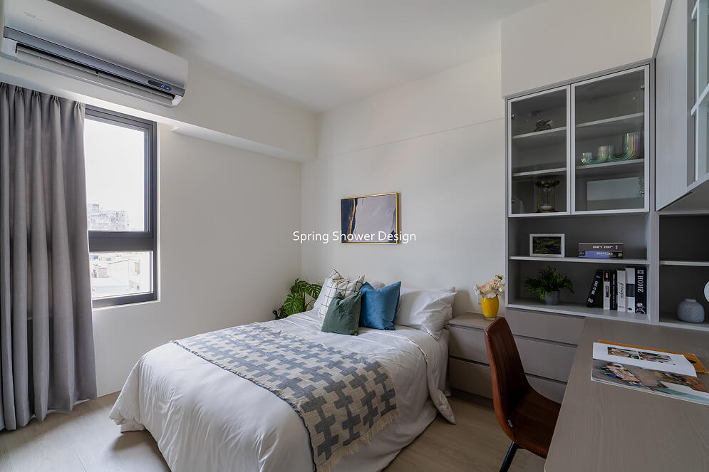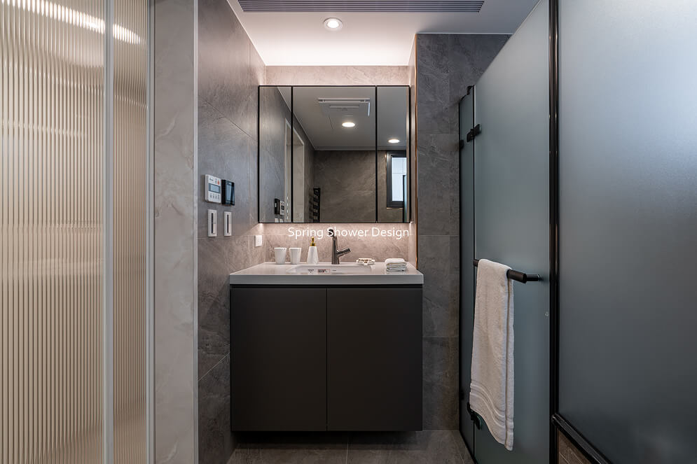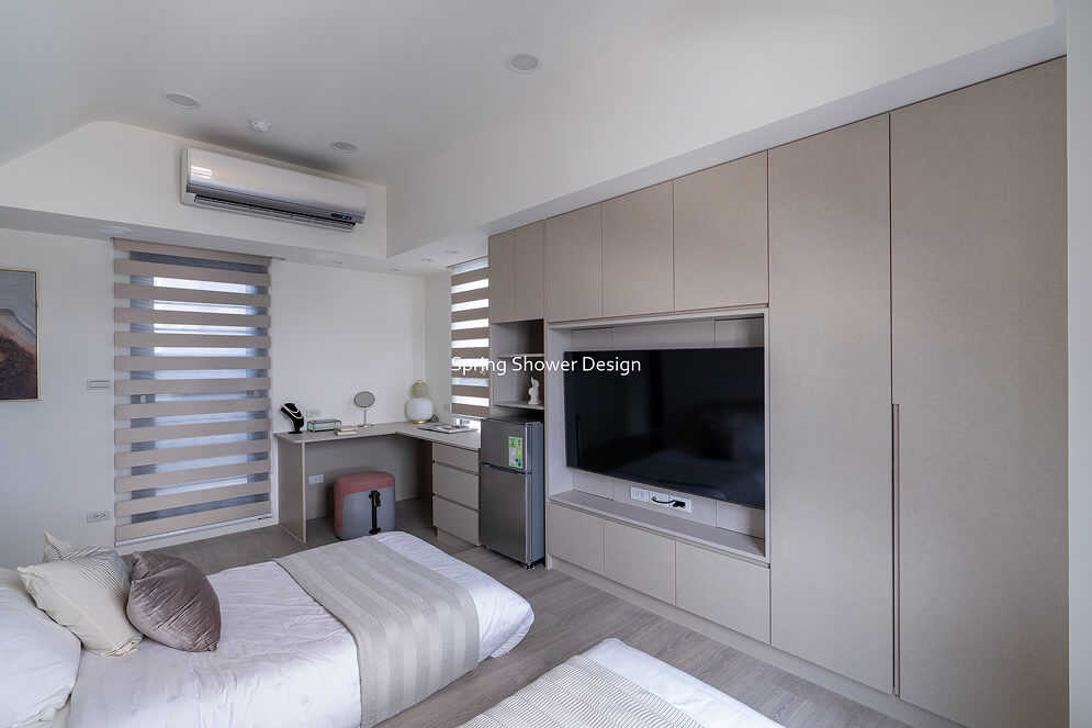 電視牆手刷塗料呈現水泥質感,搭配曜黑與木紋懸浮櫃,巧妙隱藏造型拉門;展示櫃兼顧風水與實用收納。多功能房平時作書房,鋪上睡墊即可作臨時客房;主臥更衣室與泡澡浴缸則打通主臥與相鄰小房間,形成舒適更衣區。客、餐廚區與多功能書房一體化,玻璃拉門取代隔間,讓光線流動、視覺通透,並可彈性調整隱私。