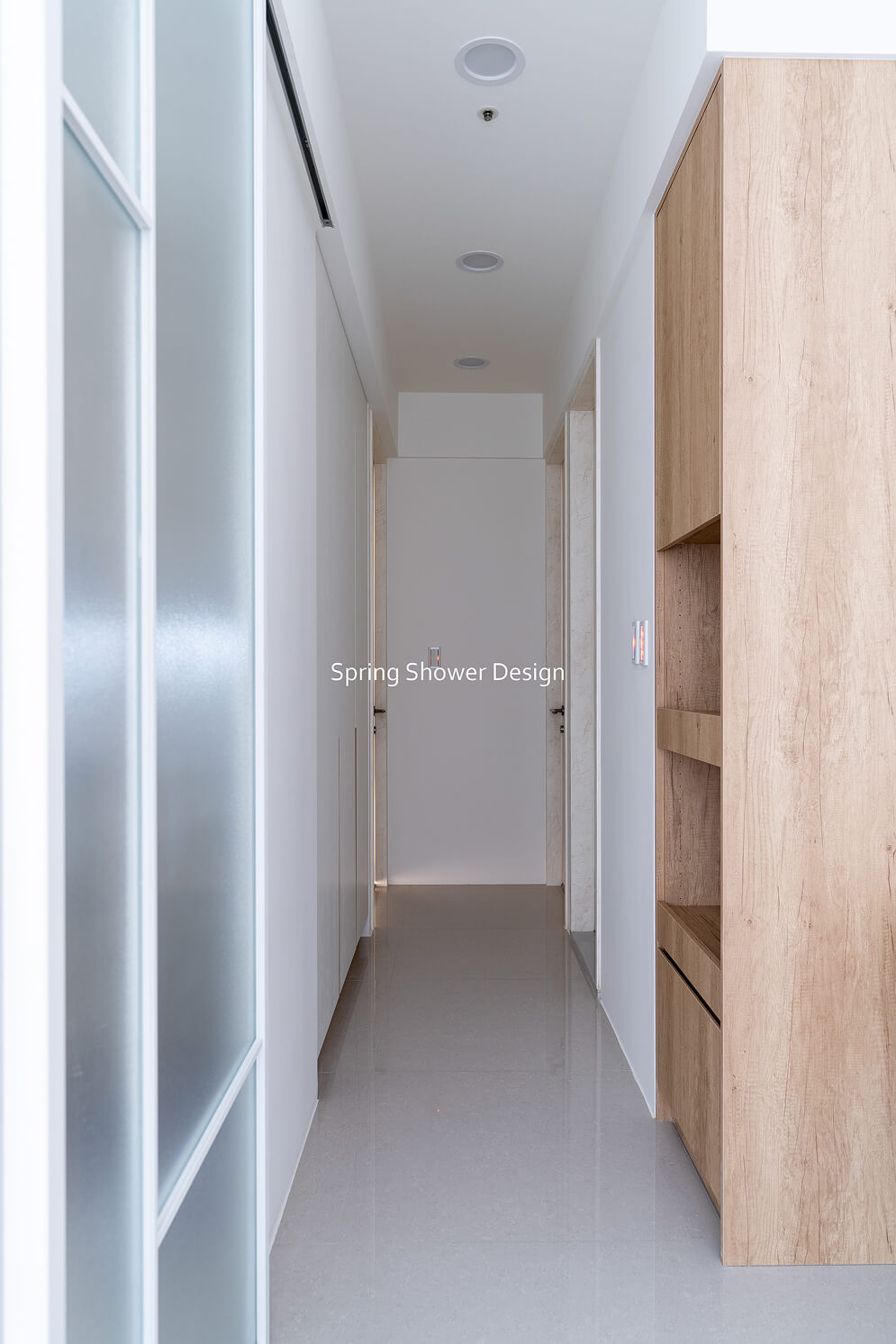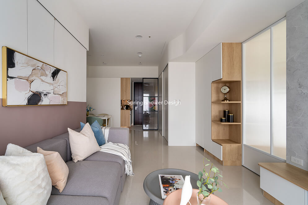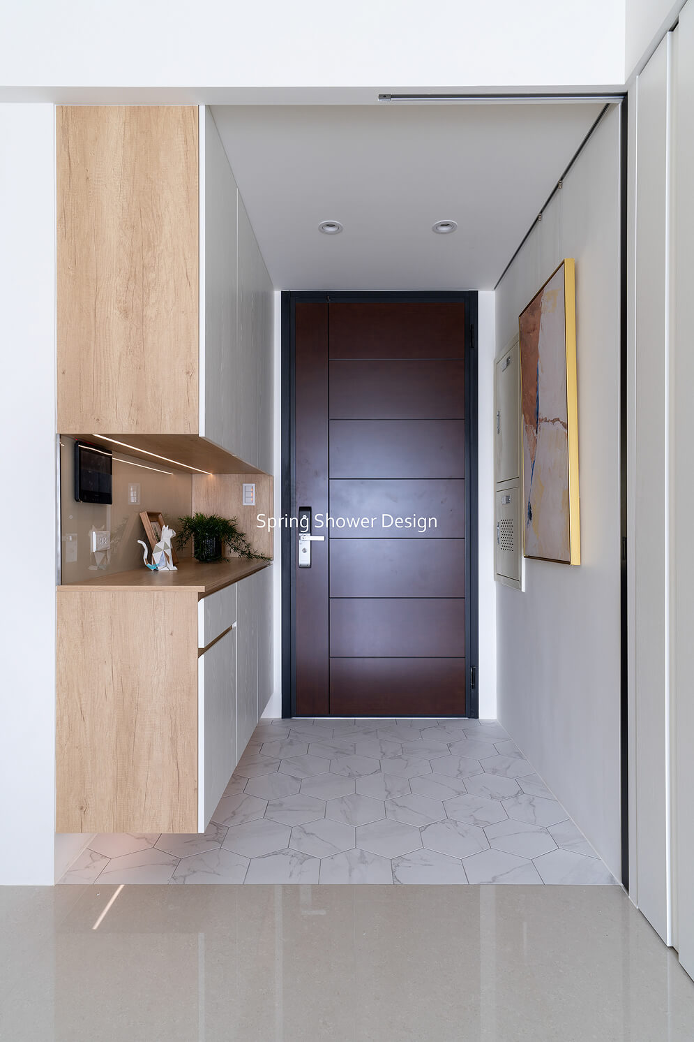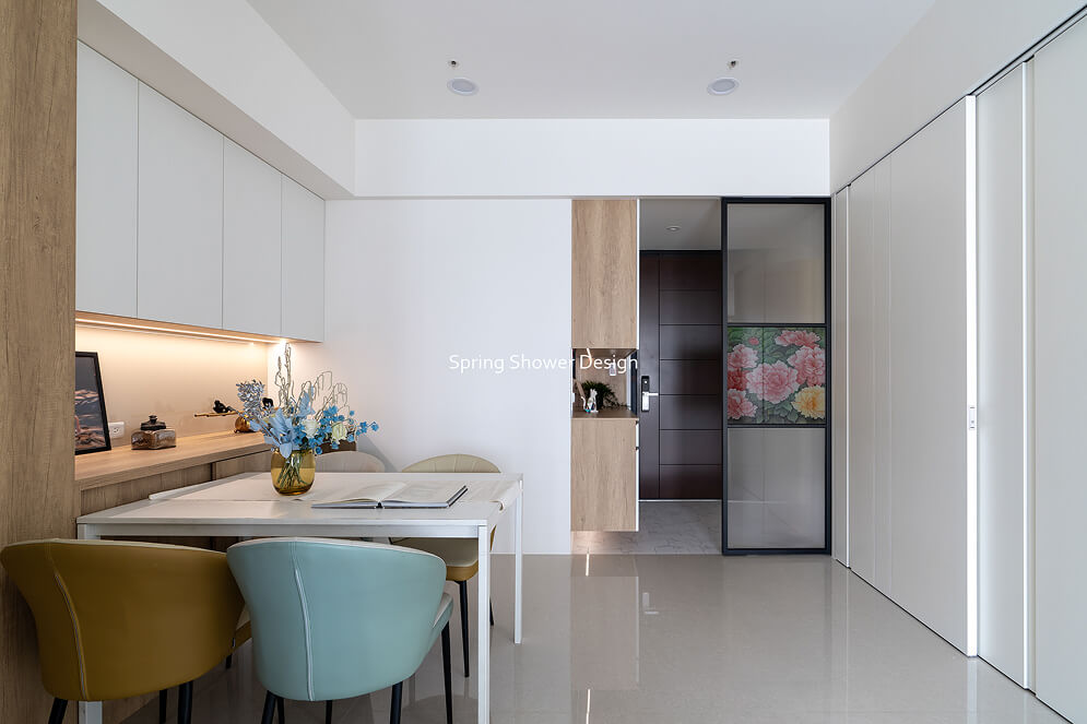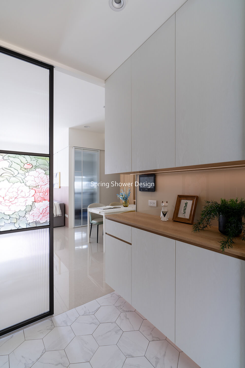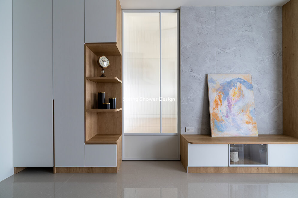 玄關採吊櫃+下櫃設計,中間留展示區,增強穿透感。落塵區磁磚在客變階段拆除,鋪上銀狐石紋六角磚,兼具精緻與實用。活動式長虹玻璃屏風,平時遮擋視線,保持動線流暢。儲藏室兼顧鞋間及冷凍櫃、寵物車、家電紙箱收納,維持公區整潔。