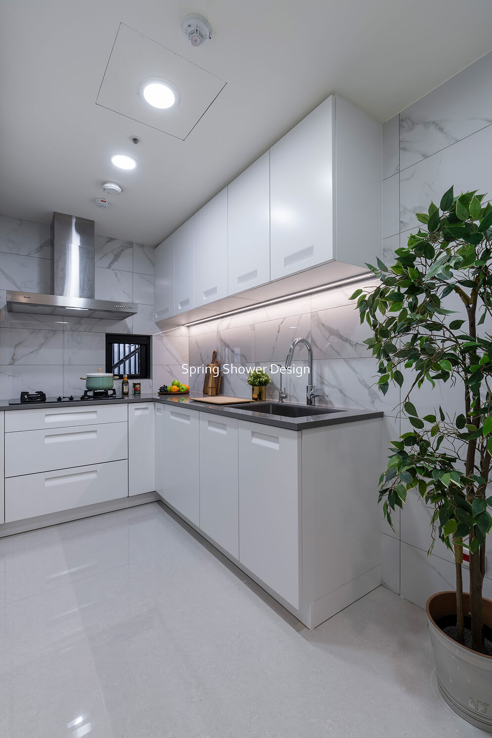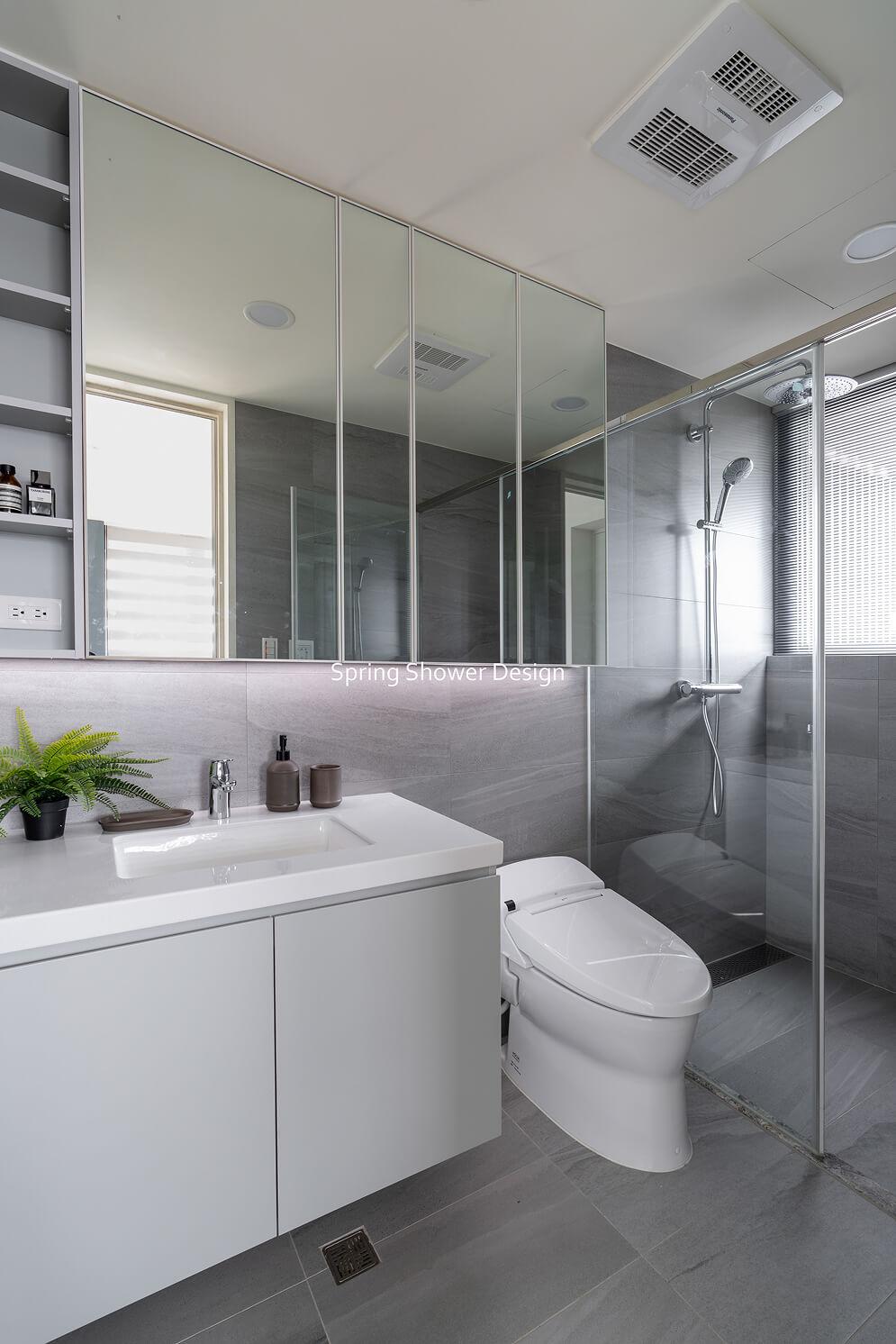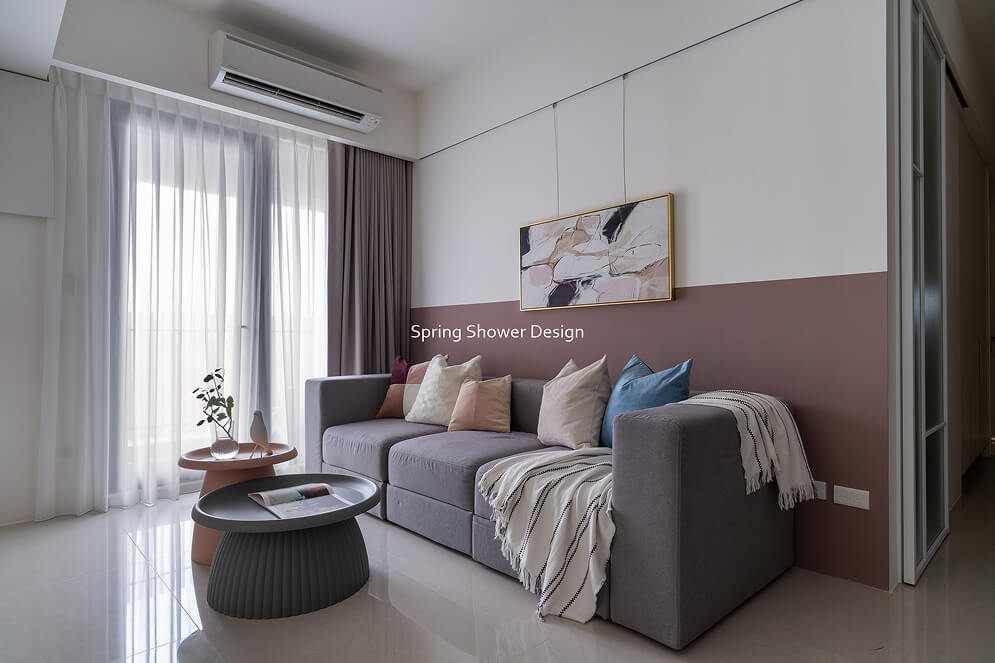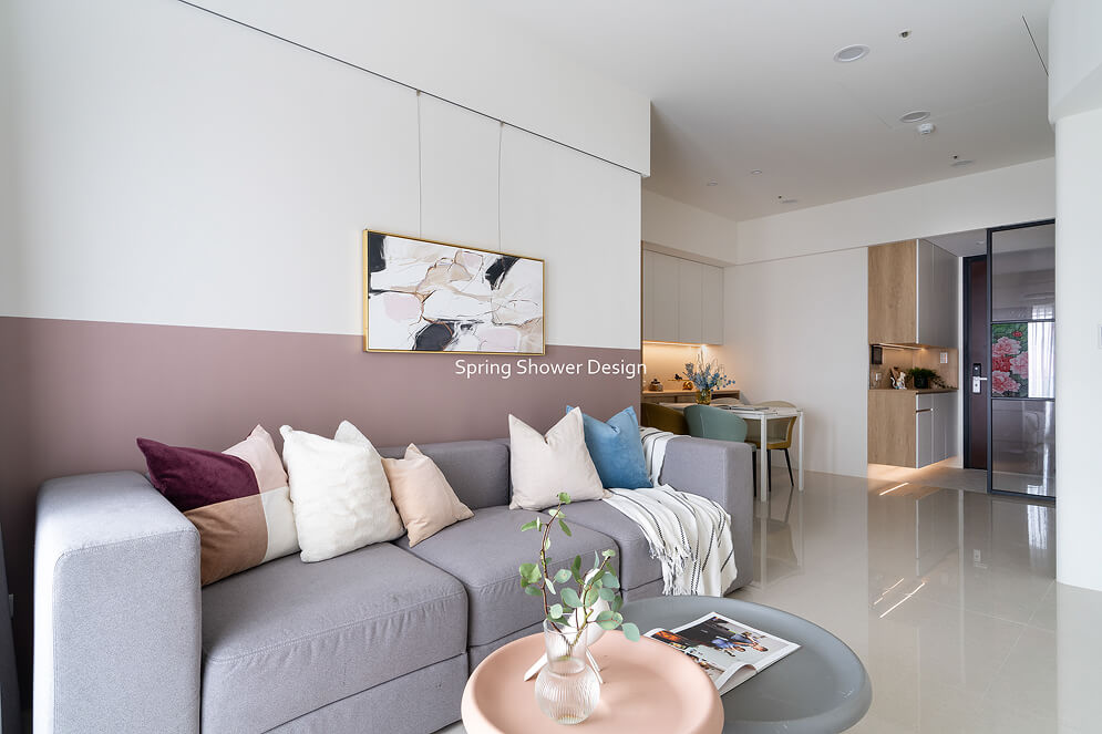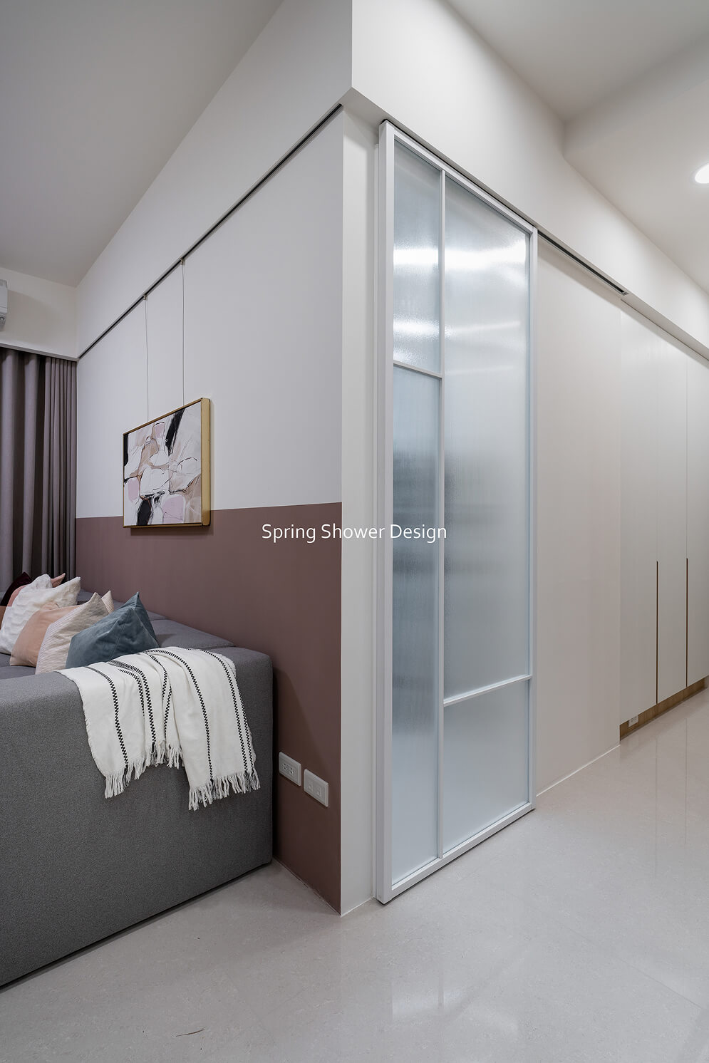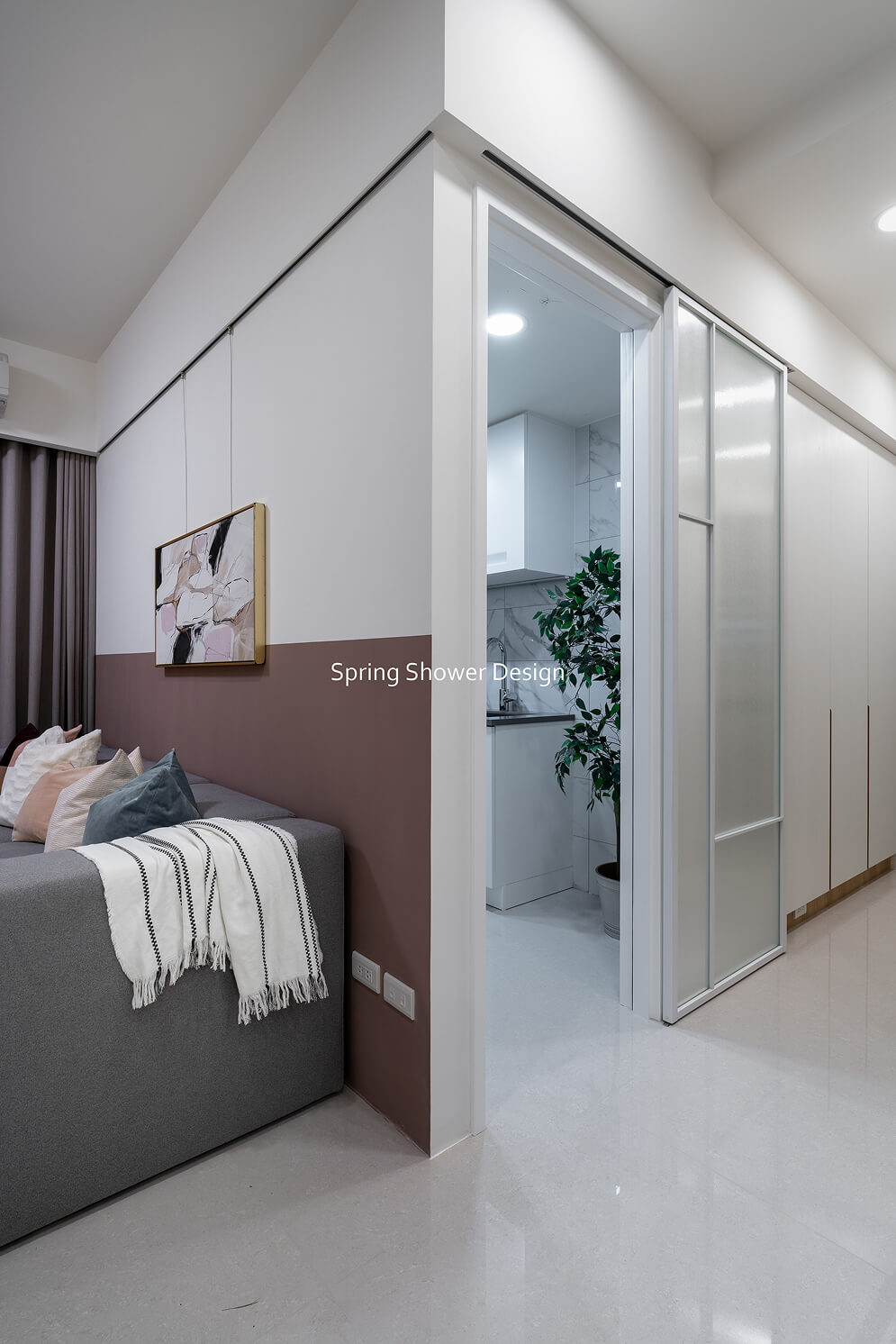 玄關採吊櫃+下櫃設計,中間留展示區,增強穿透感。落塵區磁磚在客變階段拆除,鋪上銀狐石紋六角磚,兼具精緻與實用。活動式長虹玻璃屏風,平時遮擋視線,保持動線流暢。儲藏室兼顧鞋間及冷凍櫃、寵物車、家電紙箱收納,維持公區整潔。