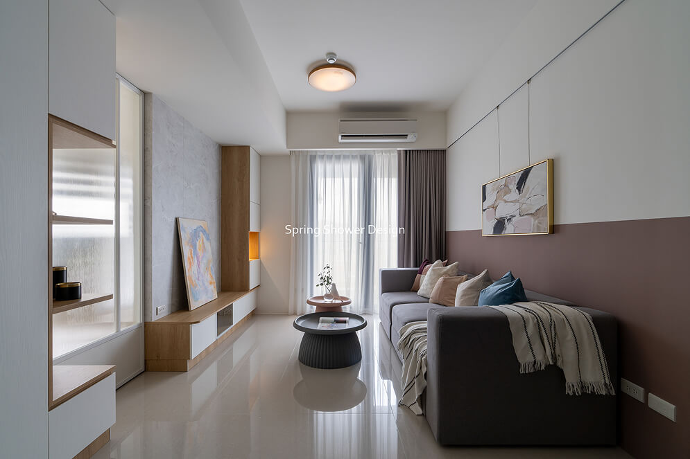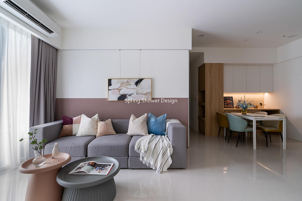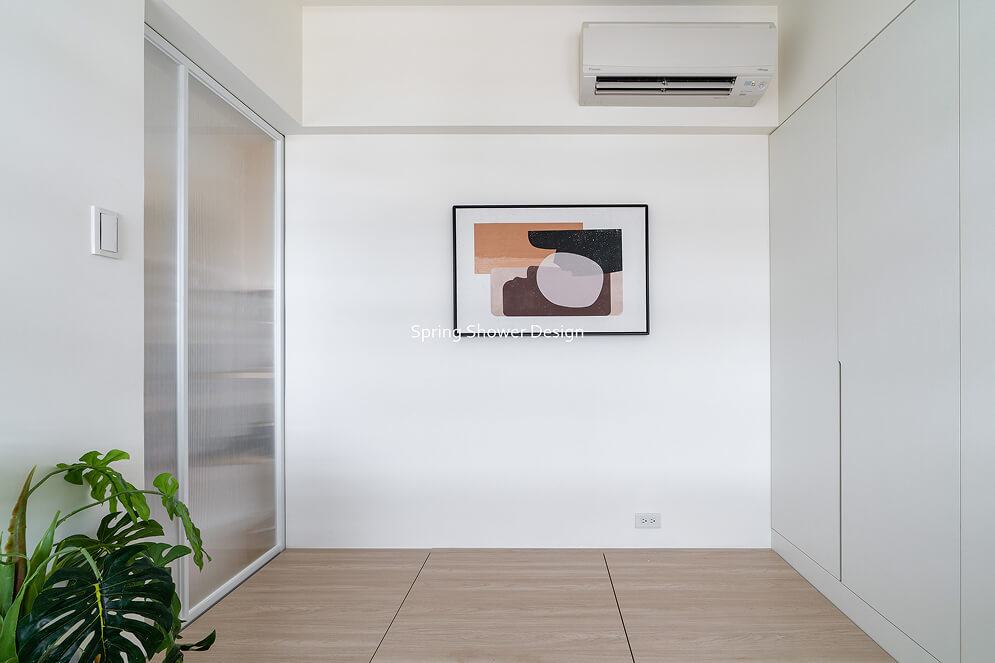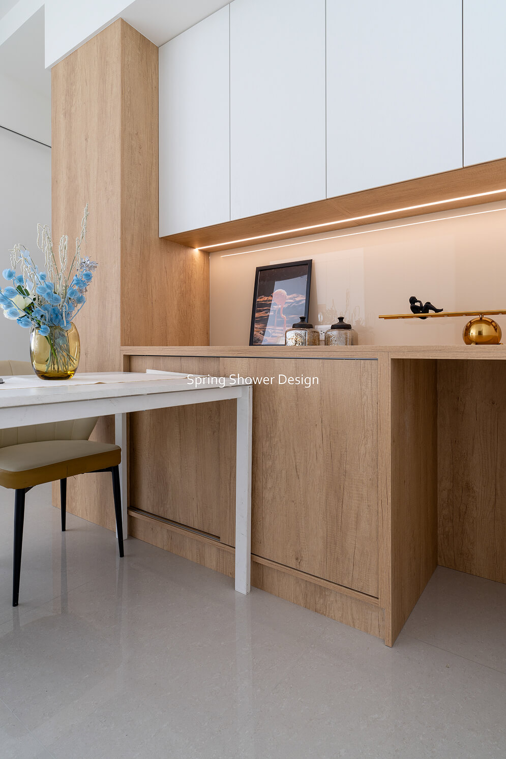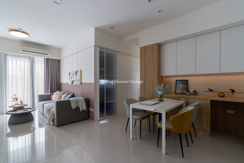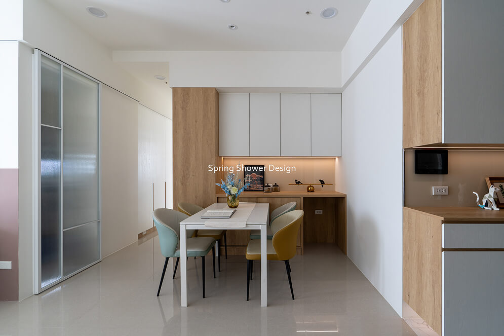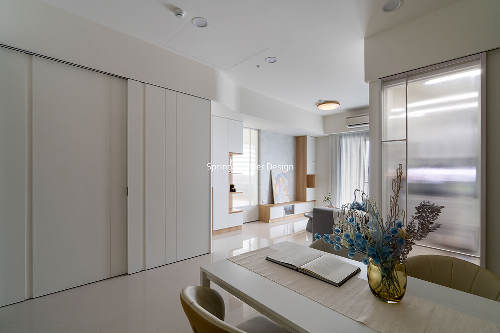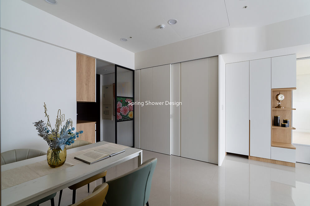 客廳以仿石紋系統板做主牆,結合展示櫃、設備櫃及財位燈光,層次分明。多功能室採架高設計,拉門下方隱藏收納,窗邊臥榻可休憩或閱讀,尖角採斜角處理,兼顧客房功能。餐廳預留6人座餐桌與餐櫃,餐櫃含紅酒冰箱,背板採烤漆玻璃並搭配滑門片設計,並與廚房電器櫃連動,兼顧美觀與收納。小冰柱玻璃拉門引入自然光,增加明亮感。