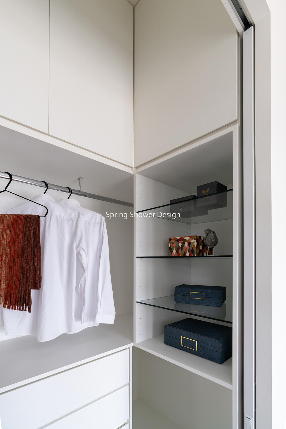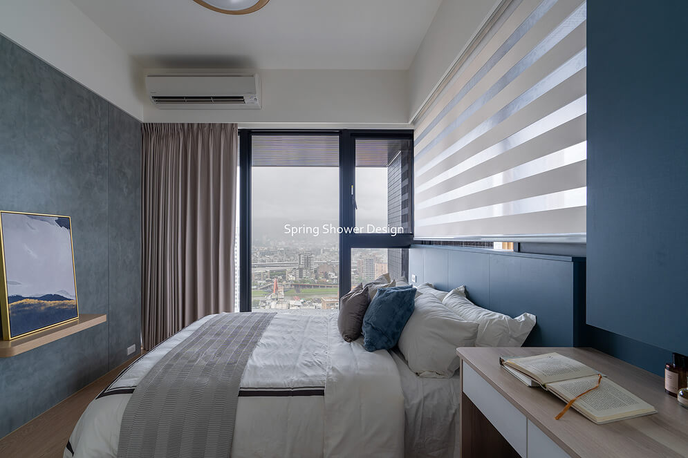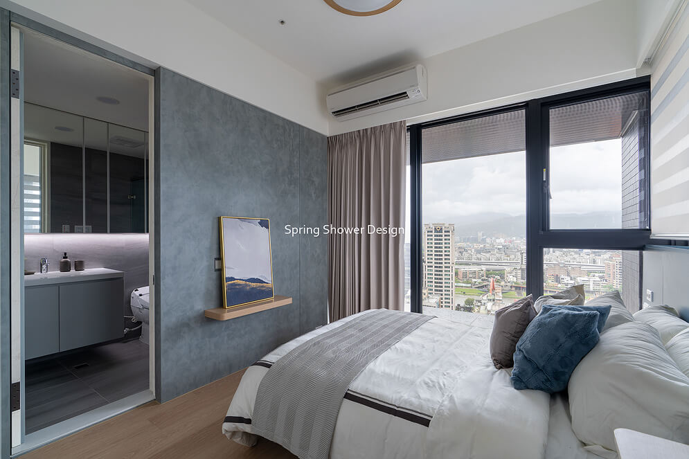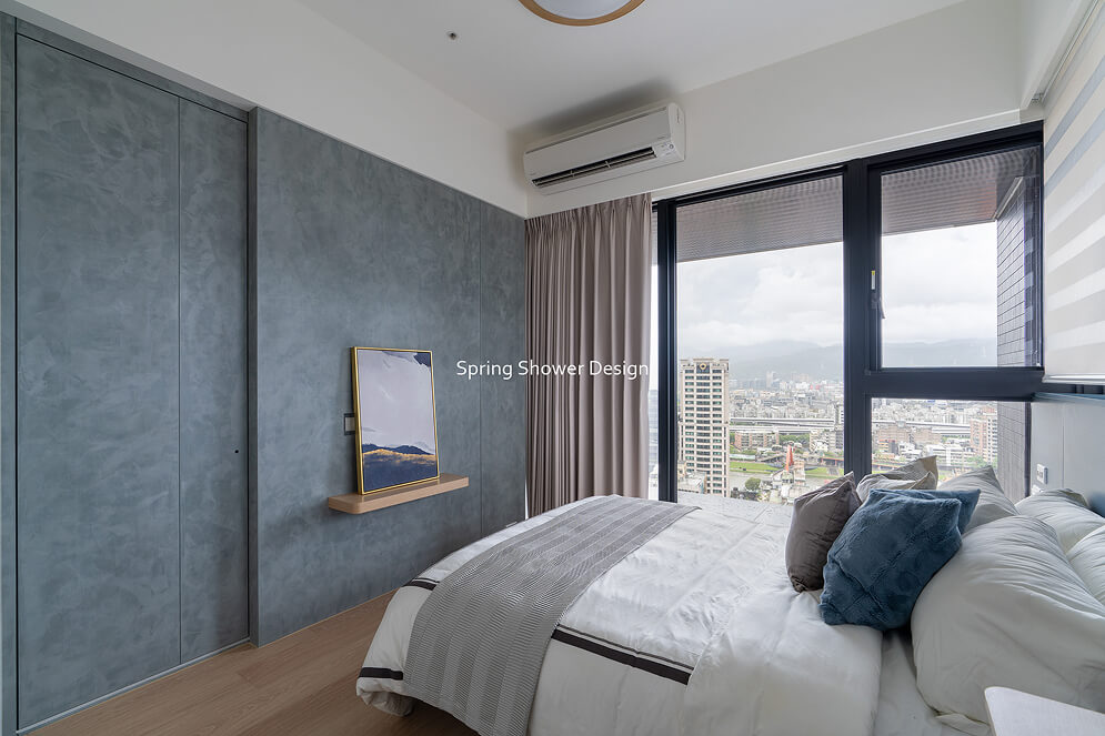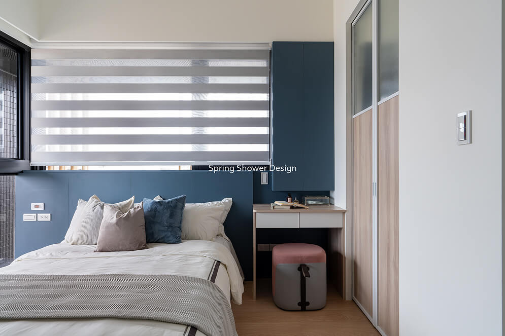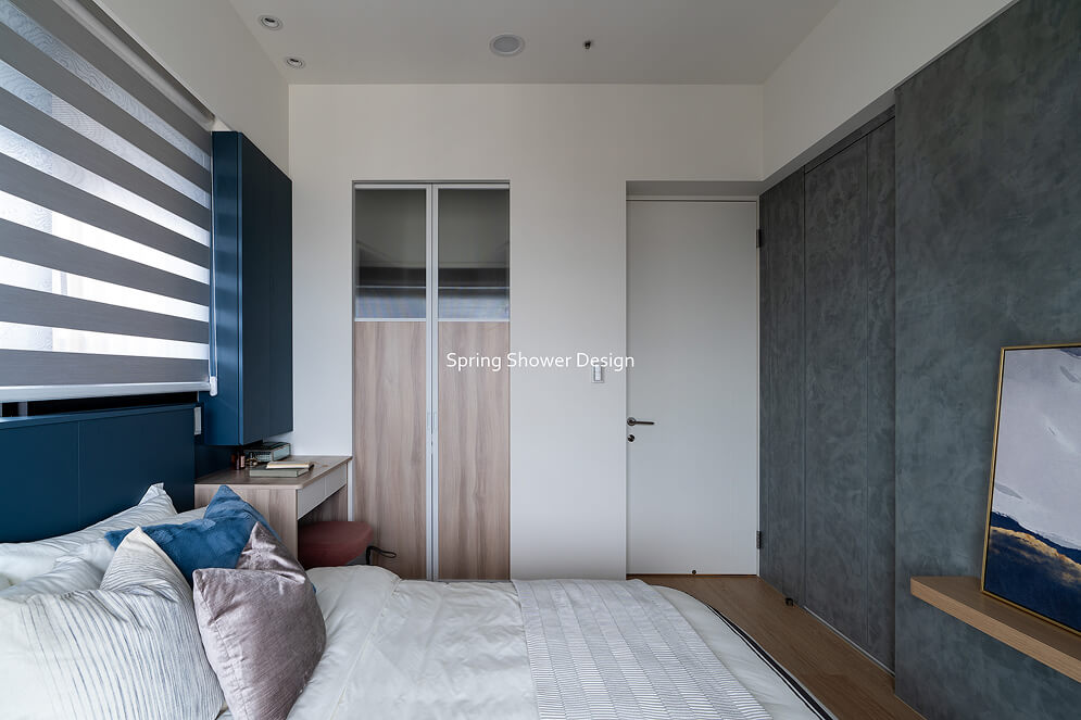 主臥採藏青色布織紋板材,連接化妝桌上櫃做到頂;步入式更衣室採ㄇ字型收納,床尾保留充足走道,手刷塗料牆延伸至主浴室暗門位置。主浴退掉浴缸,以淋浴為主,乾濕區縮放,多出的空間用於走廊高櫃收納。