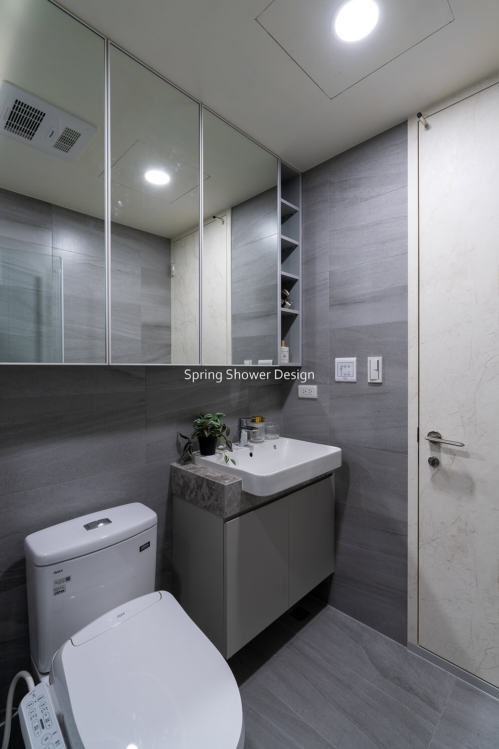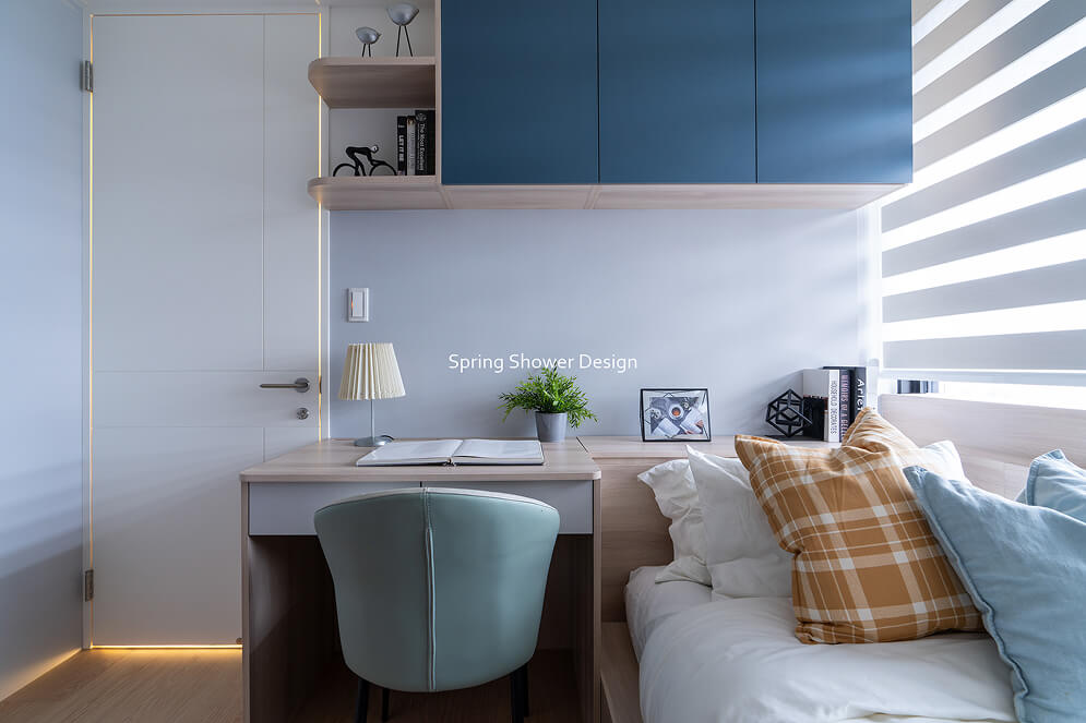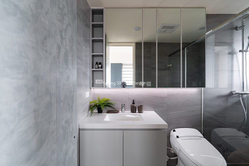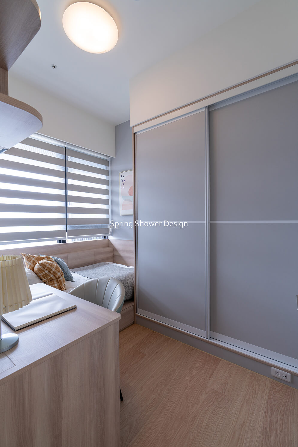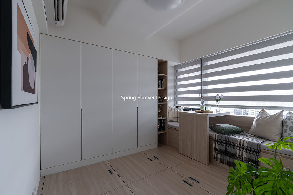 主臥採藏青色布織紋板材,連接化妝桌上櫃做到頂;步入式更衣室採ㄇ字型收納,床尾保留充足走道,手刷塗料牆延伸至主浴室暗門位置。主浴退掉浴缸,以淋浴為主,乾濕區縮放,多出的空間用於走廊高櫃收納。
